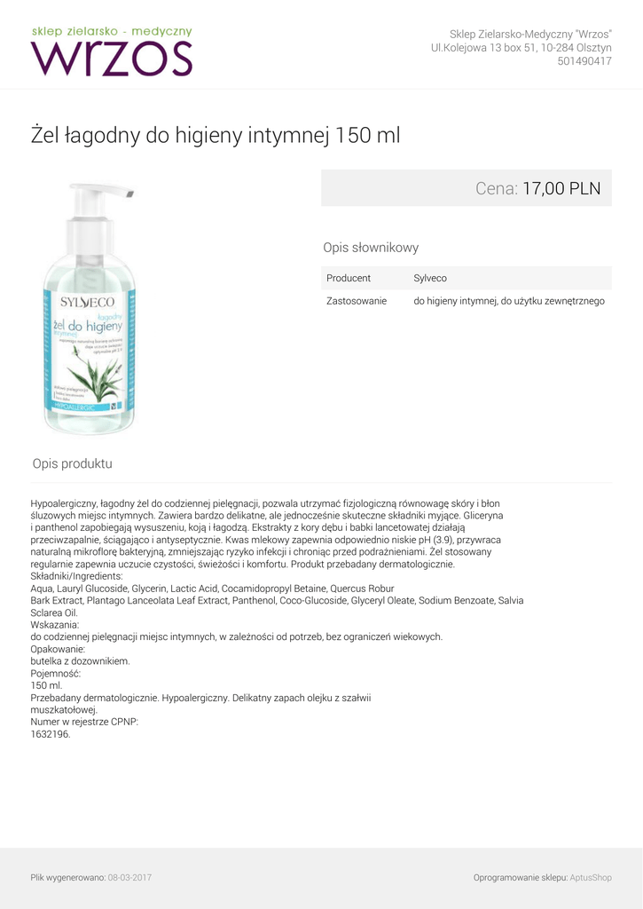 Sklep Zielarsko-Medyczny "Wrzos" Ul.Kolejowa 13 box 51, 10-284 Olsztyn 501490417 Żel łagodny do higieny intymnej 150 ml Cena: 17,00 PLN Opis słownikowy Producent Sylveco Zastosowanie do higieny intymnej, do użytku zewnętrznego Opis produktu Hypoalergiczny, łagodny żel do codziennej pielęgnacji, pozwala utrzymać fizjologiczną równowagę skóry i błon śluzowych miejsc intymnych. Zawiera bardzo delikatne, ale jednocześnie skuteczne składniki myjące. Gliceryna i panthenol zapobiegają wysuszeniu, koją i łagodzą. Ekstrakty z kory dębu i babki lancetowatej działają przeciwzapalnie, ściągająco i antyseptycznie. Kwas mlekowy zapewnia odpowiednio niskie pH (3.9), przywraca naturalną mikroflorę bakteryjną, zmniejszając ryzyko infekcji i chroniąc przed podrażnieniami. Żel stosowany regularnie zapewnia uczucie czystości, świeżości i komfortu. Produkt przebadany dermatologicznie. Składniki/Ingredients: Aqua, Lauryl Glucoside, Glycerin, Lactic Acid, Cocamidopropyl Betaine, Quercus Robur Bark Extract, Plantago Lanceolata Leaf Extract, Panthenol, Coco-Glucoside, Glyceryl Oleate, Sodium Benzoate, Salvia Sclarea Oil. Wskazania: do codziennej pielęgnacji miejsc intymnych, w zależności od potrzeb, bez ograniczeń wiekowych. Opakowanie: butelka z dozownikiem. Pojemność: 150 ml. Przebadany dermatologicznie. Hypoalergiczny. Delikatny zapach olejku z szałwii muszkatołowej. Numer w rejestrze CPNP: 1632196. Plik wygenerowano: 08-03-2017 Powered by TCPDF (www.tcpdf.org) Oprogramowanie sklepu: AptusShop