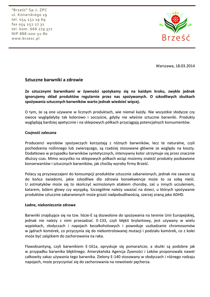 "Brześć" Sp.J. ZPC ul. Konarskiego 19 tel. 054 252 19 69 fax 054 252 27 31 tel. kom. 666 279 3 72 NIP 888-000-51-80 www.brzesc.pl Warszawa, 18.03.2014 Sztuczne barwniki a zdrowie Ze sztucznymi barwnikami w żywności spotykamy się na każdym kroku, zwykle jednak ignorujemy skład produktów regularnie przez nas spożywanych. O szkodliwych skutkach spożywania sztucznych barwników warto jednak wiedzieć więcej. O tym, że są one używane w licznych produktach, wie niemal każdy. Nie wszystkie słodycze czy owoce wyglądałyby tak kolorowo i soczyście, gdyby nie właśnie sztuczne barwniki. Produkty wyglądają bardziej apetycznie i na sklepowych półkach przyciągają potencjalnych konsumentów. Czujność zalecana Producenci wyrobów spożywczych korzystają z różnych barwników, lecz te naturalne, czyli pochodzenia roślinnego lub zwierzęcego, są rzadziej stosowane głównie ze względu na koszty. Dodatkowo w przypadku barwników syntetycznych, intensywny kolor utrzymuje się przez znacznie dłuższy czas. Mimo wszystko na sklepowych półkach wciąż możemy znaleźć produkty pozbawione konserwantów i sztucznych barwników, jak choćby wyroby firmy Brześć. Polacy są przyzwyczajeni do konsumpcji produktów sztucznie zabarwionych, jednak nie zawsze są do końca świadomi, jakie szkodliwe dla zdrowia konsekwencje może to za sobą nieść. U astmatyków może się to skończyć wzmożonym atakiem choroby, zaś u innych uczuleniem, katarem, bólem głowy czy wysypką. Szczególnie należy uważać na dzieci, u których spożywanie produktów sztucznie zabarwionych może grozić nadpobudliwością, szerzej znaną jako ADHD. Ładne, niekoniecznie zdrowe Barwniki znajdujące się na tzw. liście-E są dozwolone do spożywania na terenie Unii Europejskiej, jednak nie należy z nimi przesadzać. E-133, czyli błękit brylantowy, jest używany w wielu wypiekach, słodyczach i napojach bezalkoholowych i powoduje uszkadzanie chromosomów w jądrach komórek, co przyczynia się do niekontrolowanej mutacji i podziału komórek, co z kolei może być zalążkiem do zachorowania na raka. Flawoksantyną, czyli barwnikiem E-161a, opryskuje się pomarańcze, a skutki są podobne jak w przypadku barwnika błękitnego. Amerykańska Agencja Żywności i Leków proponowała nawet całkowity zakaz używania tego barwnika. Zielony E-140 stosowany w słodyczach i różnego rodzaju napojach, może przyczyniać się do zachorowania na nowotwór pęcherza. "Brześć" Sp.J. ZPC ul. Konarskiego 19 tel. 054 252 19 69 fax 054 252 27 31 tel. kom. 666 279 3 72 NIP 888-000-51-80 www.brzesc.pl Barwnik czerwony E-122, zawierający m.in. azorubinę, używany chociażby w wiśniowych nadzieniach czy lodach, jest powiązany z uszkadzaniem nerwów i rakiem tarczycy, z kolei barwniki żółte, które możemy znaleźć w niektórych serach, wędlinach, pieczywie czy żelatynie, mogą powodować guzy nadnerczy i nerek, uszkodzenia chromosomów, a w Norwegii i Szwecji zabroniono nawet ich używania. Lista szkodliwych barwników, konserwantów, czy zagęszczaczy jest jednak o wiele dłuższa. Przeciętnemu konsumentowi byłoby ciężko całkowicie zrezygnować ze spożywania produktów sztucznie zabarwionych, jednak można je chociaż ograniczyć, lub wybierać te z krótszą listą E na opakowaniu. Wystarczy nieco więcej uwagi przy sięganiu po dany produkt ze sklepowej półki i uwrażliwienie na te bardziej szkodliwe. Na dłuższą metę może to mieć zbawienny wpływ dla naszego zdrowia. ___ "Brześć" Sp.J. ZPC - Rodzinna firma istniejąca od 1984 roku. Brześć specjalizuje się w tradycyjnych, opartych na domowych recepturach wyrobów cukierniczych. Produkty Brześcia są sprzedawane poprzez przedstawicieli i dystrybutorów na terenie całej Polski.