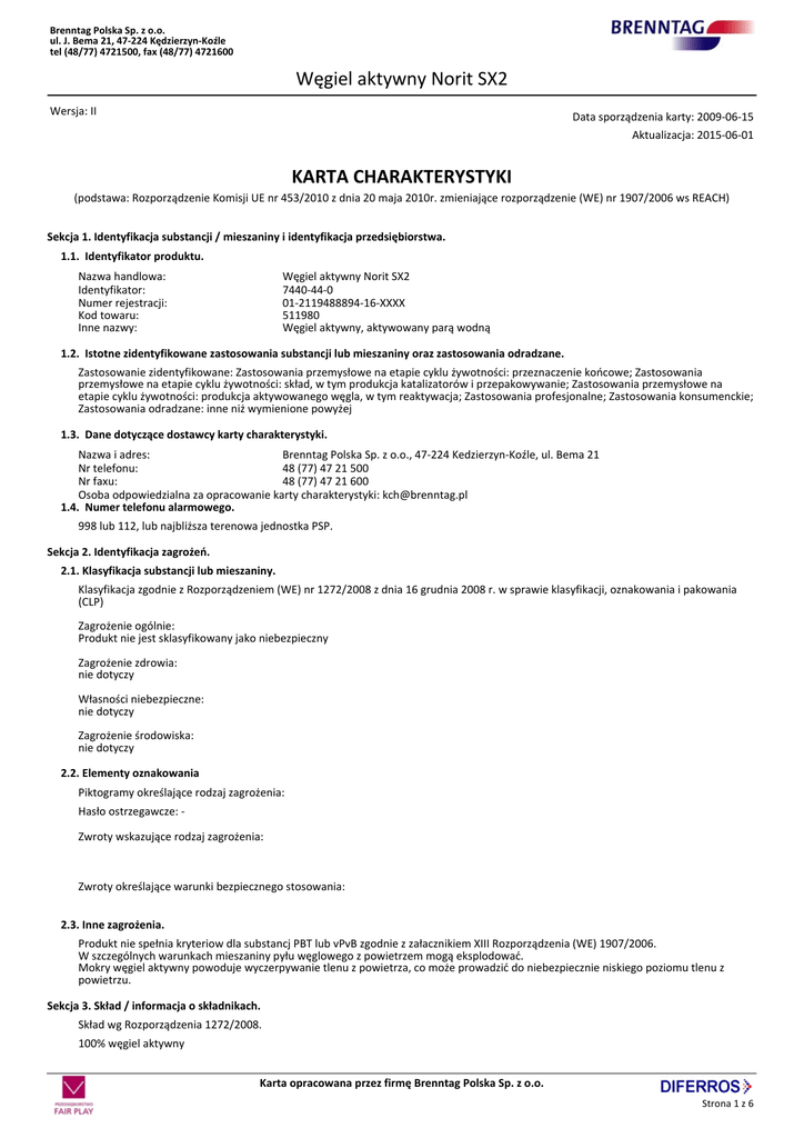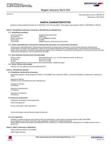 Brenntag Polska Sp. z o.o. ul. J. Bema 21, 47-224 Kędzierzyn-Koźle tel (48/77) 4721500, fax (48/77) 4721600 Węgiel aktywny Norit SX2 Wersja: II Data sporządzenia karty: 2009-06-15 Aktualizacja: 2015-06-01 KARTA CHARAKTERYSTYKI (podstawa: Rozporządzenie Komisji UE nr 453/2010 z dnia 20 maja 2010r. zmieniające rozporządzenie (WE) nr 1907/2006 ws REACH) Sekcja 1. Identyfikacja substancji / mieszaniny i identyfikacja przedsiębiorstwa. 1.1. Identyfikator produktu. Nazwa handlowa: Identyfikator: Numer rejestracji: Kod towaru: Inne nazwy: Węgiel aktywny Norit SX2 7440-44-0 01-2119488894-16-XXXX 511980 Węgiel aktywny, aktywowany parą wodną 1.2. Istotne zidentyfikowane zastosowania substancji lub mieszaniny oraz zastosowania odradzane. Zastosowanie zidentyfikowane: Zastosowania przemysłowe na etapie cyklu żywotności: przeznaczenie końcowe; Zastosowania przemysłowe na etapie cyklu żywotności: skład, w tym produkcja katalizatorów i przepakowywanie; Zastosowania przemysłowe na etapie cyklu żywotności: produkcja aktywowanego węgla, w tym reaktywacja; Zastosowania profesjonalne; Zastosowania konsumenckie; Zastosowania odradzane: inne niż wymienione powyżej 1.3. Dane dotyczące dostawcy karty charakterystyki. Nazwa i adres: Brenntag Polska Sp. z o.o., 47-224 Kedzierzyn-Koźle, ul. Bema 21 Nr telefonu: 48 (77) 47 21 500 Nr faxu: 48 (77) 47 21 600 Osoba odpowiedzialna za opracowanie karty charakterystyki: [email protected] 1.4. Numer telefonu alarmowego. 998 lub 112, lub najbliższa terenowa jednostka PSP. Sekcja 2. Identyfikacja zagrożeń. 2.1. Klasyfikacja substancji lub mieszaniny. Klasyfikacja zgodnie z Rozporządzeniem (WE) nr 1272/2008 z dnia 16 grudnia 2008 r. w sprawie klasyfikacji, oznakowania i pakowania (CLP) Zagrożenie ogólnie: Produkt nie jest sklasyfikowany jako niebezpieczny Zagrożenie zdrowia: nie dotyczy Własności niebezpieczne: nie dotyczy Zagrożenie środowiska: nie dotyczy 2.2. Elementy oznakowania Piktogramy określające rodzaj zagrożenia: Hasło ostrzegawcze: Zwroty wskazujące rodzaj zagrożenia: Zwroty określające warunki bezpiecznego stosowania: 2.3. Inne zagrożenia. Produkt nie spełnia kryteriow dla substancj PBT lub vPvB zgodnie z załacznikiem XIII Rozporządzenia (WE) 1907/2006. W szczególnych warunkach mieszaniny pyłu węglowego z powietrzem mogą eksplodować. Mokry węgiel aktywny powoduje wyczerpywanie tlenu z powietrza, co może prowadzić do niebezpiecznie niskiego poziomu tlenu z powietrzu. Sekcja 3. Skład / informacja o składnikach. Skład wg Rozporządzenia 1272/2008. 100% węgiel aktywny Karta opracowana przez firmę Brenntag Polska Sp. z o.o. Strona 1 z 6 Brenntag Polska Sp. z o.o. ul. J. Bema 21, 47-224 Kędzierzyn-Koźle tel (48/77) 4721500, fax (48/77) 4721600 Węgiel aktywny Norit SX2 Nr CAS: 7440-44-0 Nr indeksowy: nie dotyczy Nr WE: 931-328-0 Sekcja 4. Środki pierwszej pomocy. 4.1. Opis środków pierwszej pomocy. Wdychanie: W razie wdychania pyłu wyprowadzić poszkodowanego na świeże powietrze, zapewnić odpoczynek. Kontakt ze skórą: Zdjąć zanieczyszczoną odzież. W razie kontaktu ze skórą zmyć dużą ilością wody z mydłem. Kontakt z oczami: W razie kontaktu z oczami natychmiast przepłukać dużą ilością wody. W razie wystąpienia objawów podrażnienia zapewnić pomoc medyczną. Spożycie: W razie spożycia wypłukać usta, wypić dużą ilość wody. Zapewnić pomoc medyczną 4.2. Najważniejsze ostre i opóźnione objawy oraz skutki narażenia. Pyły mogą powodować mechaniczne podrażnienie oczu, skóry, błon śluzowych. 4.3. Wskazania dotyczące wszelkiej natychmiastowej pomocy lekarskiej i szczególnego postępowania z poszkodowanym. brak specyficznych wymagań Sekcja 5. Postępowanie w przypadku pożaru. 5.1. Środki gaśnicze. rozpylona woda 5.2. Szczególne zagrożenia związane z substancją lub mieszaniną. Produkty spalania zawierają tlenki węgla i dwutlenki węgla. Pyły produktu mogą tworzyć z powietrzem mieszaninę wybuchową. 5.3. Informacje dla straży pożarnej. Stosować niezależny aparat oddechowy Sekcja 6. Postępowanie w przypadku niezamierzonego uwolnienia do środowiska. 6.1. Indywidualne środki ostrożności, wyposażenie ochronne i procedury w sytuacjach awaryjnych. Załozyć sprzęt ochrony osobistej - maska z filtrem typ P2, rękawice ochronne. Unikać wzniecania pyłu 6.2. Środki ostrożności w zakresie ochrony środowiska. Zapobiec rozprzestrzenianiu lub dostaniu do kanalizacji, rowów, rzek. 6.3. Metody i materiały zapobiegające rozprzestrzenianiu się skażenia i służące do usuwania skażenia. Zebrać mechanicznie do odpowiedniego zamykanego pojemnika i przekazać do zniszczenia 6.4. Odniesienia do innych sekcji. Usuwać zgodnie z zaleceniami przedstawionymi w sekcji 13 Sekcja 7. Postępowanie z substancjami i mieszaninami oraz ich magazynowanie. 7.1. Środki ostrożności dotyczące bezpiecznego postępowania. Unikać rozpylania produktu. Nie stosowac w pobliżu otwartego ognia i innych źródeł zapłonu. Zapoznać się z wymaganiami dyrektywy 1999/92/EC. 7.2. Warunki bezpiecznego magazynowania, łącznie z informacjami dotyczącymi wszelkich wzajemnych niezgodności. Przechowywać w zamkniętych opakowaniach w suchym miejscu. z dala od substancji utleniających, olejów nienasyconych, soli metali, źródeł ciepła i zapłonu. Chronić przed bezpośrednim nasłonecznienim. Przechowywać w temperaturze < 50°C i wilgotności względnej < 70%. 7.3. Szczególne zastosowania końcowe. brak dostępnych danych Sekcja 8. Kontrola narażenia / środki ochrony indywidualnej. 8.1. Parametry dotyczące kontroli. Wartości DNEL Karta opracowana przez firmę Brenntag Polska Sp. z o.o. Strona 2 z 6 Brenntag Polska Sp. z o.o. ul. J. Bema 21, 47-224 Kędzierzyn-Koźle tel (48/77) 4721500, fax (48/77) 4721600 Węgiel aktywny Norit SX2 -pracownicy: narażenie długotrwałe przez drogi oddechowe: 3 mg/m3 -konsumenci: narażenie długotrwałe przez drogi oddechowe: 0