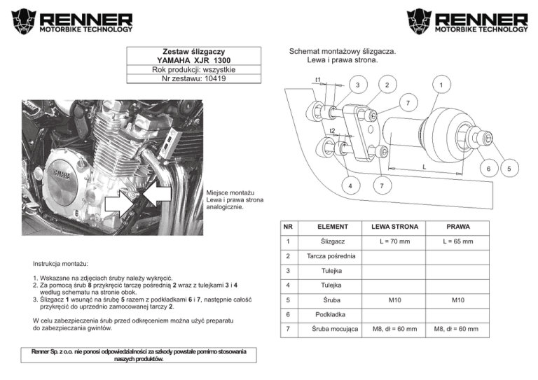 Zestaw œlizgaczy YAMAHA XJR 1300 Rok produkcji: wszystkie Nr zestawu: 10419 Schemat monta¿owy œlizgacza. Lewa i prawa strona. t1 2 3 1 7 t2 L 4 6 7 Miejsce monta¿u Lewa i prawa strona analogicznie. NR ELEMENT LEWA STRONA PRAWA 1 Œlizgacz L = 70 mm L = 65 mm 2 Tarcza poœrednia 3 Tulejka 4 Tulejka 5 Œruba M10 M10 6 Podk³adka M8, d³ = 60 mm M8, d³ = 60 mm Instrukcja monta¿u: 1. Wskazane na zdjêciach œruby nale¿y wykrêciæ. 2. Za pomoc¹ œrub 8 przykrêciæ tarczê poœredni¹ 2 wraz z tulejkami 3 i 4 wed³ug schematu na stronie obok. 3. Œlizgacz 1 wsun¹æ na œrubê 5 razem z podk³adkami 6 i 7, nastêpnie ca³oœæ przykrêciæ do uprzednio zamocowanej tarczy 2. W celu zabezpieczenia œrub przed odkrêceniem mo¿na u¿yæ preparatu do zabezpieczania gwintów. Renner Sp. z o.o. nie ponosi odpowiedzialnoœci za szkody powsta³e pomimo stosowania naszych produktów. 7 Œruba mocuj¹ca 5