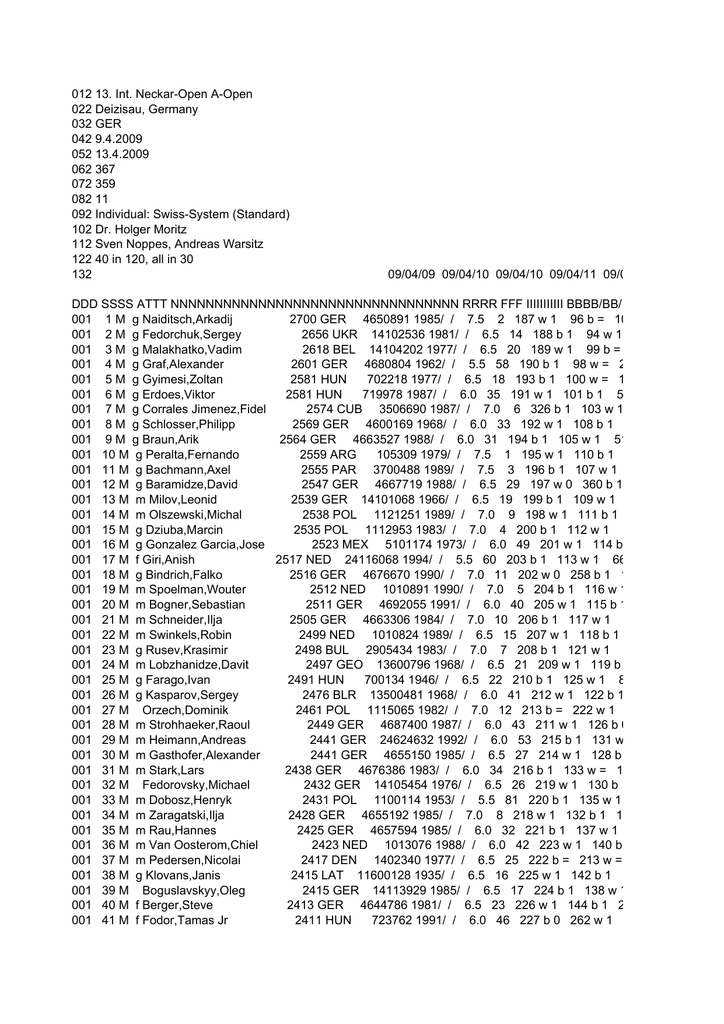 012 13. Int. Neckar-Open A-Open 022 Deizisau, Germany 032 GER 042 9.4.2009 052 13.4.2009 062 367 072 359 082 11 092 Individual: Swiss-System (Standard) 102 Dr. Holger Moritz 112 Sven Noppes, Andreas Warsitz 122 40 in 120, all in 30 132 09/04/09 09/04/10 09/04/10 09/04/11 09/0 DDD SSSS ATTT NNNNNNNNNNNNNNNNNNNNNNNNNNNNNNNNN RRRR FFF IIIIIIIIIII BBBB/BB/ 001 1 M g Naiditsch,Arkadij 2700 GER 4650891 1985/ / 7.5 2 187 w 1 96 b = 10 001 2 M g Fedorchuk,Sergey 2656 UKR 14102536 1981/ / 6.5 14 188 b 1 94 w 1 001 3 M g Malakhatko,Vadim 2618 BEL 14104202 1977/ / 6.5 20 189 w 1 99 b = 001 4 M g Graf,Alexander 2601 GER 4680804 1962/ / 5.5 58 190 b 1 98 w = 2 001 5 M g Gyimesi,Zoltan 2581 HUN 702218 1977/ / 6.5 18 193 b 1 100 w = 1 001 6 M g Erdoes,Viktor 2581 HUN 719978 1987/ / 6.0 35 191 w 1 101 b 1 5 001 7 M g Corrales Jimenez,Fidel 2574 CUB 3506690 1987/ / 7.0 6 326 b 1 103 w 1 001 8 M g Schlosser,Philipp 2569 GER 4600169 1968/ / 6.0 33 192 w 1 108 b 1 001 9 M g Braun,Arik 2564 GER 4663527 1988/ / 6.0 31 194 b 1 105 w 1 51 001 10 M g Peralta,Fernando 2559 ARG 105309 1979/ / 7.5 1 195 w 1 110 b 1 001 11 M g Bachmann,Axel 2555 PAR 3700488 1989/ / 7.5 3 196 b 1 107 w 1 001 12 M g Baramidze,David 2547 GER 4667719 1988/ / 6.5 29 197 w 0 360 b 1 001 13 M m Milov,Leonid 2539 GER 14101068 1966/ / 6.5 19 199 b 1 109 w 1 001 14 M m Olszewski,Michal 2538 POL 1121251 1989/ / 7.0 9 198 w 1 111 b 1 001 15 M g Dziuba,Marcin 2535 POL 1112953 1983/ / 7.0 4 200 b 1 112 w 1 001 16 M g Gonzalez Garcia,Jose 2523 MEX 5101174 1973/ / 6.0 49 201 w 1 114 b 001 17 M f Giri,Anish 2517 NED 24116068 1994/ / 5.5 60 203 b 1 113 w 1 66 001 18 M g Bindrich,Falko 2516 GER 4676670 1990/ / 7.0 11 202 w 0 258 b 1 1 001 19 M m Spoelman,Wouter 2512 NED 1010891 1990/ / 7.0 5 204 b 1 116 w 1 001 20 M m Bogner,Sebastian 2511 GER 4692055 1991/ / 6.0 40 205 w 1 115 b 1 001 21 M m Schneider,Ilja 2505 GER 4663306 1984/ / 7.0 10 206 b 1 117 w 1 001 22 M m Swinkels,Robin 2499 NED 1010824 1989/ / 6.5 15 207 w 1 118 b 1 001 23 M g Rusev,Krasimir 2498 BUL 2905434 1983/ / 7.0 7 208 b 1 121 w 1 001 24 M m Lobzhanidze,Davit 2497 GEO 13600796 1968/ / 6.5 21 209 w 1 119 b 001 25 M g Farago,Ivan 2491 HUN 700134 1946/ / 6.5 22 210 b 1 125 w 1 8 001 26 M g Kasparov,Sergey 2476 BLR 13500481 1968/ / 6.0 41 212 w 1 122 b 1 001 27 M Orzech,Dominik 2461 POL 1115065 1982/ / 7.0 12 213 b = 222 w 1 001 28 M m Strohhaeker,Raoul 2449 GER 4687400 1987/ / 6.0 43 211 w 1 126 b 0 001 29 M m Heimann,Andreas 2441 GER 24624632 1992/ / 6.0 53 215 b 1 131 w 001 30 M m Gasthofer,Alexander 2441 GER 4655150 1985/ / 6.5 27 214 w 1 128 b 001 31 M m Stark,Lars 2438 GER 4676386 1983/ / 6.0 34 216 b 1 133 w = 1 001 32 M Fedorovsky,Michael 2432 GER 14105454 1976/ / 6.5 26 219 w 1 130 b 001 33 M m Dobosz,Henryk 2431 POL 1100114 1953/ / 5.5 81 220 b 1 135 w 1 001 34 M m Zaragatski,Ilja 2428 GER 4655192 1985/ / 7.0 8 218 w 1 132 b 1 1 001 35 M m Rau,Hannes 2425 GER 4657594 1985/ / 6.0 32 221 b 1 137 w 1 001 36 M m Van Oosterom,Chiel 2423 NED 1013076 1988/ / 6.0 42 223 w 1 140 b 001 37 M m Pedersen,Nicolai 2417 DEN 1402340 1977/ / 6.5 25 222 b = 213 w = 001 38 M g Klovans,Janis 2415 LAT 11600128 1935/ / 6.5 16 225 w 1 142 b 1 001 39 M Boguslavskyy,Oleg 2415 GER 14113929 1985/ / 6.5 17 224 b 1 138 w 1 001 40 M f Berger,Steve 2413 GER 4644786 1981/ / 6.5 23 226 w 1 144 b 1 2 001 41 M f Fodor,Tamas Jr 2411 HUN 723762 1991/ / 6.0 46 227 b 0 262 w 1 001 001 001 001 001 001 001 001 001 001 001 001 001 001 001 001 001 001 001 001 001 001 001 001 001 001 001 001 001 001 001 001 001 001 001 001 001 001 001 001 001 001 001 001 001 001 001 001 001 001 001 001 001 001 001 001 42 M f Hirneise,Tobias 2407 GER 24600881 1989/ / 6.5 24 228 w 1 146 b 1 43 M m Eisenbeiser,Amadeus 2406 GER 4678338 1987/ / 5.0 123 230 b 1 143 44 M f Becking,Stephan 2400 GER 4632478 1979/ / 6.0 36 229 w 1 150 b 1 45 M f Ringoir,Tanguy 2398 BEL 208027 1994/ / 5.0 103 231 b 1 145 w = 1 46 M m Pitl,Gregory 2396 GER 4651693 1982/ / 5.0 102 232 w 1 152 b 1 47 M f Schmidt,Georg 2394 GER 4636899 1976/ / 5.5 90 233 b 1 149 w 0 48 M m Thinius,Marco 2391 GER 4613112 1968/ / 6.5 28 234 w 1 154 b 0 49 W wg Zozulia,Anna 2371 BEL 14102110 1980/ / 5.5 96 235 b 0 263 w 1 50 M m Banas,Jan 2370 SVK 14900076 1947/ / 5.0 108 176 b 1 93 w 1 51 M f Miedema,Roi 2370 NED 1018477 1989/ / 7.0 13 174 w 1 156 b 1 52 M f Grimberg,Boris 2366 GER 4697499 1988/ / 5.5 72 236 w 1 158 b 0 53 M f Koepke,Christian 2364 GER 4655737 1984/ / 6.0 37 237 b 1 151 w 1 54 M f Burg,Twan 2362 NED 1010697 1990/ / 6.0 30 238 w 1 160 b 1 1 55 M f Rudolf,Henrik 2360 GER 4622723 1974/ / 5.5 84 239 b 1 159 w 0 1 56 M f Koenig,Dietrich 2357 GER 4602323 1964/ / 0.5 364 240 w = 241 b 0 57 M f Jorczik,Julian 2354 GER 24611719 1992/ / 6.0 39 242 b 1 163 w 1 1 58 M Michielsen,Joost 2352 NED 1008790 1987/ / 5.5 77 244 w = 240 b = 59 M f Pfrommer,Christoph 2351 GER 4603290 1965/ / 5.0 104 89 b 0 266 w 1 60 M f van Kampen,Robin Oscar 2348 NED 1020854 1994/ / 0.5 363 246 w = 244 61 M f Trella,Thomas 2347 GER 24620513 1987/ / 6.0 45 245 b 1 169 w = 62 M f Bok,Benjamin 2346 NED 1017063 1995/ / 5.5 92 249 w 1 161 b 1 63 M f Schmitzer,Klaus 2342 GER 4601971 1965/ / 5.5 85 247 b 1 171 w = 64 M f Postojev,Alexander 2337 GER 4672186 1986/ / 6.0 52 248 w 1 166 b 1 65 M f Braun,Christian 2333 GER 4692098 1986/ / 5.5 71 250 b 1 173 w 1 66 M f Deglmann,Ludwig 2329 GER 4622235 1977/ / 5.5 76 251 w 1 168 b 1 67 M Strunski,Andreas 2329 GER 24606073 1992/ / 6.0 50 252 b 1 179 w 0 68 M f Vuckovic,Aleksandar 2326 GER 4615948 1973/ / 5.0 122 253 w = 246 b 69 M f Gergacz,Attila 2323 HUN 730157 1990/ / 5.5 59 254 b 1 181 w 1 2 70 M f Ortmann,David 2321 GER 4651588 1983/ / 6.0 54 255 w 1 170 b = 71 M f Kleijn,Christov 2320 NED 1013564 1991/ / 6.0 47 257 b 1 186 w 0 20 72 M Abel,Dennes 2319 GER 24605417 1989/ / 6.0 51 256 w 1 180 b 1 73 M f Heinz,Timothee 2315 FRA 623369 1989/ / 5.5 69 259 b 1 227 w = 1 74 M f Schuh,Dirk 2313 GER 4655311 1979/ / 5.0 136 258 w 1 184 b = 1 75 M f Terekhov,Andrey 2312 RUS 412