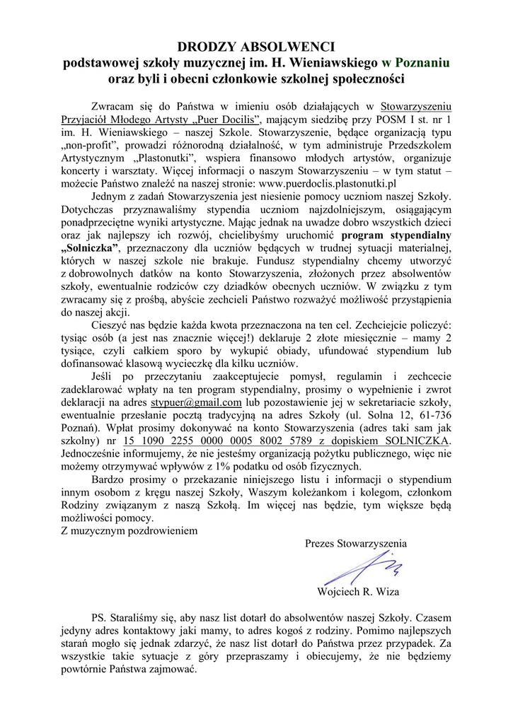 DRODZY ABSOLWENCI podstawowej szkoły muzycznej im. H. Wieniawskiego w Poznaniu oraz byli i obecni członkowie szkolnej społeczności Zwracam się do Państwa w imieniu osób działających w Stowarzyszeniu Przyjaciół Młodego Artysty „Puer Docilis”, mającym siedzibę przy POSM I st. nr 1 im. H. Wieniawskiego – naszej Szkole. Stowarzyszenie, będące organizacją typu „non-profit”, prowadzi różnorodną działalność, w tym administruje Przedszkolem Artystycznym „Plastonutki”, wspiera finansowo młodych artystów, organizuje koncerty i warsztaty. Więcej informacji o naszym Stowarzyszeniu – w tym statut – możecie Państwo znaleźć na naszej stronie: www.puerdoclis.plastonutki.pl Jednym z zadań Stowarzyszenia jest niesienie pomocy uczniom naszej Szkoły. Dotychczas przyznawaliśmy stypendia uczniom najzdolniejszym, osiągającym ponadprzeciętne wyniki artystyczne. Mając jednak na uwadze dobro wszystkich dzieci oraz jak najlepszy ich rozwój, chcielibyśmy uruchomić program stypendialny „Solniczka”, przeznaczony dla uczniów będących w trudnej sytuacji materialnej, których w naszej szkole nie brakuje. Fundusz stypendialny chcemy utworzyć z dobrowolnych datków na konto Stowarzyszenia, złożonych przez absolwentów szkoły, ewentualnie rodziców czy dziadków obecnych uczniów. W związku z tym zwracamy się z prośbą, abyście zechcieli Państwo rozważyć możliwość przystąpienia do naszej akcji. Cieszyć nas będzie każda kwota przeznaczona na ten cel. Zechciejcie policzyć: tysiąc osób (a jest nas znacznie więcej!) deklaruje 2 złote miesięcznie – mamy 2 tysiące, czyli całkiem sporo by wykupić obiady, ufundować stypendium lub dofinansować klasową wycieczkę dla kilku uczniów. Jeśli po przeczytaniu zaakceptujecie pomysł, regulamin i zechcecie zadeklarować wpłaty na ten program stypendialny, prosimy o wypełnienie i zwrot deklaracji na adres [email protected] lub pozostawienie jej w sekretariacie szkoły, ewentualnie przesłanie pocztą tradycyjną na adres Szkoły (ul. Solna 12, 61-736 Poznań). Wpłat prosimy dokonywać na konto Stowarzyszenia (adres taki sam jak szkolny) nr 15 1090 2255 0000 0005 8002 5789 z dopiskiem SOLNICZKA. Jednocześnie informujemy, że nie jesteśmy organizacją pożytku publicznego, więc nie możemy otrzymywać wpływów z 1% podatku od osób fizycznych. Bardzo prosimy o przekazanie niniejszego listu i informacji o stypendium innym osobom z kręgu naszej Szkoły, Waszym koleżankom i kolegom, członkom Rodziny związanym z naszą Szkołą. Im więcej nas będzie, tym większe będą możliwości pomocy. Z muzycznym pozdrowieniem Prezes Stowarzyszenia Wojciech R. Wiza PS. Staraliśmy się, aby nasz list dotarł do absolwentów naszej Szkoły. Czasem jedyny adres kontaktowy jaki mamy, to adres kogoś z rodziny. Pomimo najlepszych starań mogło się jednak zdarzyć, że nasz list dotarł do Państwa przez przypadek. Za wszystkie takie sytuacje z góry przepraszamy i obiecujemy, że nie będziemy powtórnie Państwa zajmować.