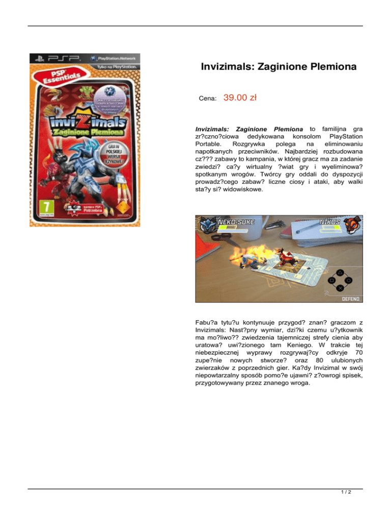Invizimals: Zaginione Plemiona Cena: 39.00 zł Invizimals: Zaginione Plemiona to familijna gra zr?czno?ciowa dedykowana konsolom PlayStation Portable. Rozgrywka polega na eliminowaniu napotkanych przeciwników. Najbardziej rozbudowana cz??? zabawy to kampania, w której gracz ma za zadanie zwiedzi? ca?y wirtualny ?wiat gry i wyeliminowa? spotkanym wrogów. Twórcy gry oddali do dyspozycji prowadz?cego zabaw? liczne ciosy i ataki, aby walki sta?y si? widowiskowe. Fabu?a tytu?u kontynuuje przygod? znan? graczom z Invizimals: Nast?pny wymiar, dzi?ki czemu u?ytkownik ma mo?liwo?? zwiedzenia tajemniczej strefy cienia aby uratowa? uwi?zionego tam Keniego. W trakcie tej niebezpiecznej wyprawy rozgrywaj?cy odkryje 70 zupe?nie nowych stworze? oraz 80 ulubionych zwierzaków z poprzednich gier. Ka?dy Invizimal w swój niepowtarzalny sposób pomo?e ujawni? z?owrogi spisek, przygotowywany przez znanego wroga. 1/2 Za zwyci?stwo przyznawane s? cenne Waty, cenna waluta za któr? mo?na trenowa? Invizimale i przeistoczy? je dzi?ki temu w bestie bojowe. Je?eli gracz ma ochot? na now? zabaw?, mo?e rozpocz?? ca?kowicie now? przygod? steruj? poczynaniami Jazmin lub Alexa. Zobacz wideo: 2/2 Powered by TCPDF (www.tcpdf.org)