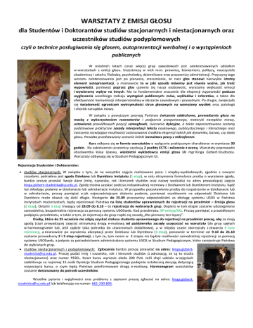 WARSZTATY Z EMISJI GŁOSU dla Studentów i Doktorantów studiów stacjonarnych i niestacjonarnych oraz uczestników studiów podyplomowych czyli o technice posługiwania się głosem, autoprezentacji werbalnej i o wystąpieniach publicznych W ostatnich latach coraz więcej grup zawodowych jest zainteresowanych udziałem w warsztatach z emisji głosu. Uczestniczą w nich m.in. prawnicy, biznesmeni, politycy, nauczyciele akademiccy i szkolni, filolodzy, psycholodzy, dziennikarze oraz pracownicy administracji. Przyczyną tego wzrostu zainteresowania jest po pierwsze, zrozumienie, że nasz głos stanowi niezwykle istotny element autoprezentacji, a mianowicie to w jaki sposób mówimy jest równie ważne, jak treść wypowiedzi, ponieważ poprzez głos ujawnia się nasza osobowość, wyrażamy większość emocji i wywieramy wpływ na innych. Ma to fundamentalne znaczenie dla ekspresji wypowiedzi podczas wygłaszania wszelkiego rodzaju wystąpień publicznych: mów, wykładów i referatów, a także dla efektywności komunikacji interpersonalnej w obszarze zawodowym i prywatnym. Po drugie, zwiększyła się świadomość ograniczeń wytrzymałości strun głosowych na wzmożony wysiłek oraz patologii i chorób narządów mowy. W związku z powyższym poznają Państwo ćwiczenia oddechowe, prowadzenia głosu na maskę z wykorzystaniem rezonatorów i podparcia przeponowego, motoryki narządów mowy, ustawienia prawidłowych pozycji samogłosek, ćwiczenia dykcyjne, a także zaprezentowane zostaną podstawowe praktyczne zasady interpretacji tekstu naukowego, publicystycznego i literackiego oraz ćwiczenia rozwijające możliwości zastosowania środków ekspresji takich jak dynamika, barwa, czy skala głosu. Ponadto przedstawiony zostanie krótki instruktarz pracy z mikrofonem. Kurs odbywa się w formie warsztatów o wyłącznie praktycznym charakterze w wymiarze 30 godzin. Na zakończenie uczestnicy uzyskują 2 punkty ECTS i zaliczenie z oceną. Warsztaty poprowadzi absolwentka klasy śpiewu, wieloletni wykładowca emisji głosu UJ mgr Kinga Gizbert-Studnicka. Warsztaty odbywają się w Studium Pedagogicznym UJ. Rejestracja Studentów i Doktorantów: • studiów stacjonarnych: W związku z tym, że na wszystkie zajęcia realizowane poza- i między-wydziałowych, zgodnie z nowymi zasadami, potrzebna jest zgoda Dziekana lub Dyrektora Instytutu (1 etap), w celu otrzymania formularza prośby o wyrażenie zgody, bardzo proszę przesłać Swoje dane (imię, nazwisko, rok i kierunek studiów oraz nazwę wydziału) na adres prowadzącej zajęcia [email protected]. Zgodę można uzyskać podczas indywidualnej rozmowy z Dziekanem lub Dyrektorem Instytutu, bądź też składając podanie w dziekanacie lub sekretariacie instytutu. W przypadku pozostawienia prośby do rozpatrzenia w dziekanacie lub w sekretariacie, proszę pamiętać o jak najwcześniejszym złożeniu podania, ponieważ oczekiwanie na odpowiedź Dziekana lub Dyrektora może okazać się dość długie. Następnie do 25.09 pracownicy odpowiedzialni za obsługę systemu USOS w Państwa instytutach macierzystych, będą rejestrować Państwa na listę studentów uprawnionych do rejestracji na przedmiot – Emisja głosu (2 etap). Ostatni 3 etap trwający od 28.09 do 8.10 – to rejestracja do wybranych grup. Dopiero w tym etapie zostanie udostępniona samodzielna, bezpośrednia rejestracja za pomocą systemu USOSweb. Kod przedmiotu: SP-emisja/XXL. Proszę pamiętać o prawidłowym podpięciu przedmiotu, a także o tym, że rejestracja do grup rządzi się zasadą „Kto pierwszy ten lepszy”. Osoby, które do 25 września nie zdążą uzyskać statusu studenta uprawnionego do rejestracji na przedmiot proszę, aby za moją zgodą (czyli prowadzącej zajęcia) otrzymaną drogą e-mailową od października zaczęły uczęszczać na warsztaty (do grup ujętych w harmonogramie lub, jeśli zajdzie taka potrzeba do utworzonych dodatkowo), a w między czasie skorzystały z otwarcia II tury rejestracji, a mianowicie po wyrażeniu akceptacji przez Dziekana lub Dyrektora (1 etap), ponownie w terminie od 9.10 do 21.10 zostanie prowadzony 2 i 3 etap rejestracji, z tym że, tym razem w 3 etapie nie będzie możliwości samodzielnej rejestracji za pomocą systemu USOSweb, a jedynie za pośrednictwem administratora systemu USOS w Studium Pedagogicznym, który zarejestruje Państwa do wybranych grup. • studiów niestacjonarnych i podyplomowych: Zgłoszenia bardzo proszę przesyłać na adres: [email protected]. Proszę podać imię i nazwisko, rok i kierunek studiów (z adnotacją, że są to studia niestacjonarne) oraz numer PESEL. Koszt kursu wyniesie około 200 PLN. Jeśli chęć udziału w zajęciach zadeklaruje co najmniej 15 osób Dyrekcja Studium Pedagogicznego podejmie ostateczną decyzję dotyczącą rozpoczęcia kursu, o czym będą Państwo poinformowani drogą e-mailową. Harmonogram warsztatów zostanie dostosowany do potrzeb uczestników. Wszelkie pytania i wątpliwości oraz problemy z zapisami proszę zgłaszać na adres: [email protected] lub telefonując na numer: 661-230-805.