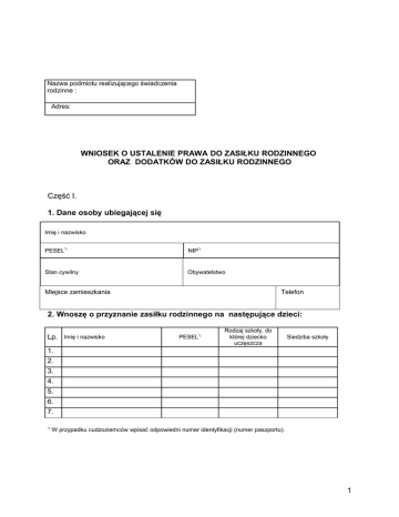 Nazwa podmiotu realizującego świadczenia rodzinne : Adres: WNIOSEK O USTALENIE PRAWA DO ZASIŁKU RODZINNEGO ORAZ DODATKÓW DO ZASIŁKU RODZINNEGO Część I. 1. Dane osoby ubiegającej się Imię i nazwisko 1.Dane wnioskodawcy PESEL*) NIP*) Stan cywilny Obywatelstwo Miejsce zamieszkania Telefon 2. Wnoszę o przyznanie zasiłku rodzinnego na następujące dzieci: Lp. Imię i nazwisko PESEL*) Rodzaj szkoły, do której dziecko uczęszcza Siedziba szkoły 1. 2. 3. 4. 5. 6. 7. *) W przypadku cudzoziemców wpisać odpowiedni numer identyfikacji (numer paszportu). 1 oraz dodatków do zasiłku rodzinnego z tytułu: (zakreślić odpowiedni kwadrat i wpisać dane dzieci) urodzenia dziecka ..............................................................., ..................................................................... (imię i nazwisko dziecka) (imię i nazwisko dziecka) opieki nad dzieckiem w okresie korzystania z urlopu wychowawczego (należy wypełnić część II) ..............................................................., ..................................................................... (imię i nazwisko dziecka) (imię i nazwisko dziecka) samotnego wychowywania dziecka (dodatek przysługuje na dwoje dzieci); (należy wypełnić część III) na: ..............................................................., ..................................................................... (imię i nazwisko dziecka) (imię i nazwisko dziecka) wychowywania dziecka w rodzinie wielodzietnej (dodatek przysługuje na trzecie i każde kolejne dziecko uprawnione do zasiłku rodzinnego) na: ..............................................................., ..................................................................... (imię i nazwisko dziecka) (imię i nazwisko dziecka) ..............................................................., ..................................................................... (imię i nazwisko dziecka) (imię i nazwisko dziecka) kształcenia i rehabilitacji dziecka niepełnosprawnego ..............................................................., ..................................................................... (imię i nazwisko dziecka) (imię i nazwisko dziecka) rozpoczęcia roku szkolnego przez: ..............................................................., na rok szkolny.............../.................. (imię i nazwisko dziecka) ..............................................................., na rok szkolny.............../.................. (imię i nazwisko dziecka) ..............................................................., na rok szkolny.............../.................. (imię i nazwisko dziecka) ..............................................................., na rok szkolny.............../.................. (imię i nazwisko dziecka) ..............................................................., na rok szkolny.............../.................. (imię i nazwisko dziecka) 2 podjęcia przez dziecko nauki w szkole poza miejscem zamieszkania (na częściowe pokrycie wydatków związanych z zamieszkaniem w miejscowości, w której znajduje się siedziba szkoły) na: ..............................................................., ..................................................................... (imię i nazwisko dziecka) (imię i nazwisko dziecka) na rok szkolny*)................/.................oraz rok szkolny**)......................../...................... podjęcia przez dziecko nauki w szkole poza miejscem zamieszkania (na pokrycie wydatków związanych z zapewnieniem dziecku możliwości dojazdu z miejsca zamieszkania do miejscowości, w której znajduje się siedziba szkoły) na: ..............................................................., ..................................................................... (imię i nazwisko dziecka) (imię i nazwisko dziecka) na rok szkolny*)................../...............oraz rok szkolny**)......................../...................... *) **) Wpisać bieżący rok szkolny. Wypełnić w przypadku ubiegania się o dodatek także na kolejny rok szkolny; w pustym miejscu wpisać kolejny rok szkolny. Uwaga: wypełnić oświadczenie w części VI. 3. Dane członków rodziny (w tym dzieci do ukończenia 25 lat, a także dziecka, które ukończyło 25. rok życia, legitymującego się orzeczeniem o znacznym stopniu niepełnosprawności, jeżeli w związku z tą niepełnosprawnością rodzinie przysługuje świadczenie pielęgnacyjne). Do członków rodziny nie zalicza się dziecka pozostającego pod opieką opiekuna prawnego, dziecka pozostającego w związku małżeńskim, a także pełnoletniego dziecka posiadającego własne dziecko. W skład rodziny wchodzą: 1 ..................................................................................................................................... (imię i nazwisko stopień pokrewieństwa PESEL*) urząd skarbowy) 2 ..................................................................................................................................... (imię i nazwisko stopień pokrewieństwa PESEL*) urząd skarbowy) 3 ..................................................................................................................................... (imię i nazwisko stopień pokrewieństwa PESEL*) urząd skarbowy) 4 ..................................................................................................................................... (imię i nazwisko stopień pokrewieństwa PESEL*) urząd skarbowy) 5 ..................................................................................................................................... (imię i nazwisko stopień pokrewieństwa PESEL*) urząd skarbowy) 6 ..................................................................................................................................... (imię i nazwisko stopień pokrewieństwa PESEL*) urząd skarbowy) 7 ....................................
