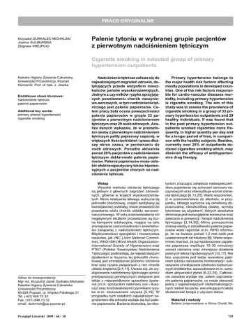 PRACE ORYGINALNE Krzysztof DURKALEC-MICHALSKI Joanna SULIBURSKA Zbigniew KREJPCIO Palenie tytoniu w wybranej grupie pacjentów z pierwotnym nadcinieniem têtniczym Cigarette smoking in selected group of primary hypertension outpatients Katedra Higieny ¯ywienia Cz³owieka, Uniwersytet Przyrodniczy, Poznañ Kierownik: Prof. dr hab. J. Jeszka Dodatkowe s³owa kluczowe: nadcinienie têtnicze palenie papierosów Additional key words: primary arterial hypertension cigarette smoking Adres do korespondencji: Mgr in¿. Krzysztof Jacek Durkalec-Michalski Katedra Higieny ¯ywienia Cz³owieka Uniwersytet Przyrodniczy 60-624 Poznañ, ul. Wojska Polskiego 31 Tel. (+61) 848 73 32 Fax. (+61) 848 73 32 email: [email protected] Przegl¹d Lekarski 2009 / 66 / 10 Nadcinienie têtnicze zalicza siê do najwa¿niejszych zagro¿eñ zdrowia, dotykaj¹cych przede wszystkim mieszkañców pañstw wysokorozwiniêtych. Jednym z czynników ryzyka sprzyjaj¹cych powstawaniu chorób naczyniowo-sercowych, w tym nadcinienia têtniczego jest palenie papierosów. Celem pracy by³a ocena powszechnoci palenia papierosów w grupie 33 pacjentów z pierwotnym nadcinieniem têtniczym oraz 29 osób zdrowych. Analiza danych wykaza³a, ¿e w przesz³oci osoby z pierwotnym nadcinieniem têtniczym pali³y papierosy czêciej, w wiêkszych ilociach/dzieñ i przez d³u¿szy okres czasu, w porównaniu do osób zdrowych. Ponadto aktualnie ponad 20% pacjentów z nadcinieniem têtniczym deklarowa³o palenie papierosów. Palenie papierosów mo¿e os³abiæ efekt terapeutyczny leków hipotensyjnych u pacjentów chorych na nadcinienie têtnicze. Primary hypertension belongs to the major health risk factors affecting mostly populations in developed countries. One of the risk factors responsible for cardio-vascular diseases morbidity, including primary hypertension is cigarette smoking. The aim of this study was to assess the prevalence of cigarette smoking in a group of 33 primary hypertension outpatients and 29 healthy individuals. If was found that in the past primary hypertension outpatients smoked cigarettes more frequently, in higher quantity per day and for a longer period of time, in comparison with the healthy subjects. Besides, currently over 20% of outpatients declared cigarettes smoking which, may diminish the efficacy of antihypertensive drug therapy. Wstêp Wysokie wartoci cinienia têtniczego s¹ jednym z g³ównych zagro¿eñ zdrowotnych, g³ównie w krajach wysokorozwiniêtych. Mimo relatywnie ³atwego wykrycia tej jednostki chorobowej, czêsto spotykany jej bezobjawowy przebieg, mo¿e prowadziæ do powstania wielu chorób uk³adu sercowonaczyniowego. W celu przeciwdzia³ania ich negatywnym skutkom prowadzone s¹ liczne kampanie edukacyjne, maj¹ce na celu zmniejszenie zachorowalnoci i miertelnoci zwi¹zanej z nadcinieniem têtniczym. Miêdzynarodowi specjalici i towarzystwa naukowe, jak JNC (Joint National Committee), WHO-ISH (Word Health OrganizationInternational Society of Hipertension) oraz PTNT (Polskie Towarzystwo Nadcinienia Têtniczego) podkrelaj¹, ¿e najwa¿niejszym dzia³aniem w leczeniu tej jednostki chorobowej jest zmniejszenie poziomu cinienia krwi oraz ryzyka zwi¹zanych z nim chorób uk³adu kr¹¿enia [2,4,11]. Uwa¿a siê, ¿e wystêpowanie nadcinienia têtniczego oprócz predyspozycji genetycznych zwi¹zane jest tak¿e z nieprawid³owym sposobem ¿ywienia (m.in. spo¿yciem nadmiaru soli i t³uszczy) oraz rodowiskowymi czynnikami ryzyka m.in. stosowaniem u¿ywek [5,16]. W przypadku tych ostatnich najwiêkszym zagro¿eniem dla zdrowia wydaje siê byæ palenie papierosów. Badania dowodz¹, ¿e niko- tynizm znacz¹co zwiêksza niebezpieczeñstwo pojawienia siê schorzeñ sercowo-naczyniowych oraz intensyfikuje wzrost cinienia têtniczego [6,13,25]. Warto wspomnieæ, i¿ w przeciwieñstwie do alkoholu, w przypadku, którego wyró¿nia siê okrelon¹ dopuszczaln¹, nieszkodliw¹ dawkê, wyroby tytoniowe s¹ u¿ywkami, których absolutna eliminacja jest bezwzglêdnie konieczna oraz zalecana w prewencji i terapii nadcinienia têtniczego [3,14,30]. Mimo powszechnie znanej wiedzy o szkodliwoci palenia papierosów wiele raportów m.in. WHO informuje, ¿e na wiecie ponad 1,2 mld osób jest uzale¿nionych od nikotyny [6]. Warto wspomnieæ równie¿, ¿e ju¿ ka¿dorazowe zapalenie papierosa implikuje 15-30 minutowy wzrost cinienia oraz zmniejsza dzia³anie pewnych leków hipotensyjnych [12,17]. Nie bez znaczenia jest tak¿e wywo³ane paleniem tytoniu naruszenie homeostazy i sukcesywne zmniejszanie zdolnoci rozkurczowych ródb³onka, spowodowane m.in. wzrostem aktywnoci p³ytek [6,22,25]. Ca³kowicie zasadne wydaje siê, zatem zaprzestanie palenia papierosów, co mo¿e stanowiæ jedn¹ z najwa¿niejszych niefarmakologicznych metod leczenia, warunkuj¹cych tak¿e skutecznoæ terapii z u¿yciem leków. Materia³ i metody Badania przeprowadzono w Klinice Chorób We- 729 wnêtrznych, Zaburzeñ Metabolicznych i Nadcinienia Têtniczego Uniwersytetu Medycznego w Poznaniu. Wziê³o w nich udzia³ 33 pacjentów ze zdiagnozowanym przez lekarzy prowadz¹cych pierwotnym nadcinieniem têtniczym - 17 kobiet i 16 mê¿czyzn, w wieku 47,8 ± 12,6 lat. Z badania wykluczono pacjentów z chorobami wspó³istniej¹cymi m.in. cukrzyc¹, chorob¹ niedokrwienn¹ serca, nadczynnoci¹ lub niedoczynnoci¹ tarczycy, chorob¹ nowotworow¹, zaburzon¹ funkcj¹ nerek. Pacjenci wyrazili wiadom¹ zgodê na udzia³ w badaniu. Uzyskane wyniki zestawiono z danymi otrzymanymi w analizie grupy kontrolnej (zdrowej), sk³adaj¹cej siê z 29 osób, w wieku 30 ± 11 lat. Pacjentom bior¹cym udzia³ w badaniu zmierzono cinienie têtnicze krwi za pomoc¹ sfingomanometru rtêciowego. Wyniki dotycz¹ce charakterystyki palenia papierosów opracowano na podstawie danych zebranych w ankiecie autorskiej. Analizê statystyczn¹ przeprowadzono z u¿yciem programu Statistica 6.0, wykorzystuj¹c test Mann-Whitney`a i test c2, przy poziomie istotnoci a=0,05. Na przeprowadzen