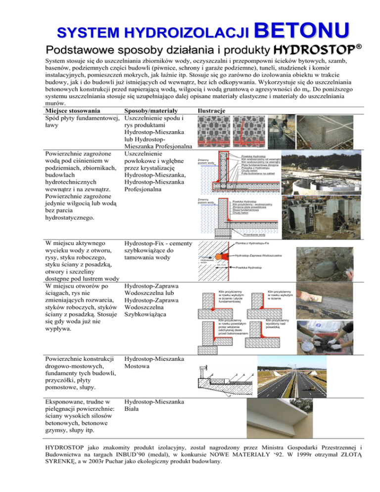 SYSTEM HYDROIZOLACJI BETONU Podstawowe sposoby działania i produkty HYDROSTOP® System stosuje się do uszczelniania zbiorników wody, oczyszczalni i przepompowni ścieków bytowych, szamb, basenów, podziemnych części budowli (piwnice, schrony i garaże podziemne), tuneli, studzienek i komór instalacyjnych, pomieszczeń mokrych, jak łaźnie itp. Stosuje się go zarówno do izolowania obiektu w trakcie budowy, jak i do budowli już istniejących od wewnątrz, bez ich odkopywania. Wykorzystuje się do uszczelniania betonowych konstrukcji przed napierającą wodą, wilgocią i wodą gruntową o agresywności do ma. Do poniższego systemu uszczelniania stosuje się uzupełniająco dalej opisane materiały elastyczne i materiały do uszczelniania murów. Miejsce stosowania Sposoby/materiały Ilustracje Spód płyty fundamentowej, Uszczelnienie spodu i ławy rys produktami Hydrostop-Mieszanka lub HydrostopMieszanka Profesjonalna Powierzchnie zagrożone Uszczelnienie Powłoka Hydrostop Klin wodoszczelny od wewnątrz Zmienny wodą pod ciśnieniem w powłokowe i wgłębne Klin wodoszczelny na zewnątrz poziom wody Płyta fundamentowa zbrojona Posypka z Hydrostopu podziemiach, zbiornikach, przez krystalizację Chudy beton Folia budowlana na zakład budowlach Hydrostop-Mieszanka, hydrotechnicznych Hydrostop-Mieszanka wewnątrz i na zewnątrz. Profesjonalna Powierzchnie zagrożone Zmienny Powłoka Hydrostop poziom wody jedynie wilgocią lub wodą Klin przyścienny - wodoszczelny Zbrojona płyta posadzkowa Stopa fundamentowa bez parcia Chudy beton hydrostatycznego. Przenikanie wody W miejscu aktywnego wycieku wody z otworu, rysy, styku roboczego, styku ściany z posadzką, otwory i szczeliny dostępne pod lustrem wody W miejscu otworów po ściągach, rys nie zmieniających rozwarcia, styków roboczych, styków ściany z posadzką. Stosuje się gdy woda już nie wypływa. Hydrostop-Fix - cementy szybkowiążące do tamowania wody Plomba Plomba zz Hydrostopu-Fix Hydrostopu-Fix Gruntowanie zaczynem cementowym z Hydrostopem-Koncentratem Hydrostop-Zaprawa Wodoszczelna PRZENIKANIE WODY min. 5 cm Hydrostop-Zaprawa Wodoszczelna lub Zaprawa 1:3 z 5% dodatkiem Powłoka Hydrostop Hydrostopu-Koncentratu do masy cementu Trójwarstwowa powłoka z Koncentratem Hydrostop-Zaprawa Wodoszczelna lub Hydrostop-Zaprawa Wodoszczelna Szybkowiążąca Klin przyścienny w rowku wykutym w ścianie i płycie fundamentowej Klin przyścienny w rowku powstałym przez włożenie odchylonej deski przed betonowaniem Powierzchnie konstrukcji drogowo-mostowych, fundamenty tych budowli, przyczółki, płyty pomostowe, słupy. Hydrostop-Mieszanka Mostowa Eksponowane, trudne w pielęgnacji powierzchnie: ściany wysokich silosów betonowych, betonowe gzymsy, słupy itp. Hydrostop-Mieszanka Biała Klin przyścienny w rowku wykutym w ścianie Klin przyścienny wyoblony nad posadzką HYDROSTOP jako znakomity produkt izolacyjny, został nagrodzony przez Ministra Gospodarki Przestrzennej i Budownictwa na targach INBUD’90 (medal), w konkursie NOWE MATERIAŁY ‘92. W 1999r otrzymał ZŁOTĄ SYRENKĘ, a w 2003r Puchar jako ekologiczny produkt budowlany.
