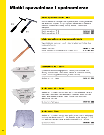 Młotki spawalnicze i spoinomierze Młotki spawalnicze SH2 i SH3 Młotki spawalnicze SH2 wykonane są ze specjalnej wysokogatunkowej stali. Posiadają wygodną w użyciu rękojeść. Model SH3 to niewielkie narzędzie z dłutem i końcówką. Stalowy trzonek z plastikowym uchwytem. SH2 SH3 Młotek spawalniczy SH2 Młotek spawalniczy SH3 0000 663 000 0683 200 001 Młotki spawalnicze z drewnianą rękojeścią Wysokiej jakości hartowany obuch i drewniany trzonek. Funkcja dłuta i ostre zakończenie. Drewno Martinella Młotek spawalniczy z drewnianym trzonkiem TH/5 0000 915 051 0701 380 106 Spoinomierz KL-1 Laser Spoinomierz do dokładnego pomiaru A spoin pachwinowych. Dwa obszary pomiaru: maks. 7mm i maks. 15mm. W komplecie skórzany futerał. Dostarczany jest wraz z certyfikatem kalibracji. Spoinomierz KL-1 Laser 0000 139 931 Spoinomierz KL-2 Laser Spoinomierz do dokładnego pomiaru A spoin pachwinowych, ramienia (krótkiego boku trójkąta prostokątnego) i do pomiaru symetryczności spoiny. W komplecie skórzany futerał. Dostarczany jest razem z certyfikatem kalibracji. Spoinomierz KL-2 Laser 0000 139 932 Spoinomierz Filarc Spoinomierz do dokładnego pomiaru spoin pachwinowych na obszarze 3-11mm, oraz kątów rowka 50° i 60°. Również szybki pomiar 4, 5, 6 i 7 mm spoin pachwinowych oraz szczelin o grubości 1.5, 2 i 3.5mm. Spoinomierz Filarc 72 0000 593 268 Spoinomierze i drobne narzędzia Spoinomierz INOX Spoinomierz do dokładnego pomiaru spoin pachwinowych oraz do pomiaru symetryczności spoiny czołowej. Wyposażony w trzy podziałki. Zakres pomiarowy 0-15mm przy dokładności pomiaru +0,1mm. Spoinomierz INOX 0000 593 720 Uniwersalne szczypce Szczypce zaprojektowane specjalnie do stosowania w spawaniu metodą MIG/MAG. Usuwają odpryski z dyszy, przecinają drut spawalniczy i ułatwiają zdejmowanie końcówek prądowych i dysz gazowych. Uniwersalne szczypce Uniwersalne szczypce mini 0000 134 716 0000 139 054 Szczypce Fix Szybkie i skuteczne cięcie drutu spawalniczego i usuwanie końca drutu w uchwycie. Szczypce usuwają odpryski z dysz gazowych oraz mogą być używane do zakładania i zdejmowania końcówek prądowych i dysz gazowych. Fix 1 12-15mm Fix 2 15-18mm 0760 022 100 0760 022 200 Lusterko inspekcyjne Lusterko inspekcyjne z nierdzewnej stali do kontroli spoin. Lusterko inspekcyjne 500mm, z magnetyczną podstawą 0000 595 319 73