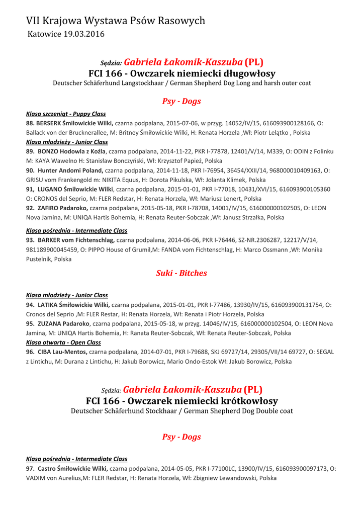 VII Krajowa Wystawa Psów Rasowych Katowice 19.03.2016 Sędzia: Gabriela Łakomik-Kaszuba (PL) FCI 166 - Owczarek niemiecki długowłosy Deutscher Schäferhund Langstockhaar / German Shepherd Dog Long and harsh outer coat Psy - Dogs Klasa szczeniąt - Puppy Class 88. BERSERK Śmiłowickie Wilki, czarna podpalana, 2015-07-06, w przyg. 14052/IV/15, 616093900128166, O: Ballack von der Brucknerallee, M: Britney Śmiłowickie Wilki, H: Renata Horzela ,Wł: Piotr Lelątko , Polska Klasa młodzieży - Junior Class 89. BONZO Hodowla z Koźla, czarna podpalana, 2014-11-22, PKR I-77878, 12401/V/14, M339, O: ODIN z Folinku M: KAYA Wawelno H: Stanisław Bonczyński, Wł: Krzysztof Papież, Polska 90. Hunter Andomi Poland, czarna podpalana, 2014-11-18, PKR I-76954, 36454/XXII/14, 968000010409163, O: GRISU vom Frankengold m: NIKITA Equus, H: Dorota Pikulska, Wł: Jolanta Klimek, Polska 91, LUGANO Śmiłowickie Wilki, czarna podpalana, 2015-01-01, PKR I-77018, 10431/XVI/15, 616093900105360 O: CRONOS del Seprio, M: FLER Redstar, H: Renata Horzela, Wł: Mariusz Lenert, Polska 92. ZAFIRO Padaroko, czarna podpalana, 2015-05-18, PKR I-78708, 14001/IV/15, 616000000102505, O: LEON Nova Jamina, M: UNIQA Hartis Bohemia, H: Renata Reuter-Sobczak ,Wł: Janusz Strzałka, Polska Klasa pośrednia - Intermediate Class 93. BARKER vom Fichtenschlag, czarna podpalana, 2014-06-06, PKR I-76446, SZ-NR.2306287, 12217/V/14, 981189900045459, O: PIPPO House of Grumil,M: FANDA vom Fichtenschlag, H: Marco Ossmann ,Wł: Monika Pustelnik, Polska Suki - Bitches Klasa młodzieży - Junior Class 94. LATIKA Śmiłowickie Wilki, czarna podpalana, 2015-01-01, PKR I-77486, 13930/IV/15, 616093900131754, O: Cronos del Seprio ,M: FLER Restar, H: Renata Horzela, Wł: Renata i Piotr Horzela, Polska 95. ZUZANA Padaroko, czarna podpalana, 2015-05-18, w przyg. 14046/IV/15, 616000000102504, O: LEON Nova Jamina, M: UNIQA Hartis Bohemia, H: Ranata Reuter-Sobczak, Wł: Renata Reuter-Sobczak, Polska Klasa otwarta - Open Class 96. CIBA Lau-Mentos, czarna podpalana, 2014-07-01, PKR I-79688, SKJ 69727/14, 29305/VII/14 69727, O: SEGAL z Lintichu, M: Durana z Lintichu, H: Jakub Borowicz, Mario Ondo-Estok Wł: Jakub Borowicz, Polska Sędzia: Gabriela Łakomik-Kaszuba (PL) FCI 166 - Owczarek niemiecki krótkowłosy Deutscher Schäferhund Stockhaar / German Shepherd Dog Double coat Psy - Dogs Klasa pośrednia - Intermediate Class 97. Castro Śmiłowickie Wilki, czarna podpalana, 2014-05-05, PKR I-77100LC, 13900/IV/15, 616093900097173, O: VADIM von Aurelius,M: FLER Redstar, H: Renata Horzela, Wł: Zbigniew Lewandowski, Polska Suki - Bitches Klasa młodzieży - Junior Class 98. ALICE vom Haus Tchorz, czarna podpalana, 2015-05-06, w przyg. 31373/II/15, 968000010407086, O: HUNTER vom Haus Tchorz, M: HEXI vom Bad Waldle, H: Mirosław Tchórz, Wł: Dorota Niemiec , Polska 99. Messina od Basiora, czarna podpalana, 2014-12-13, PKR I-77839, 10475/XVI/14, C430, O: SCHUMANN von Tronje, M: BAXi z Sosnowego Zakątka ,H: Grzegorz Piotrowiak,Wł: Grzegorz Piotrowiak, Polska 100. WANNI vom Frankengold, czarna podpalana, 2014-11-20, w przyg. SZ2310373, 15888/XV/14, 981189900064730, O: JENKY Vac-Vagvölgyl, M: WERONA vom Frankengold, H: Frank Goldlust, Wł: Daniel Giele, Polska Klasa pośrednia - Intermediate Class 101. Al-grom YANKA, czarna podpalana, 2014-10-02, PKR I-78756, 93180/I/14, A704, O: ILIANO vom Fichtenschlag, M: Al-grom YOKO ,H: Marzena i Mirosław Zawiślak ,Wł: Marzena i Mirosław Zawiślak , Michał Kaczor ,Polska 102. DARA Śmiłowickie Wilki, czarna podpalana, 2014-07-23, PKR I-75975, 13833/IV/14, 616093900103498, O: HIRO Śmiłowickie Wilki M: SMARTIE vom Zellwaldrand ,H: Renata Horzela, Wł: Sebastian Paprocki, Polska 103. DOLI ze Skalnego Wzgórza, czarna podpalana, 2014-11-19, PKR I-77713, 7083/XXIII/14, 900164000612176, O: VADIM von Aurelius, M: XILA ze Skalnego Wzgórza, H: Gertruda Jureczko, Wł: Abrahamyan Gevorg, Polska Klasa otwarta - Open Class 104. DAXI z Osiedla Poraja, czarna podpalana, 2014-08-20, PKR I-76802, 9045/XXIX/14, 394D, O: GIO vom Muchlenteich, M: CYTRA z Osiedla Poraja, H: Andrzej Mizera, Wł: Andrzej Mizera, Polska 105. IBERIA von Gran Peregrino, czarna, 2014-01-26, PKR I-74221, 31172/II/14, 967000009260207, O: ZIDAN of Flokish Fest ,M: RYTSUKA de Peregrino, H: Alexander Moscoa Zeledon, Wł: Alexander Moscoa Zeledon - Wojciech Gąsiorek, Polska, 106. IGA Pa-Bo-Ma, czarna podpalana, 2014-03-22, PKR I-75337, 30607/II/14, D829, O: NORTON Tensor M: EVEE Pa-Bo-Ma, H: Beata Kaczmarczyk, Wł: Beata Kaczmarczyk, Polska Klasa użytkowa - Working Class 107. BRITNEY Śmiłowickie Wilki, czarna podpalana, 2011-03-21, PKR I-68294, 13284/IV/11, 972274000004016, O: BIX von Arlett, M: FLER Redstar, H: Renata Horzela, Wł: Renata i Piotr Horzela, Polska
