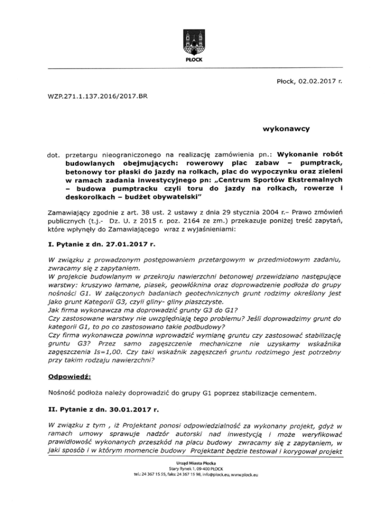 i A 1 PŁOCK Płock, 0 2 . 0 2 . 2 0 1 7 r. WZP.271.1.137.2016/2017.BR wykonawcy dot. p r z e t a r g u n i e o g r a n i c z o n e g o n a realizację zamówienia budowlanych obejmujących: rowerowy plac pn.: Wykonanie zabaw - robót pumptrack, b e t o n o w y t o r płaski d o j a z d y na r o l k a c h , p l a c d o w y p o c z y n k u o r a z z i e l e n i w r a m a c h z a d a n i a I n w e s t y c y j n e g o p n : „Centrum Sportów E k s t r e m a l n y c h - budowa pumptracku czyli toru do jazdy na rolkach, rowerze I d e s k o r o l k a c h - budżet o b y w a t e l s k i " Zamawiający z g o d n i e z a r t . 3 8 u s t . 2 u s t a w y z d n i a 2 9 s t y c z n i a 2 0 0 4 n - P r a w o zmówień p u b l i c z n y c h (t.j.- D z . U. z 2 0 1 5 r. p o z . 2 1 6 4 z e z m . ) p r z e k a z u j e poniżej treść zapytań, które wpłynęły d o Zamawiającego w r a z z wyjaśnieniami: I. P y t a n i e z d n . 2 7 . 0 1 . 2 0 1 7 r. W związku zwracamy z prowadzonym się z W projekcie budowianym warstwy: kruszywo nośności Gl. Czy firma gruntu piasek, W załączonych w przedmiotowym zadaniu, Przez ls=l,00. przy takim rodzaju samo przewidziano grunt następujące podłoża rodzimy do grupy okreśiony jest piaszczyste. grunty nie uwzgiędniają powinna betonowej oraz doprowadzenie geotechnicznych ma doprowadzić warstwy wykonawcza G3? nawierzchni badaniach Gl, to po co zastosowano zagęszczenia przetargowym geowłóknina G3, czyii giiny- giiny wykonawcza Czy zastosowane kategorii w przekroju łamane, jako grunt Kategorii Jak firma postępowaniem zapytaniem. takie G3 do Gl ? tego probiemu? Jeśii doprowadzimy grunt do podbudowy? wprowadzić wymianę gruntu zagęszczenie mechaniczne Czy taki wskaźnik zagęszczeń czy zastosować nie gruntu stabiiizację uzyskamy rodzimego wskaźnika jest potrzebny nawierzchni? Odpowiedź: Nośność podłoża należy doprowadzić d o g r u p y G l p o p r z e z s t a b i l i z a c j e c e m e n t e m . II. P y t a n i e z d n . 3 0 . 0 1 . 2 0 1 7 r. W związku z tym , iż Projektant ramach umowy prawidłowość sprawuje wykonanych ponosi nadzór przeszkód jaki sposób i w którym momencie odpowiedzialność autorski na placu budowy nad inwestycją budowy Projektant za wykonany zwracamy i projekt, może weryfikować się z zapytaniem, będzie testował i korygował Urząd Miasta Płocka Stary Rynek 1,09-400 P t D C K tel.; 24 367 15 55, faks: 24 367 15 98, [email protected], www.plock.eu gdyż w w projekt / na jakiej podstawie stwierdzi nieprawidłowości w wykonaniu przeszkód toru typu pumptrack. Kto powinien Kto dysponować poniesie opłaty Zamawiający, czy Co w przypadku, ramienia z tytułu Wykonawca gdy tester Wykonawcy, wykonaniu wykwalifikowanymi osobami wynagrodzenia za typu testerzy „testowanie i „shaperzy" toru" Projektant , toru? z ramienia Projektanta czy też Inspektora wskaże nieprawidłowości Nadzoru Zamawiającego a tester prawidłowość z w toru. Odpowiedź: Obiekt należy wykonać zgodnie z projektem, mając n a szczególnej uwadze jego bezpieczeństwo i funkcjonalność. W y k o n a w c a p o n o s i odpowiedzialność z a w y k o n a n i e robót w prawidłowy sposób i to na n i m spoczywają k o s z t y związane z p r o c e s e m budowy - włącznie z e s p r a w d z a n i e m , t e s t o w a n i e m i korektą w y k o n a n y c h przeszkód. Projektant m a prawo d o w e r y f i k a c j i zgodności w y k o n y w a n y c h prac z projektem na każdym e t a p i e b u d o w y . W p r z y p a d k u wątpliwości co d o zgodności w y k o n a n y c h prac z p r o j e k t e m t o p r o j e k t a n t wyraża decydującą opinię. Z up. Prezydenta Miasta Płocka