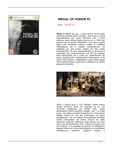 MEDAL OF HONOR PL Cena: 39.00 zł Medal of Honor jest grą, o której słyszał raczej każdy wielbiciel komputerowych produkcji. Jest to gra, za którą odpowiedzialne jest studio Electronic Arts i której pierwsza część ujrzała światło dzienne już w 1999, gdy pojawiła się na konsoli PlayStation. Tym razem gracze będą mieli możliwość wzięcia udziału w konflikcie odbywającym się w czasach współczesnych. Za produkcje gry tym razem zabrały się dwa studia deweloperskie: EA Dice odpowiedzialne za dynamiczną rozgrywkę trybu wieloosobowego oraz EA Los Angeles, które zatroszczyło się o część gry, przeznaczoną dla graczy pojedynczych. Wydarzenia przedstawione w tej części mają miejsce w Afganistanie, gdzie gracz będzie miał okazję kierować żołnierzami należącymi do dwóch głównych oddziałów. Jedna z dwóch grup to U.S. Rangers. Pewni swoich działań żołnierze, którzy nie zważając na nic, bez skrupułów podejmują się każdej walki, siejąc spustoszenie wśród wszelkich wrogów. Tier 1 to druga grupa. Jest ekipą od antyterrorystycznych, precyzyjnych działań. Każdy ich ruch jest przemyślany od strony strategicznej – nie ma miejsca na jakąkolwiek pomyłkę. Dzięki zastosowaniu tak dwóch różnych od siebie sposobów rozgrywki, będziemy mogli cieszyć się przez długi czas różnorodnością misji, z którymi przyjdzie nam się zmierzyć. A te składają się głównie ze specjalnych operacji militarnych, które odwzorowane są na podstawie autentycznych wydarzeń, mających miejsce w 1/2 dzisiejszych czasach na całkiem ogromną skalę. W tej odsłonie gracze będą mogli usiąść na kierownicą quada, prowadzić ostrzał dzięki samolotom bezzałogowym oraz atakować wrogów z pokładu śmigłowca wojskowego. Zróżnicowana rozgrywka z pewnością zapewni różnorodność doznań nawet najbardziej wymagającym graczom, a wielbiciele internetowych bitew z pewnością nie będą mieli powodów do narzekań. Zobacz wideo: Szczegóły wersja językowa POLSKA 2/2 Powered by TCPDF (www.tcpdf.org)
