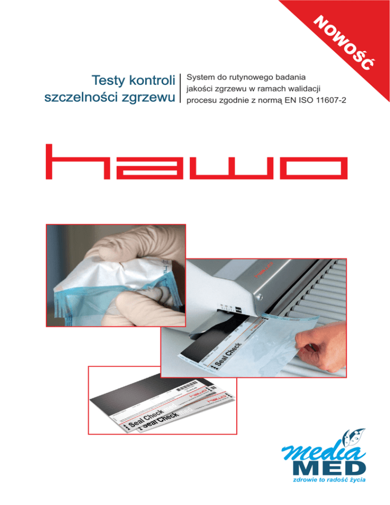 N Ś O W O Ć Testy kontroli szczelności zgrzewu System do rutynowego badania jakości zgrzewu w ramach walidacji procesu zgodnie z normą EN ISO 11607-2 zdrowie to radość życia Wybór rozwiązania Sprawdzian zgrzewania służy do rutynowej wizualnej kontroli poprawności działania zgrzewarek rotacyjnych (rolkowych). Optymalny zgrzew można osiągnąć tylko i wyłącznie wtedy gdy parametry zgrzewania są właściwie dobrane do zgrzewanego materiału. W przypadku gdy jakichkolwiek parametr krytyczny (temperatura, siła nacisku, szybkość /czas przesuwu) będzie nieprawidłowy będzie to widoczne na sprawdzianie zgrzewania. Nienaruszona spoina na określonej szerokości zgrzewu zgodnie z wymaganiami normy PN- EN ISO11607-2:2006 Wymagania normy PN-EN ISO 11607-2:2006 Zgodnie z PN-EN ISO 11607-2, zgrzewy muszą wykazywać następujące cechy jakości: 1. Ciągły zgrzew na całej jego określonej szerokości, 2. Brak kanałów lub przerw w zgrzewie, 3. Brak punktów i rys w zgrzewie, 4. Brak rozwarstwienia folii lub oddzielenia folii od papieru. Kanały lub przerwy w zgrzewie Sprawdzian zgrzewania w bardzo łatwy sposób pokazuje, czy wszystkie cele jakościowe zostały osiągnięte. Subiektywna ocena zgrzewu jest wykluczona, niezależnie od typu zgrzewarki. Przekłucia lub rozerwania zgrzewu Rutynowa kontrola i dokumentacja Rozwarstwienia spowodowane słabym dociskiem lub niską temperaturą zgrzewu Sprawdzian zgrzewania stosowany codziennie pozwala na pełną kontrolę prawidłowości zgrzewania i daje pewność bezpiecznej pracy zgrzewarki. Jeżeli zgrzewarka posiada wbudowany program do przeprowadzania testu poprawności zgrzewu (zgrzewarki HAWO hm 850 DC-V, hm 2010 DC-V, hm 2020 DC-V, hm 3010 DC-V, hm 3010 DC-VI, hm 3020 DC-V) wówczas krytyczne parametry procesu zgrzewania (temperatura, siła nacisku rolki) jak również data przeprowadzenia testu, inicjały osoby wykonującej test będą wydrukowane na odwrocie testu przez wbudowaną drukarkę.Test powinien być dołączony do dokumentacji parametrów procesu zgrzewania zgodnie z normą PN-EN ISO 11607-2. Stopienia spowodowane za silnym dociskiem lub zbyt wysoką temperaturą zgrzewu Kod / opakowanie Opis produktu: 6061017 Test kontroli zgrzewu Seal Check 250 szt. 6061019 Seal Check z systemem dokumentacji 250 szt. 6061025 Seal Check do zgrzewarek impulsowych 100 szt. 6061030 Seal Check do materiału Tyvek* 250 szt. 6061035 Seal Check - test barwnikowy 9345009 Seal Check - karta referencyjna A4 zdrowie to radość życia Printed on 100% recycled fibre Zawartość opakowania: Media-MED Sp. z o.o. ul. Lublańska 34, 31-476 Kraków tel. (12) 413-94-90; fax: (12) 378-35-02; tel. kom. + 48 697-915-953 e-mail: [email protected]; www.media-med.pl 20 szt. 1 szt. 201205-1 Kod produktu:
