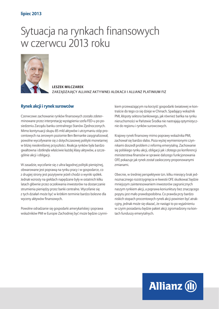 lipiec 2013 Sytuacja na rynkach finansowych w czerwcu 2013 roku LESZEK MILCZAREK ZARZĄDZAJĄCY ALLIANZ AKTYWNEJ ALOKACJI I ALLIANZ PLATINIUM FIZ Rynek akcji i rynek surowców Czerwcowe zachowanie rynków finansowych zostało zdeterminowane przez interpretację wystąpienia szefa FED-u po posiedzeniu Zarządu banku centralnego Stanów Zjednoczonych. Mimo kontynuacji skupu 85 mld aktywów i utrzymaniu stóp procentowych na zerowym poziomie Ben Bernanke zasygnalizował, powolne wycofywanie się z dotychczasowej polityki monetarnej w bliżej nieokreślonej przyszłości. Reakcja rynków była bardzo gwałtowna i dotknęła właściwie każdej klasy aktywów, a szczególnie akcji i obligacji. W zasadzie, wycofanie się z ultra łagodnej polityki pieniężnej, obwarowane jest poprawą na rynku pracy i w gospodarce, co z drugiej strony jest pozytywne jeżeli chodzi o wyniki spółek. Jednak wzrosty na giełdach napędzane były w ostatnich kilku latach głównie przez oczekiwania inwestorów na dostarczanie strumienia pieniędzy przez banki centralne. Wycofanie się z tych działań może być w krótkim terminie bardzo bolesne dla wyceny aktywów finansowych. Powolne odradzanie się gospodarki amerykańskiej i poprawa wskaźników PMI w Europie Zachodniej być może będzie czynni- kiem przeważającym na korzyść gospodarki światowej w kontraście do tego co się dzieje w Chinach. Spadający wskaźnik PMI, kłopoty sektora bankowego, jak również bańka na rynku nieruchomości w Państwie Środka nie nastrajają optymistycznie do regionu i rynków surowcowych. Krajowy rynek finansowy mimo poprawy wskaźnika PMI, zachował się bardzo słabo. Poza wyżej wymienionymi czynnikami doszedł problem z reformą emerytalną. Zachowanie się polskiego rynku akcji, obligacji jak i złotego po konferencji ministerstwa finansów w sprawie dalszego funkcjonowania OFE pokazuje jak rynek został zaskoczony proponowanymi zmianami. Obecnie, w średniej perspektywie tzn. kilku miesięcy brak jednoznacznego rozstrzygnięcia w kwestii OFE skutkować będzie mniejszym zainteresowaniem inwestorów zagranicznych naszym rynkiem akcji, a poprawa koniunktury bez znaczącego popytu jest mało prawdopodobna. Co prawda przy bardzo niskich stopach procentowych rynek akcji powinien być atrakcyjny, jednak może się okazać, że nastąpi to po wyjaśnieniu w czyim posiadaniu będzie pakiet akcji zgromadzony na kontach funduszy emerytalnych. lipiec 2013 MAREK KUCZALSKI ZARZĄDZAJĄCY ALLIANZ OBLIGACJI PLUS, ALLIANZ POLSKICH OBLIGACJI SKARBOWYCH, ALLIANZ PIENIĘŻNY I ALLIANZ OBLIGACJI KORPORACYJNYCH FIZ Rynek obligacji Od dłuższego czasu istotnym czynnikiem kształtującym nastroje na rynku aktywów finansowych są działania banków centralnych. Do tej pory skupiały się one na dostarczaniu taniego pieniądza na globalne rynki, stymulując wzrost cen zarówno akcji jak i obligacji. W ostatnich tygodniach mogliśmy zaobserwować zmianę w nastawieniu władz monetarnych i zaostrzenie retoryki. Groźba możliwego ograniczenia skupu obligacji spowodowała silną wyprzedaż, która nie ominęła rynku polskich instrumentów dłużnych. W czerwcu uwaga inwestorów skupiała się na sygnałach płynących ze strony największych banków centralnych, a ostatecznie zdominowana została przez posiedzenie Zarządu Rezerwy Federalnej (FOMC). Ryzyko wcześniejszego wycofania się amerykańskiego banku centralnego z polityki „luzowania ilościowego” (QE) od dłuższego czasu pozostawało kluczowym czynnikiem kształtującym sytuację na rynkach finansowych. Zmiana tonu ostatnich wypowiedzi przedstawicieli FED-u, z prezesem Benem Bernanke na czele wskazują, że ograniczanie skali skupu aktywów może nastąpić jeszcze w bieżącym roku, by ostatecznie zakończyć się w połowie roku 2014. O ile rynek spekulował o możliwości ograniczenia QE, to informacja o całkowitym wycofaniu się FED-u z programu skupu zaskoczyła inwestorów i wywołała fale spadków na globalnych rynkach. W konsekwencji nastąpiły znaczne wzrosty rentowności na amerykańskich Treasuries i niemieckich Bundach, dla których rentowności dziesięcioletnich benchmarków zakończyły półrocze na poziomach odpowiednio 2,49% i 1,73%. Ryzyko zakończenia polityki „luzowania ilościowego” na rynkach bazowych i związany z nim prawdopodobny odpływ kapitału zagranicznego z rynków rozwijających się, spowodował w czerwcu dużą nerwowość na rynku polskich obligacji skarbowych. Nie bez znaczenia był fakt, że zaangażowanie zagranicznych inwestorów w polskie obligacje skarbowe jest obecnie jednym z najwyższych na rynkach wschodzących (w relacji do PKB). Na ceny polskich obligacji negatywnie wpływały również czynniki krajowe, w szczególności spodziewany koniec cyklu obniżek stóp procentowych. Pomimo, iż RPP zdecydowała się na obniżkę o kolejne 25 pb (do historycznie niskiego poziomu 2,75%), to dla inwestorów większe znaczenie miał komunikat Rady, w którym zasugerowała, że na lipcowym posiedzeniu możliwa jest jeszcze jedna obniżka stóp ale niewykluczona jest również deklaracja o zakończeniu cyklu. Decyzję RPP podejmie po zapoznaniu się z nową średniookresową projekcją inflacji oraz PKB przygotowaną przez zespół analityczny NBP. Mimo iż decyzja była zgodna z oczekiwaniami i wyceniona przez rynek, komunikat Rady spowodował silne wzrosty rentowności polskich obligacji. Nawet słabe dane makroekonomiczne (szczególnie produkcja przemysłowa, która spadła o 1,8% po wzroście o 2,7% miesiąc wcześniej i konsensusie na poziomie -0,8%) nie pomogły podnieść się rynkowi. W rezultacie krzywa dochodowości uległa znacznemu wystromieniu, a rentowności polskich dziesięciolatek pierwszy raz od listopada 2012 roku przekroczyły poziom 4,50%. Dopiero koniec miesiąca przyniósł delikatne uspokojenie nastrojów i lekkie odreagowanie, w wyniku czego ostatecznie rentowność obligacji 2-letnich wyniosła 3,05%, obli