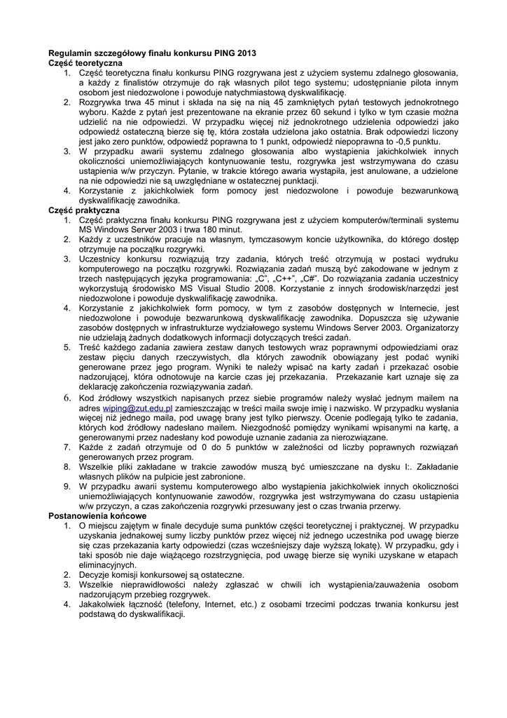 Regulamin szczegółowy finału konkursu PING 2013 Część teoretyczna 1. Część teoretyczna finału konkursu PING rozgrywana jest z użyciem systemu zdalnego głosowania, a każdy z finalistów otrzymuje do rąk własnych pilot tego systemu; udostępnianie pilota innym osobom jest niedozwolone i powoduje natychmiastową dyskwalifikację. 2. Rozgrywka trwa 45 minut i składa na się na nią 45 zamkniętych pytań testowych jednokrotnego wyboru. Każde z pytań jest prezentowane na ekranie przez 60 sekund i tylko w tym czasie można udzielić na nie odpowiedzi. W przypadku więcej niż jednokrotnego udzielenia odpowiedzi jako odpowiedź ostateczną bierze się tę, która została udzielona jako ostatnia. Brak odpowiedzi liczony jest jako zero punktów, odpowiedź poprawna to 1 punkt, odpowiedź niepoprawna to -0,5 punktu. 3. W przypadku awarii systemu zdalnego głosowania albo wystąpienia jakichkolwiek innych okoliczności uniemożliwiających kontynuowanie testu, rozgrywka jest wstrzymywana do czasu ustąpienia w/w przyczyn. Pytanie, w trakcie którego awaria wystąpiła, jest anulowane, a udzielone na nie odpowiedzi nie są uwzględniane w ostatecznej punktacji. 4. Korzystanie z jakichkolwiek form pomocy jest niedozwolone i powoduje bezwarunkową dyskwalifikację zawodnika. Część praktyczna 1. Część praktyczna finału konkursu PING rozgrywana jest z użyciem komputerów/terminali systemu MS Windows Server 2003 i trwa 180 minut. 2. Każdy z uczestników pracuje na własnym, tymczasowym koncie użytkownika, do którego dostęp otrzymuje na początku rozgrywki. 3. Uczestnicy konkursu rozwiązują trzy zadania, których treść otrzymują w postaci wydruku komputerowego na początku rozgrywki. Rozwiązania zadań muszą być zakodowane w jednym z trzech następujących języka programowania: „C”, „C++”, „C#”. Do rozwiązania zadania uczestnicy wykorzystują środowisko MS Visual Studio 2008. Korzystanie z innych środowisk/narzędzi jest niedozwolone i powoduje dyskwalifikację zawodnika. 4. Korzystanie z jakichkolwiek form pomocy, w tym z zasobów dostępnych w Internecie, jest niedozwolone i powoduje bezwarunkową dyskwalifikację zawodnika. Dopuszcza się używanie zasobów dostępnych w infrastrukturze wydziałowego systemu Windows Server 2003. Organizatorzy nie udzielają żadnych dodatkowych informacji dotyczących treści zadań. 5. Treść każdego zadania zawiera zestaw danych testowych wraz poprawnymi odpowiedziami oraz zestaw pięciu danych rzeczywistych, dla których zawodnik obowiązany jest podać wyniki generowane przez jego program. Wyniki te należy wpisać na karty zadań i przekazać osobie nadzorującej, która odnotowuje na karcie czas jej przekazania. Przekazanie kart uznaje się za deklarację zakończenia rozwiązywania zadań. 6. Kod źródłowy wszystkich napisanych przez siebie programów należy wysłać jednym mailem na adres [email protected] zamieszczając w treści maila swoje imię i nazwisko. W przypadku wysłania więcej niż jednego maila, pod uwagę brany jest tylko pierwszy. Ocenie podlegają tylko te zadania, których kod źródłowy nadesłano mailem. Niezgodność pomiędzy wynikami wpisanymi na kartę, a generowanymi przez nadesłany kod powoduje uznanie zadania za nierozwiązane. 7. Każde z zadań otrzymuje od 0 do 5 punktów w zależności od liczby poprawnych rozwiązań generowanych przez program. 8. Wszelkie pliki zakładane w trakcie zawodów muszą być umieszczane na dysku I:. Zakładanie własnych plików na pulpicie jest zabronione. 9. W przypadku awarii systemu komputerowego albo wystąpienia jakichkolwiek innych okoliczności uniemożliwiających kontynuowanie zawodów, rozgrywka jest wstrzymywana do czasu ustąpienia w/w przyczyn, a czas zakończenia rozgrywki przesuwany jest o czas trwania przerwy. Postanowienia końcowe 1. O miejscu zajętym w finale decyduje suma punktów części teoretycznej i praktycznej. W przypadku uzyskania jednakowej sumy liczby punktów przez więcej niż jednego uczestnika pod uwagę bierze się czas przekazania karty odpowiedzi (czas wcześniejszy daje wyższą lokatę). W przypadku, gdy i taki sposób nie daje wiążącego rozstrzygnięcia, pod uwagę bierze się wyniki uzyskane w etapach eliminacyjnych. 2. Decyzje komisji konkursowej są ostateczne. 3. Wszelkie nieprawidłowości należy zgłaszać w chwili ich wystąpienia/zauważenia osobom nadzorującym przebieg rozgrywek. 4. Jakakolwiek łączność (telefony, Internet, etc.) z osobami trzecimi podczas trwania konkursu jest podstawą do dyskwalifikacji.