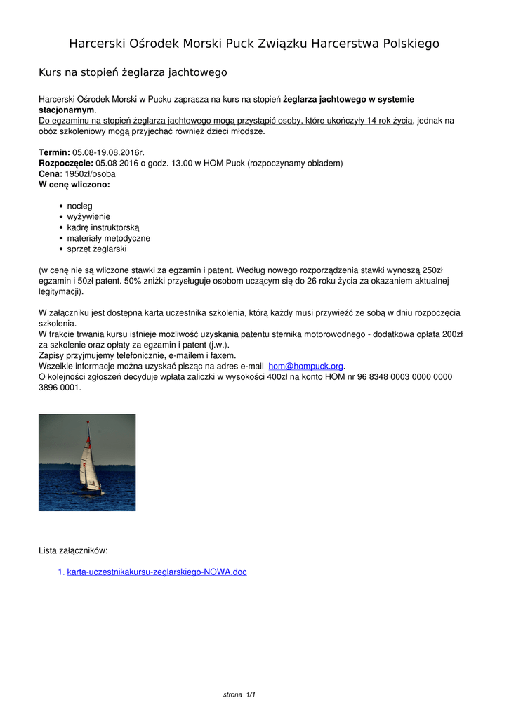 Harcerski Ośrodek Morski Puck Związku Harcerstwa Polskiego Kurs na stopień żeglarza jachtowego Harcerski Ośrodek Morski w Pucku zaprasza na kurs na stopień żeglarza jachtowego w systemie stacjonarnym. Do egzaminu na stopień żeglarza jachtowego mogą przystąpić osoby, które ukończyły 14 rok życia, jednak na obóz szkoleniowy mogą przyjechać również dzieci młodsze. Termin: 05.08-19.08.2016r. Rozpoczęcie: 05.08 2016 o godz. 13.00 w HOM Puck (rozpoczynamy obiadem) Cena: 1950zł/osoba W cenę wliczono: nocleg wyżywienie kadrę instruktorską materiały metodyczne sprzęt żeglarski (w cenę nie są wliczone stawki za egzamin i patent. Według nowego rozporządzenia stawki wynoszą 250zł egzamin i 50zł patent. 50% zniżki przysługuje osobom uczącym się do 26 roku życia za okazaniem aktualnej legitymacji). W załączniku jest dostępna karta uczestnika szkolenia, którą każdy musi przywieźć ze sobą w dniu rozpoczęcia szkolenia. W trakcie trwania kursu istnieje możliwość uzyskania patentu sternika motorowodnego - dodatkowa opłata 200zł za szkolenie oraz opłaty za egzamin i patent (j.w.). Zapisy przyjmujemy telefonicznie, e-mailem i faxem. Wszelkie informacje można uzyskać pisząc na adres e-mail [email protected]. O kolejności zgłoszeń decyduje wpłata zaliczki w wysokości 400zł na konto HOM nr 96 8348 0003 0000 0000 3896 0001. Lista załączników: 1. karta-uczestnikakursu-zeglarskiego-NOWA.doc strona 1/1 Powered by TCPDF (www.tcpdf.org)