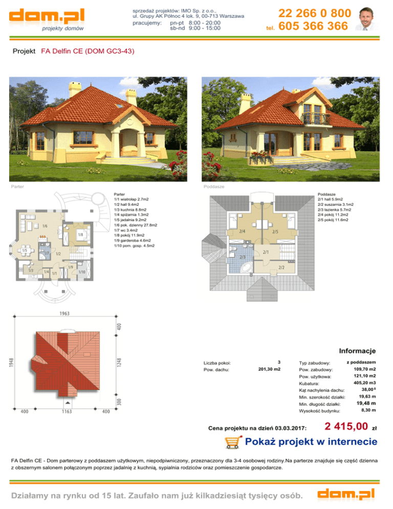 sprzedaż projektów: IMO Sp. z o.o., ul. Grupy AK Północ 4 lok. 9, 00-713 Warszawa pracujemy: pn-pt 8:00 - 20:00 sb-nd 9:00 - 15:00 22 266 0 800 tel. 605 366 366 Projekt FA Delfin CE (DOM GC3-43) Parter Poddasze Parter 1/1 wiatrołap 2.7m2 1/2 hall 9.4m2 1/3 kuchnia 8.8m2 1/4 spiżarnia 1.3m2 1/5 jadalnia 9.2m2 1/6 pok. dzienny 27.8m2 1/7 wc 3.4m2 1/8 pokój 11.9m2 1/9 garderoba 4.6m2 1/10 pom. gosp. 4.5m2 Poddasze 2/1 hall 5.9m2 2/2 suszarnia 3.1m2 2/3 łazienka 5.7m2 2/4 pokój 11.2m2 2/5 pokój 11.6m2 Informacje Liczba pokoi: Pow. dachu: 3 201,30 m2 Typ zabudowy: z poddaszem Pow. zabudowy: 109,70 m2 Pow. użytkowa: 121,10 m2 Kubatura: 405,20 m3 Kąt nachylenia dachu: 38,00 0 Min. szerokość działki: 19,63 m Min. długość działki: 19,48 m Wysokość budynku: 8,30 m Cena projektu na dzień 03.03.2017: 2 415,00 zł Pokaż projekt w internecie FA Delfin CE - Dom parterowy z poddaszem użytkowym, niepodpiwniczony, przeznaczony dla 3-4 osobowej rodziny.Na parterze znajduje się część dzienna z obszernym salonem połączonym poprzez jadalnię z kuchnią, sypialnia rodziców oraz pomieszczenie gospodarcze. Działamy na rynku od 15 lat. Zaufało nam już kilkadziesiąt tysięcy osób.