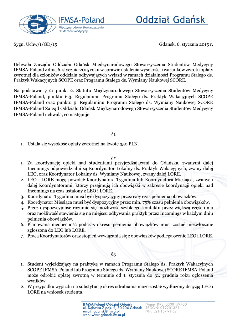 Sygn. Uchw/1/GD/15 Gdańsk, 6. stycznia 2015 r. Uchwała Zarządu Oddziału Gdańsk Międzynarodowego Stowarzyszenia Studentów Medycyny IFMSA-Poland z dnia 6. stycznia 2015 roku w sprawie ustalenia wysokości i warunków zwrotu opłaty zwrotnej dla członków oddziału odbywających wyjazd w ramach działalności Programu Stałego ds. Praktyk Wakacyjnych SCOPE oraz Programu Stałego ds. Wymiany Naukowej SCORE. Na podstawie § 21 punkt 2. Statutu Międzynarodowego Stowarzyszenia Studentów Medycyny IFMSA-Poland, punktu 6.3. Regulaminu Programu Stałego ds. Praktyk Wakacyjnych SCOPE IFMSA-Poland oraz punktu 9. Regulaminu Programu Stałego ds. Wymiany Naukowej SCORE IFMSA-Poland Zarząd Oddziału Gdańsk Międzynarodowego Stowarzyszenia Studentów Medycyny IFMSA-Poland uchwala, co następuje: §1 1. Ustala się wysokość opłaty zwrotnej na kwotę 350 PLN. §2 1. Za koordynację opieki nad studentami przyjeżdżającymi do Gdańska, zwanymi dalej Incomings odpowiedzialni są Koordynator Lokalny ds. Praktyk Wakacyjnych, zwany dalej LEO, oraz Koordynator Lokalny ds. Wymiany Naukowej, zwany dalej LORE. 2. LEO i LORE mogą powołać Koordynatora Tygodnia lub Koordynatora Miesiąca, zwanych dalej Koordynatorami, którzy przejmują ich obowiązki w zakresie koordynacji opieki nad Incomings na czas ustalony z LEO i LORE. 3. Koordynator Tygodnia musi być dyspozycyjny przez cały czas pełnienia obowiązków. 4. Koordynator Miesiąca musi być dyspozycyjny przez min. 75% czasu pełnienia obowiązków. 5. Przez dyspozycyjność rozumie się możliwość szybkiego kontaktu przez większą część dnia oraz możliwość stawienia się na miejscu odbywania praktyk przez Incomings w każdym dniu pełnienia obowiązków. 6. Planowana nieobecność podczas okresu pełnienia obowiązków musi zostać niezwłocznie zgłoszona do LEO lub LORE. 7. Praca Koordynatorów oraz stopień wywiązania się z obowiązków podlega ocenie LEO i LORE. §3 1. Student wyjeżdżający na praktykę w ramach Programu Stałego ds. Praktyk Wakacyjnych SCOPE IFMSA-Poland lub Programu Stałego ds. Wymiany Naukowej SCORE IFMSA-Poland może odrobić opłatę zwrotną w terminie od 1. stycznia do 31. grudnia roku ogłoszenia wyników. 2. W przypadku wyjazdu na substytucję okres odrabiania może zostać wydłużony decyzją LEO i LORE na wniosek studenta. 3. Incomings zazwyczaj przyjeżdżają w lipcu i sierpniu. LEO i LORE nie są w stanie zagwarantować przyjazdu Incomings w innych miesiącach. §4 1. Warunkiem odrobienia opłaty jest: a. odbycie praktyki poświadczone certyfikatem IFMSA, b. wypełnienie Evaluation Form po odbyciu wymiany, c. napisanie relacji z odbytej wymiany do Bazy Relacji IFMSA, d. opieka nad Incomings przez min. 7 dni e. pełnienie funkcji Contact Person dla 1 osoby. 2. Punkt 1e nie musi zostać wypełniony w przypadku mniejszej liczby Incomings niż studentów wyjeżdżających. 3. Koordynator Miesiąca oraz Koordynator Weekendu NICE Project są zwolnieni z wypełnienia pkt. 1d pod warunkiem sumiennego wywiązania się z obowiązków. 4. Ilość studentów jednocześnie (w danym dniu) opiekujących się Incomings, którym zostanie to policzone jako odrabianie opłaty zwrotnej, jest ograniczona do maksymalnie: a. 2 osób przy grupie Incomings liczącej mniej niż 10 osób, b. 6 osób przy grupie Incomings liczącej 10 osób lub więcej. 5. W nadzwyczajnych przypadkach limity określone w pkt. 4 mogą zostać zwiększone przez LEO i LORE po konsultacji z Koordynatorem. 6. Limity określone w pkt. 4 nie obowiązują osób, które chcą opiekować się Incomings, ale nie wyjeżdżają na praktyki wakacyjne lub wymianę naukową w danym roku. 7. Osoby chcące się opiekować Incomings w danym dniu zgłaszają się do osoby pełniącej obowiązki Koordynatora w dniu opieki. 8. W przypadku większej ilości zgłoszeń zaleca się Koordynatorowi zezwolenie na opiekę osobie, która do tej pory odrobiła mniejszą ilość dni 9. W przypadku opieki przez mniej niż 7 dni, ale min. 5 dni student ma możliwość ubiegać się o zwrot 60% opłaty, tj. 210 zł. 10. Wypełnienie następujących pozycji z Taryfikatora nie jest liczone jako odrobienie dnia: a. Zaprowadzenie do właściwego szpitala/na właściwy oddział, b. Przekazanie Pocket Money, c. Zaprowadzenie na stołówkę. 11. W losowych przypadkach LEO i LORE mogą zadecydować o innej formie odrobienia opłaty zwrotnej. §5 1. Po wypełnieniu warunków zawartych w §4 student ma obowiązek zgłosić się do LEO lub LORE i poinformować o wnioskowanej kwocie zwrotu. 2. Wywiązanie się z warunków odrabiania oceniają LEO i LORE. 3. Wniosek o zwrot pieniędzy należy złożyć nie później niż 3 miesiące od dnia wypełnienia wszystkich warunków. W przypadku niewywiązania się z tego terminu opłata przepada na rzecz Oddziału jako darowizna. 4. W sprawach spornych ostateczną decyzję w sprawie zwrotu podejmują LEO i LORE w porozumieniu z Zarządem Oddziału. §6 1. Uchwała wchodzi w życie z dniem podjęcia. 2. Poprzednie uchwały regulujące zasady opieki nad Incomings i zwrotu opłaty zwrotnej tracą ważność. Michał Późniak Izabela Seydak Prezydent Oddziału Gdańsk IFMSA-Poland Sekretarz Oddziału Gdańsk IFMSA-Poland