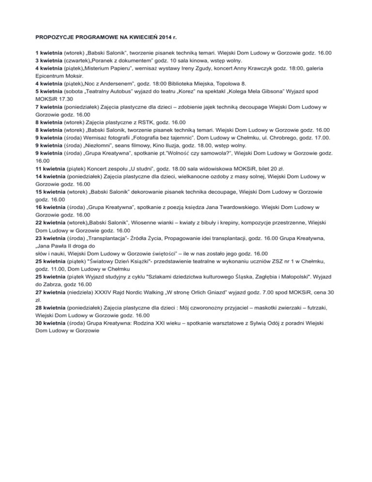 PROPOZYCJE PROGRAMOWE NA KWIECIEŃ 2014 r. 1 kwietnia (wtorek) „Babski Salonik”, tworzenie pisanek techniką temari. Wiejski Dom Ludowy w Gorzowie godz. 16.00 3 kwietnia (czwartek)„Poranek z dokumentem” godz. 10 sala kinowa, wstęp wolny. 4 kwietnia (piątek)„Misterium Papieru”, wernisaż wystawy Ireny Zgudy, koncert Anny Krawczyk godz. 18:00, galeria Epicentrum Moksir. 4 kwietnia (piątek)„Noc z Andersenem”, godz. 18:00 Biblioteka Miejska, Topolowa 8. 5 kwietnia (sobota „Teatralny Autobus” wyjazd do teatru „Korez” na spektakl „Kolega Mela Gibsona” Wyjazd spod MOKSiR 17.30 7 kwietnia (poniedziałek) Zajęcia plastyczne dla dzieci – zdobienie jajek techniką decoupage Wiejski Dom Ludowy w Gorzowie godz. 16.00 8 kwietnia (wtorek) Zajęcia plastyczne z RSTK, godz. 16.00 8 kwietnia (wtorek) „Babski Salonik, tworzenie pisanek techniką temari. Wiejski Dom Ludowy w Gorzowie godz. 16.00 9 kwietnia ( środa) Wernisaż fotografii „Fotografia bez tajemnic”. Dom Ludowy w Chełmku, ul. Chrobrego, godz. 17.00. 9 kwietnia ( środa) „Niezłomni”, seans filmowy, Kino Iluzja, godz. 18.00, wstęp wolny. 9 kwietnia ( środa) „Grupa Kreatywna”, spotkanie pt.”Wolno ść czy samowola?”, Wiejski Dom Ludowy w Gorzowie godz. 16.00 11 kwietnia (piątek) Koncert zespołu „U studni”, godz. 18.00 sala widowiskowa MOKSiR, bilet 20 zł. 14 kwietnia (poniedziałek) Zajęcia plastyczne dla dzieci, wielkanocne ozdoby z masy solnej, Wiejski Dom Ludowy w Gorzowie godz. 16.00 15 kwietnia (wtorek) „Babski Salonik” dekorowanie pisanek technika decoupage, Wiejski Dom Ludowy w Gorzowie godz. 16.00 16 kwietnia ( środa) „Grupa Kreatywna”, spotkanie z poezją księdza Jana Twardowskiego. Wiejski Dom Ludowy w Gorzowie godz. 16.00 22 kwietnia (wtorek)„Babski Salonik”, Wiosenne wianki – kwiaty z bibuły i krepiny, kompozycje przestrzenne, Wiejski Dom Ludowy w Gorzowie godz. 16.00 23 kwietnia ( środa) „Transplantacja”- Źródła Życia, Propagowanie idei transplantacji, godz. 16.00 Grupa Kreatywna, „Jana Pawła II droga do słów i nauki, Wiejski Dom Ludowy w Gorzowie ś wi ęto ści” – ile w nas zostało jego godz. 16.00 25 kwietnia (piątek) " Ś wiatowy Dzień Książki"- przedstawienie teatralne w wykonaniu uczniów ZSZ nr 1 w Chełmku, godz. 11.00, Dom Ludowy w Chełmku 25 kwietnia (piątek Wyjazd studyjny z cyklu "Szlakami dziedzictwa kulturowego Ś l ąska, Zagłębia i Małopolski". Wyjazd do Zabrza, godz 16.00 27 kwietnia (niedziela) XXXIV Rajd Nordic Walking „W stronę Orlich Gniazd” wyjazd godz. 7.00 spod MOKSiR, cena 30 zł. 28 kwietnia (poniedziałek) Zajęcia plastyczne dla dzieci : Mój czworonożny przyjaciel – maskotki zwierzaki – futrzaki, Wiejski Dom Ludowy w Gorzowie godz. 16.00 30 kwietnia ( środa) Grupa Kreatywna: Rodzina XXI wieku – spotkanie warsztatowe z Sylwią Odój z poradni Wiejski Dom Ludowy w Gorzowie