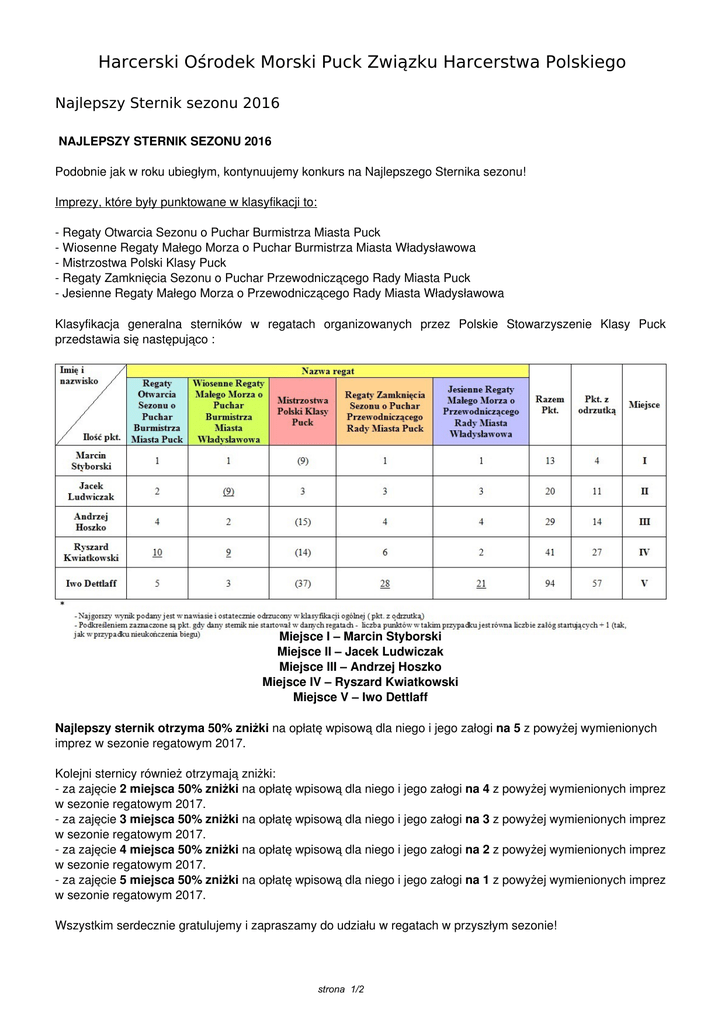 Harcerski Ośrodek Morski Puck Związku Harcerstwa Polskiego Najlepszy Sternik sezonu 2016 NAJLEPSZY STERNIK SEZONU 2016 Podobnie jak w roku ubiegłym, kontynuujemy konkurs na Najlepszego Sternika sezonu! Imprezy, które były punktowane w klasyfikacji to: - Regaty Otwarcia Sezonu o Puchar Burmistrza Miasta Puck - Wiosenne Regaty Małego Morza o Puchar Burmistrza Miasta Władysławowa - Mistrzostwa Polski Klasy Puck - Regaty Zamknięcia Sezonu o Puchar Przewodniczącego Rady Miasta Puck - Jesienne Regaty Małego Morza o Przewodniczącego Rady Miasta Władysławowa Klasyfikacja generalna sterników w regatach organizowanych przez Polskie Stowarzyszenie Klasy Puck przedstawia się następująco : Miejsce I – Marcin Styborski Miejsce II – Jacek Ludwiczak Miejsce III – Andrzej Hoszko Miejsce IV – Ryszard Kwiatkowski Miejsce V – Iwo Dettlaff Najlepszy sternik otrzyma 50% zniżki na opłatę wpisową dla niego i jego załogi na 5 z powyżej wymienionych imprez w sezonie regatowym 2017. Kolejni sternicy również otrzymają zniżki: - za zajęcie 2 miejsca 50% zniżki na opłatę wpisową dla niego i jego załogi na 4 z powyżej wymienionych imprez w sezonie regatowym 2017. - za zajęcie 3 miejsca 50% zniżki na opłatę wpisową dla niego i jego załogi na 3 z powyżej wymienionych imprez w sezonie regatowym 2017. - za zajęcie 4 miejsca 50% zniżki na opłatę wpisową dla niego i jego załogi na 2 z powyżej wymienionych imprez w sezonie regatowym 2017. - za zajęcie 5 miejsca 50% zniżki na opłatę wpisową dla niego i jego załogi na 1 z powyżej wymienionych imprez w sezonie regatowym 2017. Wszystkim serdecznie gratulujemy i zapraszamy do udziału w regatach w przyszłym sezonie! strona 1/2 strona 2/2 Powered by TCPDF (www.tcpdf.org)