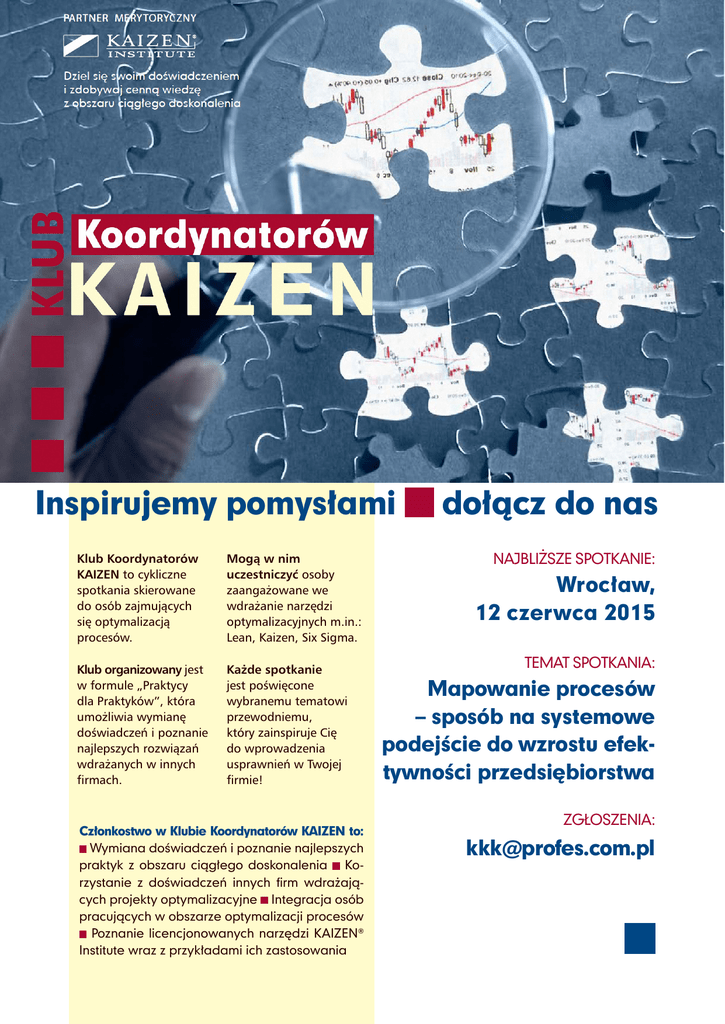 Inspirujemy pomysłami Klub Koordynatorów KAIZEN to cykliczne spotkania skierowane do osób zajmujących się optymalizacją procesów. Mogą w nim uczestniczyć osoby zaangażowane we wdrażanie narzędzi optymalizacyjnych m.in.: Lean, Kaizen, Six Sigma. Klub organizowany jest w formule „Praktycy dla Praktyków”, która umożliwia wymianę doświadczeń i poznanie najlepszych rozwiązań wdrażanych w innych firmach. Każde spotkanie jest poświęcone wybranemu tematowi przewodniemu, który zainspiruje Cię do wprowadzenia usprawnień w Twojej firmie! Członkostwo w Klubie Koordynatorów KAIZEN to: Wymiana doświadczeń i poznanie najlepszych praktyk z obszaru ciągłego doskonalenia Korzystanie z doświadczeń innych firm wdrażających projekty optymalizacyjne Integracja osób pracujących w obszarze optymalizacji procesów Poznanie licencjonowanych narzędzi KAIZEN® Institute wraz z przykładami ich zastosowania dołącz do nas NAJBLIŻSZE SPOTKANIE: Wrocław, 12 czerwca 2015 TEMAT SPOTKANIA: Mapowanie procesów – sposób na systemowe podejście do wzrostu efektywności przedsiębiorstwa ZGŁOSZENIA: [email protected] PARTNER MERYTORYCZNY Dziel się swoim doświadczeniem i zdobywaj cenną wiedzę z obszaru ciągłego doskonalenia Inspirujemy pomysłami dołącz do nas Mapowanie procesów – sposób na systemowe podejście do wzrostu efektywności przedsiębiorstwa 12 czerwca 2015, Wrocław, Wyższa Szkoła Bankowa we Wrocławiu ul. Robotnicza 29/31, godz. 11.00 – 15.30 Jak skutecznie zaimplementować Value Stream Mapping w organizacji? Jak wyszczuplić proces, by wyprzedzić konkurencję i podnieść swoją pozycję na rynku? To kolejne spotkanie poświęcone mapowaniu procesów w organizacji. Odkryjemy jakie ryzyka najczęściej stają nam na przeszkodzie podczas mapowania. Poruszymy mi.in. temat identyfikacji obszarów marnotrawstwa, zdefiniowania procesu, wygenerowania problemów oraz zebrania pomysłów na udoskonalenia. PROGRAM SPOTKANIA: 1. Praktycy dla Praktyków – wystąpienia ekspertów: • ARJOHUNTLEIGH – Maciej Koc, Dyrektor ds. Optymalizacji Procesów • Firma produkcyjna 2. Pytania do ekspertów oraz mini panel dyskusyjny podsumowujący prezentację. Praca w grupach – warsztaty koordynowane przez KAIZEN Institute Polska, podczas których każda z grup przygotuje propozycje radzenia sobie z ryzykami podczas mapowania procesów w organizacji. Warunki i zasady Klubu Koordynatorów KAIZEN 1. Udział w spotkaniach Klubu jest płatne i wynosi 200 zł netto za osobę. Opłata umożliwia udział w Klubach w okresie 12 miesięcy od dokonanej wpłaty. Spotkania są organizowane przez PROFES® Sp. z o.o. Sp.k. jedynego Partnera KAIZEN Institute Consulting Group w Polsce. 2. Spotkanie składa się z 3 stałych bloków: wymiana dobrych praktyk – case study; dyskusja pomiędzy uczestnikami, ekspertami i konsultantem KAIZEN; ćwiczenia warsztatowe 3. Organizator zastrzega sobie prawo do zmainy formuły Klubu i dopasowanie jej do ilości osób uczestniczących w Klubie. 4. Uczestnicy zobowiązują się do przygotowania prezentacji na wybrany temat i wystąpienie w roli eksperta na jednym ze spotkań Klubu Koordynatorów KAIZEN. 5. Dla zapewnienia szerokiego dostępu do Klubu Koordynatora KAIZEN możliwy jest udział nie więcej jak 3 osób z jednej firmy. 6. Opłata w Klubie nie jest imienna. W Klubie Koordynatorów KAIZEN mogą uczestniczyć różne osoby, w ilości zgodnej z opłaconym wpisowym. 7. Warunkiem uczestnictwa jest przesłanie zgłoszenia drogą mailową oraz dokonanie wpłaty na rachunek bankowy PROFES. 8. Poprzez przesłanie zgłoszenia Zgłaszający wyraża zgodę na przetwarzanie udostępnionych danych osobowych uczestnika i firmy w celach informacyjnych i marketingowych przez Organizatora. 9. Przesłanie zgłoszenia jest równoznaczne z akceptacją Warunków i zasad Klubu Koordynatorów KAIZEN. 52-121 Wrocław, ul. Koreańska 13 tel. +48 71 341 29 51, fax +48 71 335 22 79 [email protected] | www.profes.com.pl