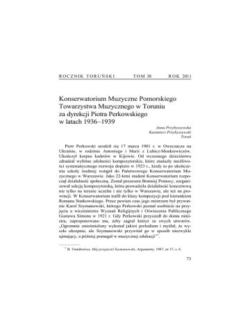 ROCZNIK TORUŃSKI T O M 38 R O K 2011 Konserwatorium Muzyczne Pomorskiego Towarzystwa Muzycznego w Toruniu za dyrekcji Piotra Perkowskiego w latach 1936 –1939 Anna Przybyszewska Kazimierz Przybyszewski Toruń Piotr Perkowski urodził się 17 marca 1901 r. w Oweczaczu na Ukrainie, w rodzinie Antoniego i Marii z Lubicz-Monkiewiczów. Ukończył korpus kadetów w Kijowie. Od wczesnego dzieciństwa zdradzał wybitne zdolności kompozytorskie, które znalazły moŜliwości systematycznego rozwoju dopiero w 1923 r., kiedy to po ukończeniu szkoły średniej wstąpił do Państwowego Konserwatorium Muzycznego w Warszawie. Jako 22-letni student Konserwatorium rozpoczął działalność społeczną. Został prezesem Bratniej Pomocy, zorganizował sekcję kompozytorską, która prowadziła działalność koncertową nie tylko na terenie uczelni i nie tylko w Warszawie, ale teŜ na prowincji. W Konserwatorium trafił do klasy kompozycji pod kierunkiem Romana Statkowskiego. Przez pewien czas jego mistrzem był prywatnie Karol Szymanowski, którego Perkowski poznał osobiście na przyjęciu u wiceministra Wyznań Religijnych i Oświecenia Publicznego Gustawa Simona w 1921 r. Gdy Perkowski przyszedł do domu ministra, zaproponowano mu, Ŝeby zagrał któryś ze swych utworów. „Ogromnie onieśmielony wykonał jakieś preludium i myślał, Ŝe wyszło okropnie, ale Szymanowski przywitał go w sposób niezwykle ujmujący, a później pomagał w muzycznej edukacji”∗. –––––––––– ∗ B. Tumiłowicz, Mój przyjaciel Szymanowski, Argumenty, 1987, nr 37, s. 6. 73 Piotr Perkowski Perkowski wraz ze swoimi kolegami był gorącym wielbicielem Karola Szymanowskiego. Często uczestniczył w interesujących spotkaniach z kompozytorem, które odbywały się w jego wynajętym duŜym mieszkaniu na Nowym Świecie 47. Jak wspominał, był stałym gościem tych spotkań, co było dla niego „niesłychanie pouczającym i rozwijającym, poniewaŜ spotykałem tam i poznałem wielu najwybitniejszych ludzi sztuki i kultury, np. Jarosława Iwaszkiewicza, Juliana Tuwima, Augusta Zamoyskiego, Michała Choromańskiego, Antoniego Słonimskiego i wielu, wielu innych. Ja i moi koledzy informowaliśmy Szymanowskiego o naszych planach, rewolucjach dotyczących konserwatorium”. Edukację muzyczną rozpoczął Perkowski w czasie studiów. Po dwóch latach pracy twórczej miał juŜ kilka ukończonych utworów, m.in. koncert fortepianowy, symfonię na orkiestrę, chóry i kwartet solistów oraz liczne kompozycje fortepianowe i pieśni. Do utworów wokalnych, chętnie wykonywanych przez artystów, naleŜą „Uty japońskie” na sopran i fortepian – pieśni o duŜych walorach artystycznych. Własne utwory wykonał kompozytor podczas uroczystości otrzymania dyplomu w 1925 r. Otrzymał równieŜ nagrodę im. Izabeli Krystall wieńczącą ten krótki, ale owocny okres twórczości. Wykona74 ne przez Perkowskiego własne kompozycje zostały entuzjastycznie przyjęte przez publiczność i prasę. Koncert fortepianowy i I symfonia z chórami i organami wyróŜniały się opanowaniem formy, operowaniem olbrzymim aparatem orkiestrowym wraz z chórami i solistami oraz bogactwem inwencji twórczej. Zapowiadało to bujny rozkwit talentu młodego kompozytora. Kolejnym etapem świetnie zapowiadającej się kariery kompozytorskiej był wyjazd za granicę i kilkuletni pobyt w ParyŜu. Inicjatorem tego wyjazdu był Karol Szymanowski, który pomógł młodemu kompozytorowi w nawiązaniu niezbędnych na początku kontaktów. Perkowski zetknął się w ParyŜu z Feliksem Fryderykiem Łabuńskim, który równieŜ w tym samym czasie przybył tam na studia. Za nimi zaczęli ściągać do ParyŜa inni młodzi muzycy polscy. Pragnęli oni studiować za granicą, by w sferze kultury podźwignąć ówczesną, niepodległą Polskę do poziomu europejskiego. Grupa młodych polskich kompozytorów-muzyków była liczna. Wśród nich m.in. Ewa BandrowskaTurska, Irena Dubiska, GraŜyna Bacewicz, Henryk Sztompka, Tadeusz Szeligowski, Witold Lutosławski, Stanisław Wiechowicz, Roman Palester, Bolesław Woytowicz, Stanisław Szpinalski. Perkowski rozwijał tam swój talent pod kierunkiem wybitnego mistrza Alberta Roussela. W tym okresie powstały utwory takie jak: „Fantazja” na orkiestrę i fortepian, sonata fortepianowa, „Concerto” na małą orkiestrę i fortepian oraz balet w trzech odsłonach – „Swantewit”, napisany na zamówienie dyrekcji Opery Warszawskiej. Balet Perkowskiego cieszył się duŜym powodzeniem i był obok „Harnasi” Karola Szymanowskiego i „Pana Twardowskiego” Ludomira RóŜyckiego najbardziej znanym współczesnym polskim baletem. Kompozytor przez zetknięcie się z najnowszymi prądami muzyki Zachodu doskonalił formę, rozszerzał horyzonty, nie zatracając jednak swej indywidualności. Jego nazwisko stało się wkrótce znane nie tylko we Francji, lecz i w innych krajach: w Anglii, Holandii oraz krajach skandynawskich. Odtąd utwory jego były częściej wykonywane i cieszyły się popularnością. W stolicy Francji było mu dane rozwinąć po raz pierwszy na szeroką skalę swoje talenty organizacyjne. W atmosferze wytęŜonej pracy 75 twórczej, wiedziony instynktem społecznym, załoŜył w grudniu 1926 r. Stowarzyszenie Młodych Muzyków Polskich i został wybrany na jego prezesa. Wzorowa organizacja młodych muzyków w ParyŜu stała się przykładem dla wszystkich innych polskich towarzystw w tym mieście. Perkowski z prawdziwym młodzieńczym zapałem, miłością i energią poświęcał swój czas muzykom polskim w celu zapewnienia im opieki, pomocy i oparcia na obczyźnie. Zabiegał o pomoc u prywatnych mecenasów, organizował koncerty, festiwale i konkursy kompozytorskie. Przebywający w ParyŜu polscy muzycy mieli moŜliwość kształcenia się u najwybitniejszych francuskich pedagogów: Nadii Boulanger, Paula Dukasa, Vincenta d’Indy, Alberta Roussela. ParyŜ był wówczas świato