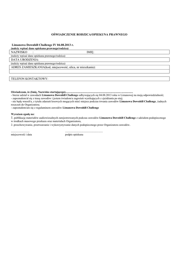 OŚWIADCZENIE RODZICA/OPIEKUNA PRAWNEGO Limanowa Downhill Challenge IV 04.08.2013 r. (należy wpisać dane opiekuna prawnego/rodzica) NAZWISKO IMIĘ: : (należy wpisać dane opiekuna prawnego/rodzica) DATA URODZENIA: (należy wpisać dane opiekuna prawnego/rodzica) ADRES ZAMIESZKANIA(kod, miejscowość, ulica, nr mieszkania): TELEFON KONTAKTOWY: Oświadczam, że (Imię, Nazwisko startującego)................................................................................. ................. - bierze udział w zawodach Limanowa Downhill Challenge odbywających się 04.08.2013 roku w Limanowej na moją odpowiedzialność; - zapoznałem/ał się z trasą zawodów i jestem świadom/a zagrożeń wynikających z zjeżdżania po niej; - nie będę wnosił/a, z tytułu zdarzeń losowych mogących mieć miejsce podczas trwania zawodów Limanowa Downhill Challenge, żadnych roszczeń do Organizatora; - zapoznałem/am się z regulaminem zawodów Limanowa Downhill Challenge Wyrażam zgodę na: 1. publikację materiałów audiowizualnych zarejestrowanych podczas zawodów Limanowa Downhill Challenge z udziałem podopiecznego w środkach masowego przekazu oraz materiałach Organizatora, 2. przechowywanie, przetwarzanie i wykorzystywanie danych podopiecznego przez Organizatora zawodów. ........................... miejscowość i data ....................................................... podpis opiekuna