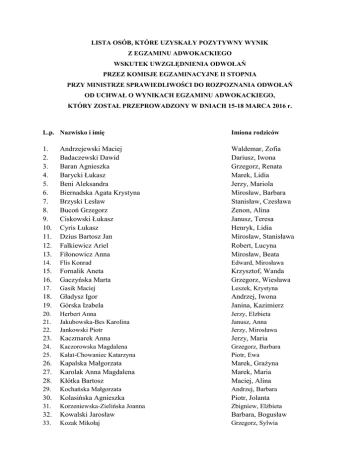 LISTA OSÓB, KTÓRE UZYSKAŁY POZYTYWNY WYNIK Z EGZAMINU ADWOKACKIEGO WSKUTEK UWZGLĘDNIENIA ODWOŁAŃ PRZEZ KOMISJE EGZAMINACYJNE II STOPNIA PRZY MINISTRZE SPRAWIEDLIWOŚCI DO ROZPOZNANIA ODWOŁAŃ OD UCHWAŁ O WYNIKACH EGZAMINU ADWOKACKIEGO, KTÓRY ZOSTAŁ PRZEPROWADZONY W DNIACH 15-18 MARCA 2016 r. L.p. Nazwisko i imię Imiona rodziców 1. 2. 3. 4. 5. 6. 7. 8. 9. 10. 11. 12. 13. Andrzejewski Maciej Badaczewski Dawid Baran Agnieszka Barycki Łukasz Beni Aleksandra Biernadska Agata Krystyna Brzyski Lesław Bucoń Grzegorz Ciskowski Łukasz Cyris Łukasz Dzius Bartosz Jan Falkiewicz Ariel Fiłonowicz Anna Waldemar, Zofia Dariusz, Iwona Grzegorz, Renata Marek, Lidia Jerzy, Mariola Mirosław, Barbara Stanisław, Czesława Zenon, Alina Janusz, Teresa Henryk, Lidia Mirosław, Stanisława Robert, Lucyna Mirosław, Beata 14. Flis Konrad Edward, Mirosława 15. 16. Fornalik Aneta Gaczyńska Marta Krzysztof, Wanda Grzegorz, Wiesława 17. Gasik Maciej Leszek, Krystyna 18. 19. Gładysz Igor Górska Izabela Andrzej, Iwona Janina, Kazimierz 20. 21. 22. Herbert Anna Jakubowska-Bes Karolina Jankowski Piotr Jerzy, Elzbieta Janusz, Anna Jerzy, Mirosława 23. Kaczmarek Anna Jerzy, Maria 24. 25. Kaczorowska Magdalena Kałat-Chowaniec Katarzyna Grzegorz, Barbara Piotr, Ewa 26. 27. 28. Kapalska Małgorzata Karolak Anna Magdalena Kłótka Bartosz Marek, Grażyna Marek, Maria Maciej, Alina 29. Kochańska Małgorzata Andrzej, Barbara 30. Kolasińska Agnieszka Piotr, Jolanta 31. Korzeniewska-Zielińska Joanna Zbigniew, Elżbieta 32. Kowalski Jarosław Barbara, Bogusław 33. Kozak Mikołaj Grzegorz, Sylwia 34. 35. Krupiński Piotr Lis Joanna Roman, Grażyna Krzysztof, Wiesława 36. 37. Mamińska Monika Matusiak Kamil Romuald, Bożena Artur, Renata 38. Michalczuk Agnieszka Andrzej, Maria 39. 40. Mikołajczuk Małgorzata Miller Michał Krzysztof, Maria Krzysztof, Beata 41. Misztal Piotr Zbigniew, Alina 42. 43. Moczydłowski Adam Mrozek Kamila Eugeniusz, Ewa Edward, Elżbieta 44. Niewiadomska Marta Marek, Regina 45. 46. 47. Nykiel Andrzej Michał Ostrowski Paweł Parjaszewski Piotr Mirosław, Bożena Barbara, Grzegorz Andrzej, Barbara 48. Piątkowski Mateusz Janusz, Anna 49. 50. 51. 52. Pietrzak Małgorzata Ewelina Piotrowski Michał Piszewski Wojciech Tadeusz Podolska Magdalena Andrzej, Maria Hubert, Ewa Tadeusz, Anna Leszek, Halina 53. 54. Powalska Joanna Przysucha Maciej Wiesław, Marzena Marek, Małgorzata 55. 56. 57. 58. 59. Puchalski Łukasz Rachuna Katarzyna Rajkowska Urszula Rojek-Dynowska Alicja Romińska Anna Jerzy, Halina Krzysztof, Renata Sylwester, Małgorzata Tomasz, Dorota Marian, Halina 60. Rudy Marek Andrzej, Jadwiga 61. 62. Rychliński Konrad Sicko Dominika Stefan, Jadwiga Andrzej, Barbara 63. Siwik Arkadiusz Wacław, Barbara 64. Słowiński Emil Jan, Marianna 65. Sobocińska Marta Piotr, Bożena 66. 67. 68. Sołek-Majuch Barbara Sprawka Grzegorz Sudoł Tomasz Stefan, Anna Jacek, Krystyna Tadeusz, Celina 69. Szarama Marcin Wojciech, Bożena 70. 71. Szczepanik Katarzyna Terlecka-Ludwiniak Agnieszka Stanisław, Krystyna Waldemar, Jolanta 72. Tomporek Karol Janusz, Aleksandra 73. 74. 75. 76. 77. 78. Tracichleb Natalia Wajszczak Przemysław Waśko Joanna Katarzyna Wilomska Hanna Witkowski Bartosz Wnuk Paweł Leszek, Krystyna Grzegorz, Bożena Bolesław, Regina Stanisław, Katarzyna Andrzej, Jolanta Marek, Mieczysława 79. Zadworny Marek Andrzej, Barbara 80. Zawadzki Piotr Andrzej, Aldona 81. 82. 83. 84. Zieliński Paweł Wojciech Ziółkowski Michał Żebrowska Agnieszka Żmijewska Izabela Wojciech, Iwona Jacek, Daniela Kazimierz, Zenobia Jan, Bożena