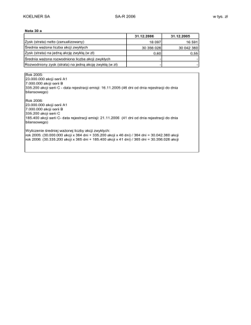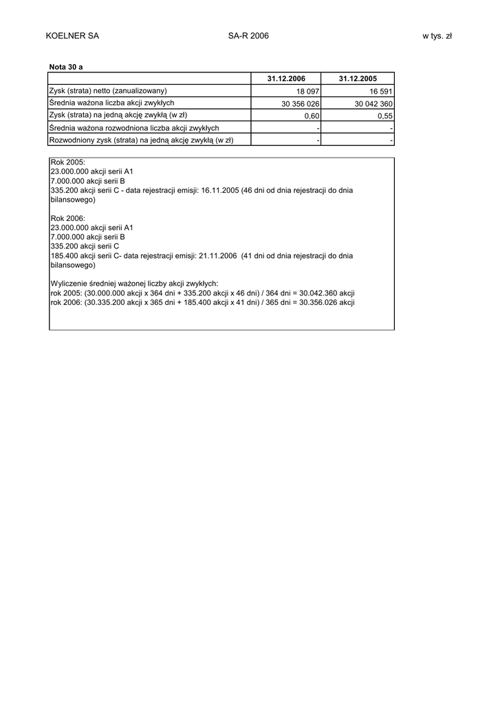 KOELNER SA SA-R 2006 w tys. zł Nota 30 a 31.12.2006 Zysk (strata) netto (zanualizowany) 31.12.2005 18 097 16 591 30 356 026 30 042 360 0,60 0,55 Średnia waŜona rozwodniona liczba akcji zwykłych - - Rozwodniony zysk (strata) na jedną akcję zwykłą (w zł) - - Średnia waŜona liczba akcji zwykłych Zysk (strata) na jedną akcję zwykłą (w zł) Rok 2005: 23.000.000 akcji serii A1 7.000.000 akcji serii B 335.200 akcji serii C - data rejestracji emisji: 16.11.2005 (46 dni od dnia rejestracji do dnia bilansowego) Rok 2006: 23.000.000 akcji serii A1 7.000.000 akcji serii B 335.200 akcji serii C 185.400 akcji serii C- data rejestracji emisji: 21.11.2006 (41 dni od dnia rejestracji do dnia bilansowego) Wyliczenie średniej waŜonej liczby akcji zwykłych: rok 2005: (30.000.000 akcji x 364 dni + 335.200 akcji x 46 dni) / 364 dni = 30.042.360 akcji rok 2006: (30.335.200 akcji x 365 dni + 185.400 akcji x 41 dni) / 365 dni = 30.356.026 akcji