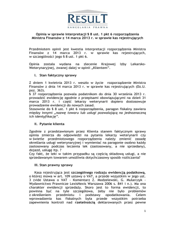 Opinia w sprawie interpretacji § 8 ust. 1 pkt 6 rozporządzenia Ministra Finansów z 14 marca 2013 r. w sprawie kas rejestrujących Przedmiotem opinii jest kwestia interpretacji rozporządzenia Ministra Finansów z 14 marca 2013 r. w sprawie kas rejestrujących, w szczególności jego § 8 ust. 1 pkt 6. Opinia została wydana na zlecenie Krajowej Weterynaryjnej, zwanej dalej w opinii „Klientem”. Izby Lekarsko- I. Stan faktyczny sprawy Z dniem 1 kwietnia 2013 r. weszło w życie rozporządzenie Ministra Finansów z dnia 14 marca 2013 r. w sprawie kas rejestrujących (Dz.U. poz. 363). § 37 rozporządzenia pozwala podatnikom do dnia 30 września 2013 r. prowadzić ewidencję zgodnie z przepisami obowiązującymi na dzień 31 marca 2013 r. i część lekarzy weterynarii dopiero dostosowuje prowadzenie ewidencji do nowych zasad. Stosownie do § 8 ust. 1 pkt 6 rozporządzenia, paragon fiskalny zawiera między innymi „nazwę towaru lub usługi pozwalającą na jednoznaczną ich identyfikację”. II. Pytanie klienta Zgodnie z przedstawionym przez Klienta stanem faktycznym sprawy opinia zmierza do odpowiedzi na pytania lekarzy weterynarii czy w świetle przedmiotowego rozporządzenia należy zmienić zasadę określania usługi weterynaryjnej i wymieniać na paragonie osobno każdy zastosowany podczas leczenia lek (zastosowany, a nie sprzedany), dojazd, usługę itp. ? Czy fakt, że leki w takim przypadku są częścią składową usługi, a nie sprzedawanym towarem umożliwia dotychczasowy sposób rozliczania? III. Stan prawny sprawy Kasa rejestrująca jest szczególnego rodzaju ewidencją podatkową, o której mowa w art. 109 ustawy o VAT, a przede wszystkim w jego ust. 3 (vide Ustawa o VAT - Komentarz Z. Modzelewski, G. Mularczyk Wydawnictwo Prawnicze LexisNexis Warszawa 2006 s. 841 i n.). Ma ona charakter ewidencji sprzedaży. Skoro jest to forma ewidencji, to powinna być na tyle szczegółowa, żeby nie było problemów z określeniem przedmiotu i podstawy opodatkowania. Celem wprowadzenia kas fiskalnych była przede wszystkim potrzeba zapewnienia kontroli nad rzetelnością deklarowanych przez pewne 1 grupy podatników podstaw opodatkowania. Stosownie do art. 111 ust. 1 ustawy o VAT podatnicy dokonujący sprzedaży na rzecz osób fizycznych nieprowadzących działalności gospodarczej oraz rolników ryczałtowych są obowiązani prowadzić ewidencję obrotu i kwot podatku należnego przy zastosowaniu kas rejestrujących. Ewidencja prowadzona na podstawie kasy rejestrującej tak, jak każda inna ewidencja prowadzona przez podatnika podatku VAT, ze względu na treść art. 112 ww. ustawy powinna być przechowywana przez podatnika do czasu upływu terminu przedawnienia zobowiązania podatkowego. Przepis ten w powiązaniu z art. 111 ust. 1 i art. 109 ust. 1-3 ustawy o VAT wypełnia dyspozycję art. 22 ust. 2 lit. a) Szóstej Dyrektywy Rady z 17 maja 1977 r. w sprawie harmonizacji ustawodawstw Państw Członkowskich w odniesieniu do podatków obrotowych - wspólny system podatku od wartości dodanej: ujednolicona podstaw wymiaru podatku, (obecnie art. 242 Dyrektywy 2006/112/WE Rady), zgodnie z którym każdy podatnik prowadzi rachunkowość w sposób wystarczająco szczegółowy, aby umożliwić zastosowanie podatku od wartości dodanej oraz kontrolę przez organ podatkowy. Stosownie do § 8 ust. 1 pkt 6 rozporządzenia z dnia 14 marca 2013 r, paragon fiskalny zawiera między innymi „nazwę towaru lub usługi pozwalającą na jednoznaczną ich identyfikację”. Skoro przepisy ustawy o VAT nie określają co należy rozumieć przez „nazwę” towaru lub usługi, odwołać należy się do słownikowego znaczenia tego słowa. Zgodnie ze „Słownikiem języka polskiego” Wydawnictwa Naukowego PWN nazwa to wyraz albo połączenie wyrazowe oznaczające kogoś lub coś. Użycie w § 8 ust. 1 pkt.6 omawianego rozporządzenia sformułowania „między innymi” oznacza „co najmniej” a więc wskazane elementy to niezbędne minimum. W normie wskazano co prawda spójnik „lub” jednak w naszej ocenie i tak jeżeli usługa jest łączona ze sprzedażą towaru to w takim przypadku na paragonie trzeba wskazać i usługę, i towar. W innym przypadku paragon nie będzie wystarczającym dla US dokumentem księgowym dla przeprowadzonych operacji. Zgodnie z brzmieniem § 8 ust. 2 rozporządzenia paragon może zawierać w miejscu określonym dla nazwy, również opis towaru lub usługi stanowiący rozwinięcie tej nazwy. Nazwy oferowanych usług oraz towarów w rozumieniu przepisów rozporządzenia a w konsekwencji umożliwiające odpowiednie przyporządkowanie stawki podatku do nazwy usługi lub towaru, określa sam podatnik, mając na względzie oferowany asortyment. Liczba znaków dla nazwy towarów w kasie musi być nie mniejsza niż 12. Przepisy nie wykluczają stosowania skrótów. Ustawodawca nie zawarł dodatkowych wymogów dla określenia pojęcia nazwy towaru, w szczególności nie wskazał, iż paragony fiskalne drukowane przez kasy rejestrujące mają zawierać nazwę jednostkową towaru. 2 Zgodnie z orzecznictwem sądów administracyjnych oraz stanowiskiem resortu finansów określenie towaru lub usługi musi odznaczać się jednoznacznością. Wskazana na paragonie nazwa towaru, lub usługi musi być na tyle zindywidualizowana, aby można było na jej podstawie, w połączeniu z ceną dokładnie określić, jaki został zakupiony towar, czy usługa. Dopiero tak skonstruowana nazwa zagwarantuje konsumentowi, prawo do otrzymania dowodu nabycia towarów lub usług z uwidocznioną kwotą podatku oraz możliwość kontroli przez kontrahenta czynności dotyczących prawidłowego ewidencjonowania transakcji i wystawienia dowodu potwierdzającego jej wykonanie. Nazwa ma odzwierciedlać kontrolną i ochronną wobec konsumenta funkcję informacyjną, jaką spełniać ma paragon fiskalny. Należy więc stosować nazwy takie jak np. pomidory, jabłka (w grupie warzywa/owoce), chleb, bułka (