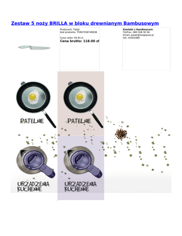 Zestaw 5 noży BRILLA w bloku drewnianym Bambusowym Producent: Tadar Kod produktu: T5907558749038 Cena netto: 95,93 zł Cena brutto: 118.00 zł Kontakt z Handlowcem: Tel/Fax: (68) 506 50 56 Email: [email protected] GG: 45303488 Komplet noży BRILLA - Tadar Kod produktu: T5907558749038 Komplet noży BRILLA Zestaw noży został wykonany z najwyższej jakości stali nierdzewnej z wyprofilowaną rękojeścią,z solidnego tworzywa sztucznego.Gustowny i niezwykle wytrzymały komplet noży w drewnianym bloku. Noże ładnie się prezentują się w kuchni. W skład kompletu wchodzi: ● ● ● ● ● drewniany blok na noże nóż kucharski nóż do chleba 2 noże uniwersalne nóż do jarzyn / owoców Informacje dodatkowe: ● ● ● ● ● ● ● ● ● ● ● nóż kucharski - długość ostrza 20 cm nóż do chleba - długość ostrza 20 cm nóż uniwersalny - długość ostrza 20 cm nóż uniwersalny - długość ostrza 12 cm nóż do jarzyn/owoców - długość ostrza 9 cm noże kuchenne wykonane ze stali nierdzewnej blok na noże wykonany z drewna bambusowego kolor wybarwienia bloku: naturalny rękojeść: tworzywo sztuczne w kolorze białym ilość elementów w zestawie: 6 elem. ( blok + 5 noży) opakowanie: kolorowy karton Użytkowanie: ● kontakt z żywnością Kod produktu:T5907558749038 ID produktu:156647 Granos Group sp. z o.o. ul. Sulechowska 4a budynek 45 65-001 Zielona Góra