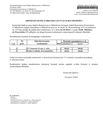 Komornik Sądowy przy Sądzie Rejonowym w Mikołowie Grzegorz Sokół Kancelaria Komornicza w Mikołowie 43-190 Mikołów, ul. Kard. St. Wyszyńskiego 4/51 W odpowiedzi podać: sygn. akt Km 873/16 Mikołów, dnia 23-09-2016 r. *8016092300631* tel/fax: (32) 2260702 email: [email protected] www: www.komornik-mikolow.pl OBWIESZCZENIE O DRUGIEJ LICYTACJI RUCHOMOŚCI Komornik Sądowy przy Sądzie Rejonowym w Mikołowie Grzegorz Sokół Kancelaria Komornicza w Mikołowie mający kancelarię w Mikołowie przy ul. ul. Kard. St. Wyszyńskiego 4/51 na podstawie art. 875 kpc podaje do publicznej wiadomości, że w dniu 26-10-2016 r. o godz 10.00 Mikołów, ul. Pszczyńska 1/3 odbędzie się druga licytacja ruchomości, stanowiących własność dłużnika. Przedmiotem licytacji są następujące ruchomości: Nr prot. L.p. Opis licytowanej ruchomości Wartość szacunkowa w zł. ilość jednostkowa łączna 1 1 TV Panasonic 42 cale, 2 - letni 1 500,00 500,00 2 2 Szafka 2-szuflady, drewnopodobna 1 100,00 100,00 Ceną wywoławczą każdej ruchomości w powyższej licytacji jest 1/2 wartości szacunkowej podanej w obwieszczeniu. Ruchomości będące przedmiotem niniejszej licytacji można oglądać w dniu licytacji w miejscu zamieszkania dłużnika. Komornik Sądowy Grzegorz Sokół Do wiadomości: - dłużnik; - wierzyciel; - Starostwo Powiatowe w Mikołowie - tablica ogłoszeń; - Urząd Skarbowy w Mikołowie - tablica ogłoszeń; - Sąd Rejonowy w Mikołowie - tablica ogłoszeń;