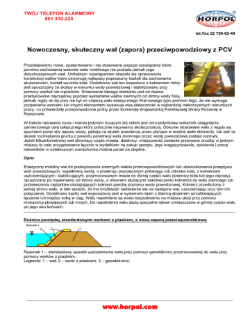 TWÓJ TELEFON ALARMOWY 801 310-224 tel./fax 22 750-62-49 Nowoczesny, skuteczny wał (zapora) przeciwpowodziowy z PCV Przedstawiamy nowe, opatentowane i nie stosowane jeszcze rozwiązanie które pomimo zachowania walorów wału mobilnego nie posiada jednak jego dotychczasowych wad. Unikalnym rozwiązaniem okazało się opracowanie konstrukcji wałów które utrzymują najlepszy poprzeczny kształt dla zachowania skuteczności, kształt wycinka koła. Dodatkowo wał ten zespolono z kołnierzem który jest opuszczany ze skarpy w kierunku wody powodziowej i stabilizowany przy pomocy szpilek lub ciężarków. Stosowanie takiego elementu jest od dawna praktykowane najczęściej poprzez wykładanie wałów ziemnych od strony wody folią jednak nigdy do tej pory nie był on częścią wału elastycznego Wał nowego typu pomimo tego, że nie wymaga podpierania workami lub innymi elementami wykazuje swą stateczność w najbardziej niekorzystnych warunkach pracy, co potwierdziły przeprowadzone próby przez Komendę Wojewódzką Państwowej Straży Pożarnej w Rzeszowie. W trakcie ratowania życia i mienia jedynym liczącym się celem jest zero-jedynkowy wskaźnik osiągnięcia zamierzonego celu taktycznego który potocznie nazywamy skutecznością. Obecnie stosowane wały z reguły są spychane przez siły naporu wody, pękają na skutek przedarcia przez płynące w wodzie stałe elementy, lub wał na skutek rozmiękania gruntu z powodu penetracji wału ziemnego przez wodę powodziową zostaje rozmyty. Jeżeli kilkukilometrowy wał chroniący część miasta, dzielnicy, miejscowość zostanie przerwany choćby w jednym miejscu to całe przygotowanie łącznie w wydatkiem na zakup sprzętu, jego magazynowanie, szkolenie i pracę ratowników w ostatecznym rozrachunku można uznać za zbędne. Opis: Elastyczny mobilny wał do podwyższania ziemnych wałów przeciwpowodziowych lub ukierunkowania przepływu wód powodziowych, wypełniany wodą, o przekroju poprzecznym półokręgu lub odcinka koła, z kołnierzem uszczelniającym i stabilizującym, przymocowanym trwale do dolnej części wału (średnicy koła lub jego cięciwy), opuszczany po napełnieniu od strony wody, z otworami służącymi zakotwiczeniu kołnierza do wału ziemnego lub podwieszenia ciężarków obciążających kołnierz poniżej poziomu wody powodziowej. Kołnierz przedłużony z jednej strony wału, w taki sposób, że ma możliwość nakładania się na następny wał, uszczelniając przy tym ich połączenie. Dodatkowo każdy wał wyposażony jest w systemem taśm z klamrą-stoperem umożliwiających łączenie ich między sobą w ciąg. Wały napełniane są woda bezpośrednio na miejscu akcji przy pomocy motopomp pływających lub innych. Do napełnienia wału służą specjalne rękaw umieszczone w górnej części wału po jego obu końcach. Rożnica pomiędzy standardowymi workami z piaskiem, a nową zaporą przeciwpowodziową: Rysunek 1 – standardowy sposób uszczelnienia wału przy pomocy geowłókniny przymocowanej do wału przy pomocy worków z piaskiem. Legenda: 1 – wał; 2 – worki z piaskiem; 3 – geowłóknina; Standardowe worki z piaskiem nie zapewniają szczelności zbudowanego wału /foto/: Rysunek 2 – nowoczesny sposób uszczelniania wału przy pomocy elastycznego wału z kołnierzem. Legenda: 4 – wał z PCV; 5 – kołnierz; 6 - obciążnik Nowe rozwiązanie naszej firmy GWARANTUJE SZCZELNOŚĆ WAŁU! /foto/ Opis zasada działania: Z obliczeń wynika, że przy najmniej korzystnym sposobie ułożenia wału wraz z kołnierzem na jednej poziomej płaszczyźnie przy szerokości kołnierza równej wysokości wału, siły nacisku hydrostatycznego zarówno na wał jak również na kołnierz dociskające je do gruntu są większe niż siła wody spychająca wał. Ponieważ standardowe szerokości kołnierza są dwukrotnie większe stabilizacja wału napełnionego wodą przed zepchnięciem go w pozycji roboczej jest zapewniona. Dodatkowo kołnierz posiada przygotowane oczka do jego kotwiczenia do gruntu, do stałych elementów terenu lub obciążenia ciężarkami np: workiem piasku, stabilizujące dodatkowo wał w pozycji roboczej. Przy ułożeniu wału w taki sposób, że kołnierz zakotwiczony jest na wale ziemnym po skarpie wału ziemnego w dół, siły stabilizujące wał w pozycji roboczej są wielokrotnie większe od siły spychającej go z pozycji roboczej. W takiej konfiguracji nawet siły dynamiczne płynącej wody działające na prawidłowo sprawiony wał nie są w stanie przesunąć go z pozycji roboczej. Nadmienić należy że uszczelnione połączenie kołnierza z wałem powoduje brak nasiąkania wału wodą powodziową a nawet posiada efekt odwrotny. Napór hydrostatyczny na wał oraz kołnierz jak również ciężar samego wału wypełnionego wodą przy braku możliwości penetracji wału ziemnego przez wodę powoduje wyciskanie wody z wału ziemnego i dodatkową jego stabilizację. Podstawowe dane techniczne: Standardowo wały produkowane są o długościach 5; 10; 15 i 20 mb. i promieniu r=50; 80, 100 cm. Na życzenie zamawiającego szerokość kołnierza może być dowolna. Rękaw może być zakończony oraz uszczelniony na dwa sposoby: 1) złącze strażackie typu STORZ 52 lub 75 w zależności od wielkości wału (długość, szerokość – pojemność). Złącze zakończone nasadą zamykającą i uszczelniającą. W tym przypadku bezpośrednio do wału podłącza się standardowy wąż strażacki, którym napełnia się wał. 2) rękaw „nieuzbrojony”, napełniany przy pomocy standardowej prądownicy strażackiej. Po napełnieniu rękawa zawija się i uszczelnia przez zaciśniecie na nim standardowego, jednorazowego paska zaciskowego z tworzywa sztucznego. Do każdego wału dodawane jest co najmniej dziesięć pasków. Nowe paski dostępne są w każdym punkcie z artykułami elektroinstalacyjnymi. Dzięki zastosowaniu takiego rozwiązania znacznie zmniejszą się koszty wykonania 
