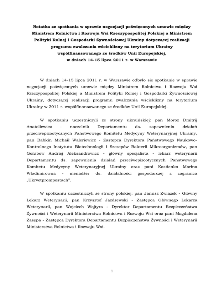 Notatka ze spotkania w sprawie negocjacji poświęconych umowie między Ministrem Rolnictwa i Rozwoju Wsi Rzeczypospolitej Polskiej a Ministrem Polityki Rolnej i Gospodarki Żywnościowej Ukrainy dotyczącej realizacji programu zwalczania wścieklizny na terytorium Ukrainy współfinansowanego ze środków Unii Europejskiej, w dniach 14-15 lipca 2011 r. w Warszawie W dniach 14-15 lipca 2011 r. w Warszawie odbyło się spotkanie w sprawie negocjacji poświęconych umowie między Ministrem Rolnictwa i Rozwoju Wsi Rzeczypospolitej Polskiej a Ministrem Polityki Rolnej i Gospodarki Żywnościowej Ukrainy, dotyczącej realizacji programu zwalczania wścieklizny na terytorium Ukrainy w 2011 r. współfinansowanego ze środków Unii Europejskiej. W spotkaniu uczestniczyli ze strony ukraińskiej: pan Moroz Dmitrij Anatoliewicz - naczelnik Departamentu ds. zapewnienia działań przeciwepizootycznych Państwowego Komitetu Medycyny Weterynaryjnej Ukrainy, pan Babkin Michaił Waleriewicz - Zastępca Dyrektora Państwowego NaukowoKontrolnego Instytutu Biotechnologii i Szczepów Bakterii Mikroorganizmów, pan Gołubow Andriej Departamentu Komitetu Aleksandrowicz ds. zapewnienia Medycyny Władimirowna - - działań Weterynaryjnej menadżer główny ds. specjalista - lekarz weterynarii przeciwepizootycznych Ukrainy oraz działalności pani Państwowego Kostienko gospodarczej z Marina zagranicą „Ukrvetprompostach”. W spotkaniu uczestniczyli ze strony polskiej: pan Janusz Związek - Główny Lekarz Weterynarii, pan Krzysztof Jażdżewski - Zastępca Głównego Lekarza Weterynarii, pan Wojciech Wojtyra - Dyrektor Departamentu Bezpieczeństwa Żywności i Weterynarii Ministerstwa Rolnictwa i Rozwoju Wsi oraz pani Magdalena Zasępa - Zastępca Dyrektora Departamentu Bezpieczeństwa Żywności i Weterynarii Ministerstwa Rolnictwa i Rozwoju Wsi. 1 Podczas spotkania, w wyniku negocjacji został opracowany, uzgodniony i parafowany przez stronę polską i ukraińską ostateczny projekt wyżej wymienionej umowy, która dotyczy utworzenia na terytorium Ukrainy wzdłuż granicy z Polską strefy buforowej doustnych szczepień lisów wolno żyjących przeciwko wściekliźnie. Zgodnie z projektem planowane jest przeprowadzenie jednej akcji szczepień w przedmiotowej strefie w okresie jesiennym w 2011 r. Realizacja programu zwalczania wścieklizny na terytorium Ukrainy ma na celu ograniczenie występowania choroby, a w związku z tym zabezpieczenie terytorium Polski, a tym samym Unii Europejskiej przed wnikaniem wirusa wścieklizny za pośrednictwem lisów wolno żyjących przemieszczających się z terytorium Ukrainy. 2