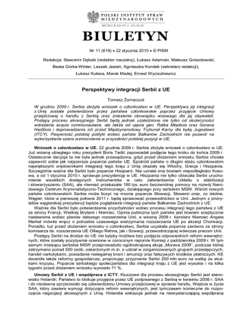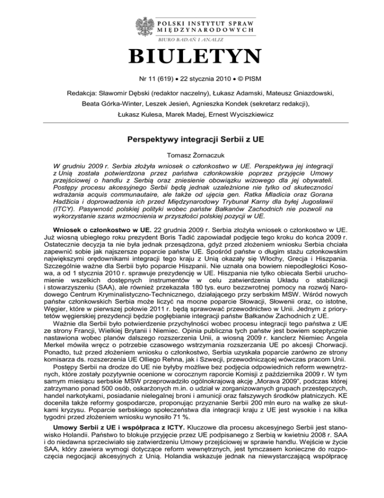 BIURO BADAŃ I ANALIZ BIULETYN Nr 11 (619) 22 stycznia 2010 © PISM Redakcja: Sławomir Dębski (redaktor naczelny), Łukasz Adamski, Mateusz Gniazdowski, Beata Górka-Winter, Leszek Jesień, Agnieszka Kondek (sekretarz redakcji), Łukasz Kulesa, Marek Madej, Ernest Wyciszkiewicz Perspektywy integracji Serbii z UE Tomasz Żornaczuk W grudniu 2009 r. Serbia złożyła wniosek o członkostwo w UE. Perspektywa jej integracji z Unią została potwierdzona przez państwa członkowskie poprzez przyjęcie Umowy przejściowej o handlu z Serbią oraz zniesienie obowiązku wizowego dla jej obywateli. Postępy procesu akcesyjnego Serbii będą jednak uzależnione nie tylko od skuteczności wdrażania acquis communautaire, ale także od ujęcia gen. Ratka Mladicia oraz Gorana Hadžicia i doprowadzenia ich przed Międzynarodowy Trybunał Karny dla byłej Jugosławii (ITCY). Pasywność polskiej polityki wobec państw Bałkanów Zachodnich nie pozwoli na wykorzystanie szans wzmocnienia w przyszłości polskiej pozycji w UE. Wniosek o członkostwo w UE. 22 grudnia 2009 r. Serbia złożyła wniosek o członkostwo w UE. Już wiosną ubiegłego roku prezydent Boris Tadić zapowiadał podjęcie tego kroku do końca 2009 r. Ostatecznie decyzja ta nie była jednak przesądzona, gdyż przed złożeniem wniosku Serbia chciała zapewnić sobie jak najszersze poparcie państw UE. Spośród państw o długim stażu członkowskim największymi orędownikami integracji tego kraju z Unią okazały się Włochy, Grecja i Hiszpania. Szczególnie ważne dla Serbii było poparcie Hiszpanii. Nie uznała ona bowiem niepodległości Kosowa, a od 1 stycznia 2010 r. sprawuje prezydencję w UE. Hiszpania nie tylko obiecała Serbii uruchomienie wszelkich dostępnych instrumentów w celu zatwierdzenia Układu o stabilizacji i stowarzyszeniu (SAA), ale również przekazała 180 tys. euro bezzwrotnej pomocy na rozwój Narodowego Centrum Kryminalistyczno-Technicznego, działającego przy serbskim MSW. Wśród nowych państw członkowskich Serbia może liczyć na mocne poparcie Słowacji, Słowenii oraz, co istotne, Węgier, które w pierwszej połowie 2011 r. będą sprawować przewodnictwo w Unii. Jednym z priorytetów węgierskiej prezydencji będzie pogłębianie integracji państw Bałkanów Zachodnich z UE. Ważnie dla Serbii było potwierdzenie przychylności wobec procesu integracji tego państwa z UE ze strony Francji, Wielkiej Brytanii i Niemiec. Opinia publiczna tych państw jest bowiem sceptycznie nastawiona wobec planów dalszego rozszerzenia Unii, a wiosną 2009 r. kanclerz Niemiec Angela Merkel mówiła wręcz o potrzebie czasowego wstrzymania rozszerzania UE po akcesji Chorwacji. Ponadto, tuż przed złożeniem wniosku o członkostwo, Serbia uzyskała poparcie zarówno ze strony komisarza ds. rozszerzenia UE Olliego Rehna, jak i Szwecji, przewodniczącej wówczas pracom Unii. Postępy Serbii na drodze do UE nie byłyby możliwe bez podjęcia odpowiednich reform wewnętrznych, które zostały pozytywnie ocenione w corocznym raporcie Komisji z października 2009 r. W tym samym miesiącu serbskie MSW przeprowadziło ogólnokrajową akcję „Morava 2009”, podczas której zatrzymano ponad 500 osób, oskarżonych m.in. o udział w zorganizowanych grupach przestępczych, handel narkotykami, posiadanie nielegalnej broni i amunicji oraz fałszywych środków płatniczych. KE doceniła także reformy gospodarcze, proponując przyznanie Serbii 200 mln euro na walkę ze skutkami kryzysu. Poparcie serbskiego społeczeństwa dla integracji kraju z UE jest wysokie i na kilka tygodni przed złożeniem wniosku wynosiło 71 %. Umowy Serbii z UE i współpraca z ICTY. Kluczowe dla procesu akcesyjnego Serbii jest stanowisko Holandii. Państwo to blokuje przyjęcie przez UE podpisanego z Serbią w kwietniu 2008 r. SAA i do niedawna sprzeciwiało się zatwierdzeniu Umowy przejściowej w sprawie handlu. Wejście w życie SAA, który zawiera wymogi dotyczące reform wewnętrznych, jest tymczasem konieczne do rozpoczęcia negocjacji akcesyjnych z Unią. Holandia wskazuje jednak na niewystarczającą współpracę 2123 Polski Instytut Spraw Międzynarodowych władz Serbii z ITCY. Uzależnia swoją zgodę na integrację tego kraju z UE od aresztowania generała Ratka Mladicia, przywódcy bośniackich Serbów oskarżonego o ludobójstwo, oraz Gorana Hadžicia, byłego prezydenta Republiki Serbskiej Krajiny, i postawienia ich przed Trybunałem w Hadze. Ostatnio Holandia złagodziła jednak swoje stanowisko, czego przejawem była zgoda na przyjęcie przejściowej umowy handlowej, która następnie weszła w życie 1 stycznia 2010 r. Miał na to wpływ raport głównego prokuratora ITCY Serge’a Brammertza z grudnia 2009 r., w którym po raz kolejny podkreślił on coraz lepsze współdziałanie Serbii z Trybunałem. Mimo tych pozytywnych opinii, w związku z pozostawaniem Mladicia na wolności, jak dotąd żaden kraj UE nie ratyfikował SAA z Serbią. Zniesienie reżimu wizowego. Od 19 grudnia 2009 r. między Serbią, Macedonią i Czarnogórą a krajami strefy Schengen istnieje ruch bezwizowy. Dla mieszkańców Serbii, poza swobodą podróżowania, fakt ten ma również duże znaczenie psychologiczne. Potwierdzeniem tego był udział ministra spraw zagranicznych Vuka Jeremicia w symbolicznym przekroczeniu granicy z Węgrami tuż po północy 19 grudnia. Obowiązek wizowy ciążył na mieszkańcach Serbii od 17 lat. Wcześniej, jako obywatele Jugosławii, Serbowie mogli swobodnie podróżować po Europie Zachodniej. Proces mający na celu zniesienie obowiązku wizowego dla państw Bałkanów Zachodnich (poza Chorwacją) zapoczątkowano wiosną 2008 r., kiedy UE przedstawiła tzw. mapę drogową zawierającą wytyczne dotyczące przeprowadzenia niezbędnych reform, przede wszystkim w obszarze spraw wewnętrznych i sądownictwa. Warunkami zniesienia wiz były m.in.: wprowadzenie paszportów biometrycznych, bardziej skuteczna ochrona granic, wal
