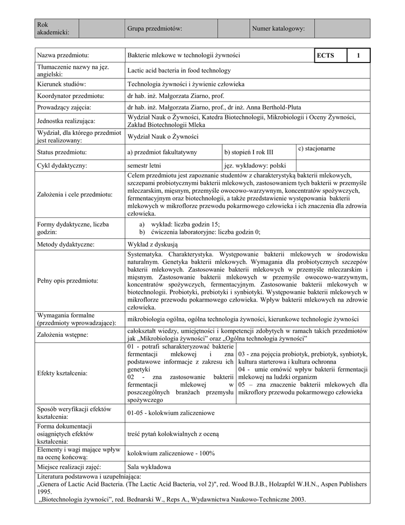 Rok akademicki: Grupa przedmiotów: Nazwa przedmiotu: Bakterie mlekowe w technologii żywności Tłumaczenie nazwy na jęz. angielski: Kierunek studiów: Numer katalogowy: ECTS Lactic acid bacteria in food technology Technologia żywności i żywienie człowieka Koordynator przedmiotu: dr hab. inż. Małgorzata Ziarno, prof. Prowadzący zajęcia: dr hab. inż. Małgorzata Ziarno, prof., dr inż. Anna Berthold-Pluta Wydział Nauk o Żywności, Katedra Biotechnologii, Mikrobiologii i Oceny Żywności, Zakład Biotechnologii Mleka Jednostka realizująca: 1 Wydział, dla którego przedmiot Wydział Nauk o Żywności jest realizowany: a) przedmiot fakultatywny Cykl dydaktyczny: semestr letni jęz. wykładowy: polski Celem przedmiotu jest zapoznanie studentów z charakterystyką bakterii mlekowych, szczepami probiotycznymi bakterii mlekowych, zastosowaniem tych bakterii w przemyśle mleczarskim, mięsnym, przemyśle owocowo-warzywnym, koncentratów spożywczych, fermentacyjnym oraz biotechnologii, a także przedstawienie występowania bakterii mlekowych w mikroflorze przewodu pokarmowego człowieka i ich znaczenia dla zdrowia człowieka. Założenia i cele przedmiotu: Formy dydaktyczne, liczba godzin: Metody dydaktyczne: Pełny opis przedmiotu: Wymagania formalne (przedmioty wprowadzające): Założenia wstępne: Efekty kształcenia: b) stopień I rok III c) stacjonarne Status przedmiotu: a) wykład: liczba godzin 15; b) ćwiczenia laboratoryjne: liczba godzin 0; Wykład z dyskusją Systematyka. Charakterystyka. Występowanie bakterii mlekowych w środowisku naturalnym. Genetyka bakterii mlekowych. Wymagania dla probiotycznych szczepów bakterii mlekowych. Zastosowanie bakterii mlekowych w przemyśle mleczarskim i mięsnym. Zastosowanie bakterii mlekowych w przemyśle owocowo-warzywnym, koncentratów spożywczych, fermentacyjnym. Zastosowanie bakterii mlekowych w biotechnologii. Probiotyki, prebiotyki i synbiotyki. Występowanie bakterii mlekowych w mikroflorze przewodu pokarmowego człowieka. Wpływ bakterii mlekowych na zdrowie człowieka. mikrobiologia ogólna, ogólna technologia żywności, kierunkowe technologie żywności całokształt wiedzy, umiejętności i kompetencji zdobytych w ramach takich przedmiotów jak „Mikrobiologia żywności” oraz „Ogólna technologia żywności” 01 - potrafi scharakteryzować bakterie fermentacji mlekowej i zna 03 - zna pojęcia probiotyk, prebiotyk, synbiotyk, podstawowe informacje z zakresu ich kultura starterowa i kultura ochronna genetyki 04 - umie omówić wpływ bakterii fermentacji 02 - zna zastosowanie bakterii mlekowej na ludzki organizm fermentacji mlekowej w 05 – zna znaczenie bakterii mlekowych dla poszczególnych branżach przemysłu mikroflory przewodu pokarmowego człowieka spożywczego Sposób weryfikacji efektów 01-05 - kolokwium zaliczeniowe kształcenia: Forma dokumentacji osiągniętych efektów treść pytań kolokwialnych z oceną kształcenia: Elementy i wagi mające wpływ kolokwium zaliczeniowe - 100% na ocenę końcową: Miejsce realizacji zajęć: Sala wykładowa Literatura podstawowa i uzupełniająca: „Genera of Lactic Acid Bacteria. (The Lactic Acid Bacteria, vol 2)", red. Wood B.J.B., Holzapfel W.H.N., Aspen Publishers 1995. „Biotechnologia żywności”, red. Bednarski W., Reps A., Wydawnictwa Naukowo-Techniczne 2003. „Handbook of Fermented Functional Foods”, red. Farnworth E.R., CRC Press 2003. Ziarno M. 2005. Kultury starterowe w przetwórstwie żywności pochodzenia roślinnego. Przemysł Spożywczy 11, 28-30 Ziarno M. 2005. Kultury starterowe w przetwórstwie żywności pochodzenia zwierzęcego. Przemysł Spożywczy 4, 24-27, 52 Ziarno M., 2007. Charakterystyka komercyjnych kultur starterowych stosowanych w przemyśle mleczarskim. Medycyna Wet., 63 (8), 909-913 Ziarno M., Zaręba D., 2008. Charakterystyka komercyjnych kultur startowych stosowanych w przetwórstwie mięsa. Medycyna Wet. 64 (9), 1078-1082 Ziarno M. 2006. Kultury ochronne w technologii mleczarskiej. Przegląd Mleczarski, 5, 8-10 UWAGI: Wskaźniki ilościowe charakteryzujące moduł/przedmiot: Szacunkowa sumaryczna liczba godzin pracy studenta (kontaktowych i pracy własnej) niezbędna dla osiągnięcia zakładanych efektów kształcenia - na tej podstawie należy wypełnić pole ECTS: Łączna liczba punktów ECTS, którą student uzyskuje na zajęciach wymagających bezpośredniego udziału nauczycieli akademickich: Łączna liczba punktów ECTS, którą student uzyskuje w ramach zajęć o charakterze praktycznym, takich jak zajęcia laboratoryjne, projektowe, itp.: 25 h 1 ECTS 0 ECTS Tabela zgodności kierunkowych efektów kształcenia efektami przedmiotu: Nr /symbol efektu 01 02 03 04 05 Wymienione w wierszu efekty kształcenia: potrafi scharakteryzować bakterie fermentacji mlekowej i zna podstawowe informacje z zakresu ich genetyki zna zastosowanie bakterii fermentacji mlekowej w poszczególnych branżach przemysłu spożywczego zna pojęcia probiotyk, prebiotyk, synbiotyk, kultura starterowa i kultura ochronna umie omówić wpływ bakterii fermentacji mlekowej na ludzki organizm rozumie znaczenie bakterii mlekowych dla mikroflory przewodu pokarmowego człowieka Odniesienie do efektów dla programu kształcenia na kierunku K_W02, K_W03, K_K01 K_W03, K_W06, K_U10, K_K04 K_W06 K_W15 K_W02, K_W15