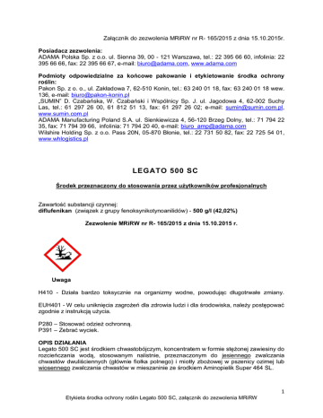 Załącznik do zezwolenia MRiRW nr R- 165/2015 z dnia 15.10.2015r. Posiadacz zezwolenia: ADAMA Polska Sp. z o.o. ul. Sienna 39, 00 - 121 Warszawa, tel.: 22 395 66 60, infolinia: 22 395 66 66, fax: 22 395 66 67, e-mail: [email protected], www.adama.com Podmioty odpowiedzialne za końcowe pakowanie i etykietowanie środka ochrony roślin: Pakon Sp. z o. o., ul. Zakładowa 7, 62-510 Konin, tel.: 63 240 01 18, fax: 63 240 01 18 wew. 136, e-mail: [email protected] „SUMIN” D. Czabańska, W. Czabański i Wspólnicy Sp. J. ul. Jagodowa 4, 62-002 Suchy Las, tel.: 61 297 26 00, 61 812 51 13, fax: 61 297 26 02; e-mail: [email protected], www.sumin.com.pl ADAMA Manufacturing Poland S.A. ul. Sienkiewicza 4, 56-120 Brzeg Dolny, tel.: 71 794 22 35, fax: 71 794 39 66, infolinia: 71 794 20 40, e-mail: [email protected] Wilshire Holding Sp. z o.o. Pass 20N, 05-870 Błonie, tel.: 22 731 50 82, fax: 22 725 54 01, www.whlogistics.pl LEGATO 500 SC Środek przeznaczony do stosowania przez użytkowników profesjonalnych Zawartość substancji czynnej: diflufenikan (związek z grupy fenoksynikotynoanilidów) - 500 g/l (42,02%) Zezwolenie MRiRW nr R- 165/2015 z dnia 15.10.2015 r. Uwaga H410 - Działa bardzo toksycznie na organizmy wodne, powodując długotrwałe zmiany. EUH401 - W celu uniknięcia zagrożeń dla zdrowia ludzi i dla środowiska, należy postępować zgodnie z instrukcją użycia. P280 – Stosować odzież ochronną. P391 – Zebrać wyciek. OPIS DZIAŁANIA Legato 500 SC jest środkiem chwastobójczym, koncentratem w formie stężonej zawiesiny do rozcieńczania wodą, stosowanym nalistnie, przeznaczonym do jesiennego zwalczania chwastów dwuliściennych (głównie fiołka polnego) i miotły zbożowej w pszenicy ozimej lub wiosennego zwalczania chwastów w mieszaninie ze środkiem Aminopielik Super 464 SL. 1 Etykieta środka ochrony roślin Legato 500 SC, załącznik do zezwolenia MRiRW Środek przeznaczony do stosowania przy użyciu samobieżnych lub ciągnikowych opryskiwaczy polowych. DZIAŁANIE NA CHWASTY Środek Legato 500 SC pobierany jest głównie poprzez liście oraz częściowo przez korzenie chwastów. Działaniu środka sprzyja optymalna wilgotność gleby. Największy efekt chwastobójczy uzyskuje się stosując środek we wczesnych fazach rozwojowych chwastów, to jest w czasie kiełkowania lub krótko po ich wschodach, w fazie siewek. Legato 500 SC w dawce 0,2-0,3 l/ha Chwasty wrażliwe: fiołek polny, gwiazdnica pospolita, przetacznik bluszczykowy, tasznik pospolity. Chwasty średnio wrażliwe: miotła zbożowa. Chwasty odporne: samosiewy rzepaku. STOSOWANIE ŚRODKA Pszenica ozima Maksymalna dawka środka dla jednorazowego stosowania: 0,3 l/ha. Zalecana dawka środka dla jednorazowego stosowania: 0,2-0,3 l/ha. Wyższą z zalecanych dawek stosować gdy chwasty znajdują się w późniejszych fazach rozwojowych oraz w celu zwalczenia miotły zbożowej. Termin stosowania: Środek stosować jesienią w fazie 2-3 liści właściwych pszenicy ozimej (BBCH 12-13). lub W celu kompleksowego zwalczania rocznych chwastów dwuliściennych oraz rozszerzenia spektrum zwalczanych chwastów środek Legato 500 SC stosować łącznie ze środkiem Aminopielik Super 464 SL wiosną od początku fazy gdy widoczne są 3 rozkrzewienia do początku fazy końca krzewienia (BBCH 23-28) w dawce: Maksymalna / zalecana dawka środka dla jednorazowego stosowania: Legato 500 SC 0,1 l/ha + Aminopielik Super 464 SL 1 l/ha. Uwaga: środek ochrony roślin Legato 500 SC w dawce 0,1 l/ha nie zwalcza miotły zbożowej. Zalecana ilość wody: 200-300 l/ha. Zalecane opryskiwanie: średniokropliste. Maksymalna liczba zabiegów w sezonie wegetacyjnym: 1. ŚRODKI OSTROŻNOŚCI I ZALECENIA STOSOWANIA ZWIĄZANE Z DOBRĄ PRAKTYKĄ ROLNICZĄ 1. Środka nie stosować: - w zbożach z wsiewką roślin motylkowatych, - na rośliny osłabione lub uszkodzone przez choroby, szkodniki, przymrozki lub suszę. 2. Podczas stosowania środka nie dopuścić do: - znoszenia cieczy użytkowej na sąsiednie rośliny uprawne, - nakładania się cieczy użytkowej na stykach pasów zabiegowych i uwrociach. NASTĘPSTWO ROŚLIN 2 Etykieta środka ochrony roślin Legato 500 SC, załącznik do zezwolenia MRiRW Środek nie stwarza zagrożenia dla roślin uprawianych następczo. W przypadku konieczności wcześniejszego zlikwidowania plantacji potraktowanej środkiem w wyniku uszkodzenia roślin przez mrozy, szkodniki lub choroby gdy wiosną zaorano plantację nie uprawiać buraków, grochu (na lekkich glebach), rzepaku, owsa, warzyw cebulowych i roślin kapustnych. Pozostałe rośliny można uprawiać po wykonaniu orki na głębokość 20 cm. SPORZĄDZANIE CIECZY UŻYTKOWEJ Przed przystąpieniem do sporządzania cieczy użytkowej dokładnie ustalić potrzebną jej ilość. Zawartością opakowania przed użyciem wstrząsnąć. Odmierzoną ilość środka wlać do zbiornika opryskiwacza napełnionego częściowo wodą (z włączonym mieszadłem) i uzupełnić wodą do potrzebnej ilości. Po wlaniu środka do zbiornika opryskiwacza nie wyposażonego w mieszadło hydrauliczne ciecz w zbiorniku mechanicznie wymieszać. Opróżnione opakowania przepłukać trzykrotnie wodą, a popłuczyny wlać do zbiornika opryskiwacza z cieczą użytkową. W przypadku przerw w opryskiwaniu przed ponownym przystąpieniem do pracy dokładnie wymieszać ciecz użytkową w zbiorniku opryskiwacza. POSTĘPOWANIE Z RESZTKAMI CIECZY UŻYTKOWEJ I MYCIE APARATURY Z resztkami cieczy użytkowej po zabiegu należy postępować w sposób ograniczający ryzyko skażenia wód powierzchniowych i podziemnych, w rozumieniu przepisów Prawa wodnego oraz skażenia gruntu, tj.: – po uprzednim rozcieńczeniu zużyć na powierzchni, na której przeprowadzono zabieg, jeżeli jest to możliwe, lub, – unieszkodliwić z wykorzystaniem rozwiązań technicznych zapewniających biologiczną degradację substancji czynnych środków ochrony roślin, lub, – unieszkodliwić w inny sposób, zgodn