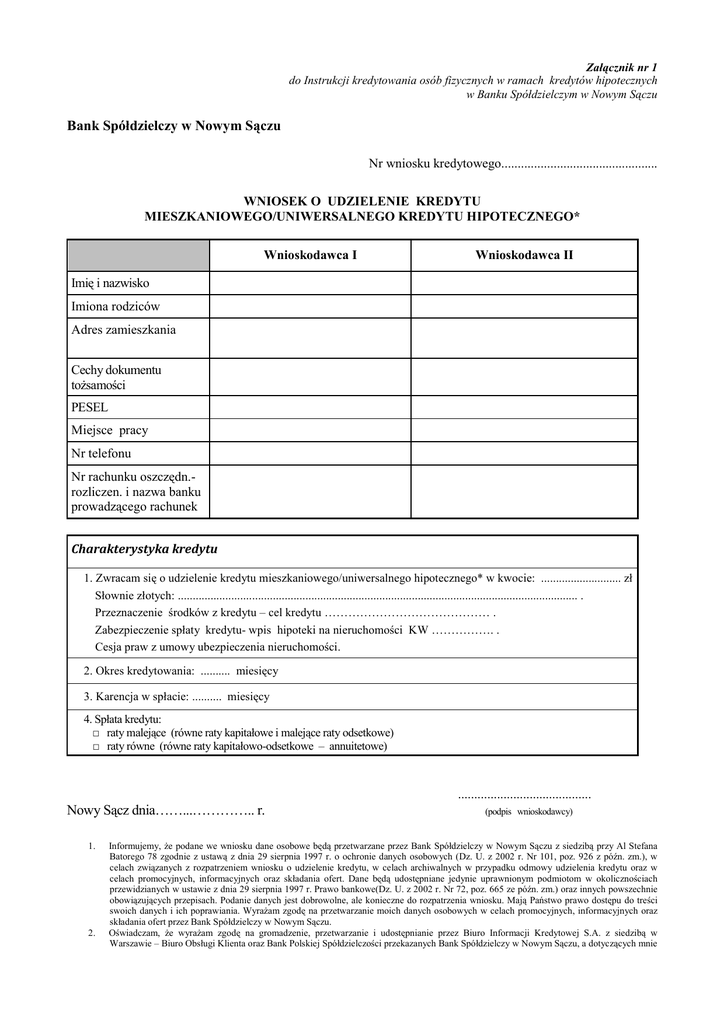 Załącznik nr 1 do Instrukcji kredytowania osób fizycznych w ramach kredytów hipotecznych w Banku Spółdzielczym w Nowym Sączu Bank Spółdzielczy w Nowym Sączu Nr wniosku kredytowego................................................ WNIOSEK O UDZIELENIE KREDYTU MIESZKANIOWEGO/UNIWERSALNEGO KREDYTU HIPOTECZNEGO* Wnioskodawca I Wnioskodawca II Imię i nazwisko Imiona rodziców Adres zamieszkania Cechy dokumentu toŜsamości PESEL Miejsce pracy Nr telefonu Nr rachunku oszczędn.rozliczen. i nazwa banku prowadzącego rachunek Charakterystyka kredytu 1. Zwracam się o udzielenie kredytu mieszkaniowego/uniwersalnego hipotecznego* w kwocie: ........................... zł Słownie złotych: ....................................................................................................................................... . Przeznaczenie środków z kredytu – cel kredytu …………………………………… . Zabezpieczenie spłaty kredytu- wpis hipoteki na nieruchomości KW ……………. . Cesja praw z umowy ubezpieczenia nieruchomości. 2. Okres kredytowania: .......... miesięcy 3. Karencja w spłacie: .......... miesięcy 4. Spłata kredytu: □ raty malejące (równe raty kapitałowe i malejące raty odsetkowe) □ raty równe (równe raty kapitałowo-odsetkowe – annuitetowe) ......................................... Nowy Sącz dnia……...………….. r. 1. 2. (podpis wnioskodawcy) Informujemy, Ŝe podane we wniosku dane osobowe będą przetwarzane przez Bank Spółdzielczy w Nowym Sączu z siedzibą przy Al Stefana Batorego 78 zgodnie z ustawą z dnia 29 sierpnia 1997 r. o ochronie danych osobowych (Dz. U. z 2002 r. Nr 101, poz. 926 z późn. zm.), w celach związanych z rozpatrzeniem wniosku o udzielenie kredytu, w celach archiwalnych w przypadku odmowy udzielenia kredytu oraz w celach promocyjnych, informacyjnych oraz składania ofert. Dane będą udostępniane jedynie uprawnionym podmiotom w okolicznościach przewidzianych w ustawie z dnia 29 sierpnia 1997 r. Prawo bankowe(Dz. U. z 2002 r. Nr 72, poz. 665 ze późn. zm.) oraz innych powszechnie obowiązujących przepisach. Podanie danych jest dobrowolne, ale konieczne do rozpatrzenia wniosku. Mają Państwo prawo dostępu do treści swoich danych i ich poprawiania. WyraŜam zgodę na przetwarzanie moich danych osobowych w celach promocyjnych, informacyjnych oraz składania ofert przez Bank Spółdzielczy w Nowym Sączu. Oświadczam, Ŝe wyraŜam zgodę na gromadzenie, przetwarzanie i udostępnianie przez Biuro Informacji Kredytowej S.A. z siedzibą w Warszawie – Biuro Obsługi Klienta oraz Bank Polskiej Spółdzielczości przekazanych Bank Spółdzielczy w Nowym Sączu, a dotyczących mnie 3. informacji oraz zapytań banków, stanowiących tajemnicę bankową, powstałych w związku ze złoŜeniem przeze mnie wniosku skutkującego podjęciem przez Bank czynności bankowych, przez okres nie dłuŜszy, niŜ 2 lat od dnia otrzymania przez Biuro Informacji Kredytowej S.A. takiej informacji lub zapytania i w zakresie przewidzianym przepisami Ustawy z dnia 29.08.1997 r. Prawo bankowe ( Dz. U. z 2002 r. Nr 72, poz 665 ze zm.) oraz innych ustaw. Na podstawie art. 24 ust. 1 ustawy z dnia 9 kwietnia 2010 r. o udostępnianiu informacji gospodarczych i wymianie danych gospodarczych ( Dz. U. nr 81 poz. 530 ) upowaŜniam Bank Spółdzielczy w Nowym Sączu do występowania za pośrednictwem Biura Informacji Kredytowej S.A. z siedzibą w Warszawie – Biuro Obsługi Klienta do biur informacji gospodarczej o ujawnienie informacji gospodarczych dotyczących moich zobowiązań. ........................................................ (podpis wnioskodawcy) */ niepotrzebne skreślić, 2