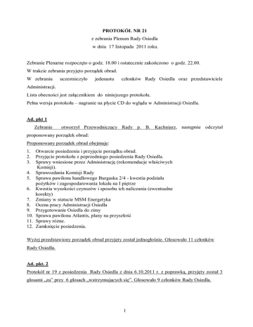 PROTOKÓŁ NR 21 z zebrania Plenum Rady Osiedla w dniu 17 listopada 2011 roku. Zebranie Plenarne rozpoczęto o godz. 18.00 i ostatecznie zakończono o godz. 22.00. W trakcie zebrania przyjęto porządek obrad. W zebraniu uczestniczyło jedenastu członków Rady Osiedla oraz przedstawiciele Administracji. Lista obecności jest załącznikiem do niniejszego protokołu. Pełna wersja protokołu – nagranie na płycie CD do wglądu w Administracji Osiedla. Ad. pkt 1 Zebranie otworzył Przewodniczący Rady p. B. Kachniarz, następnie odczytał proponowany porządek obrad: Proponowany porządek obrad obejmuje: 1. 2. 3. Otwarcie posiedzenia i przyjęcie porządku obrad. Przyjęcie protokołu z poprzedniego posiedzenia Rady Osiedla. Sprawy wniesione przez Administrację (rekomendacje właściwych Komisji). 4. Sprawozdania Komisji Rady 5. Sprawa pawilonu handlowego Burgaska 2/4 - kwestia podziału pożytków i zagospodarowania lokalu na I piętrze 6. Kwestia wysokości czynszów i sposobu ich naliczania (ewentualne korekty) 7. Zmiany w statucie MSM Energetyka 8. Ocena pracy Administracji Osiedla 9. Przygotowanie Osiedla do zimy 10. Sprawa pawilonu Atlantis, plany na przyszłość 11. Sprawy różne. 12. Zamknięcie posiedzenia. Wyżej przedstawiony porządek obrad przyjęty został jednogłośnie. Głosowało 11 członków Rady Osiedla. Ad. pkt. 2 Protokół nr 19 z posiedzenia Rady Osiedla z dnia 6.10.2011 r. z poprawką, przyjęty został 3 głosami „za” przy 6 głosach „wstrzymujących się”. Głosowało 9 członków Rady Osiedla. 1 Protokół nr 20 z posiedzenia Rady Osiedla z dnia 27.10.2011 r., z wniesionymi przez p. J. Grzebielec uwagami, przyjęty został 8 głosami „za” przy 1 głosie „wstrzymującym się”. Głosowało 9 członków Rady Osiedla. Ad. pkt. 3 W związku z kończącymi się umowami dzierżawy na bazarku Kierownik Administracji p. M. Zdanowski poprosił o opinię w/s ich przedłużenia, jednocześnie wyrażając swoją negatywną opinię na temat stoiska p. Ewy Wędołowskiej, handlującej galanterią skóropodobną i kapciami. Członkowie Rady zaakceptowali opinię p. M. Zdanowskiego, pozostałym dzierżawcom, tj. 1/ Łysiak Małgorzata i Wiesław stoisko owocowo-warzywne 2/ Opaliński Karol stoisko owocowo-warzywne 3/ Woźniak Urszula stoisko owocowo-warzywne 4/ Nowosielski Zbigniew stoisko owocowo-warzywne 5/ Muracka Dorota stoisko owocowo-warzywne 6/ Nogal Bronisław stoisko owocowo-warzywne 7/ Skrzypczak Irena stoisko przemysłowe 8/ Pawluk Daniel stoisko przemysłowe Rada Osiedla pozytywnie zaopiniowała przedłużenie umów dzierżawy na 2012 rok. Pani M. Kulczycka-Lipka przypomniała, że Komisja S-E w 2010 r. przedłużyła umowy dzierżawne na bazarku tylko do 31 grudnia 2011, po to, aby ujednolicić je pod względem wysokości czynszów i okresu trwania. W dyskusji na temat ujednolicenia stawek dzierżawnych dla stoisk warzywno-owocowych i przemysłowych członkowie Rady nie byli jednomyślni. W związku z powyższym Przewodniczący Rady zarządził głosowanie: „za” ujednoliceniem stawek głosowało 6 członków Rady, „przeciw” ujednoliceniu stawek głosowało 5 członków Rady. Głosowało 11 członków Rady. Dla funkcjonujących na bazarku stoisk handlowych Rada Osiedla ustaliła stawki dzierżawne obowiązujące od dnia 1 stycznia 2012 r. , jak niżej: dla stoisk warzywno-owocowych 40 zł/m² netto/miesięcznie w okresie całorocznym, wynik głosowania: 2 „za” – głosowało 10 członków Rady, „wstrzymujących się” – 1 członek Rady. Głosowało 11 członków Rady dla stoisk przemysłowych 40 zł/m² netto/miesięcznie w okresie całorocznym, wynik głosowania: „za” – głosowało 10 członków Rady, „wstrzymujących się” – 1 członek Rady. Głosowało 11 członków Rady W kwestii utrzymania ulgi zimowej w czynszu dla dzierżawców bazarku członkowie Rady wyrazili odmienne zdania, wobec czego Przewodniczący Rady poprosił o głosowanie. Na podstawie wyniku głosowania „za” 9 głosów, „przeciw” 2 głosy, Rada Osiedla ustaliła, że dla stoisk owocowo-warzywnych i przemysłowych utrzymana zostaje 50% ulga w czynszu w okresie od 1 grudnia do 28/29 lutego. dla mobilnych stoisk handlowych 80 zł/m² netto/miesięcznie w okresie całorocznym, bez ulgi zimowej, wynik głosowania: „za” – głosowało 11 członków Rady, dla handlu sezonowego 80 zł/m² netto w okresie od kwietnia do września, wynik głosowania: „za” – głosowało 11 członków Rady, stawka handlowa (dla handlu dorywczego) dzienna 10 zł/m² netto, nie mniej niż 20 zł netto dziennie. wynik głosowania: „za” – głosowało 10 członków Rady. „wstrzymujących się” – 1 członek Rady. Poniżej projekt uchwały: UCHWAŁA NR 18/2011 Rady Osiedla „Stegny - Rożek” z dnia 17.11.2011 r. w sprawie: określenia bazowych stawek czynszu za dzierżawę gruntów na Osiedlu „Stegny Rożek” 3 na podstawie § 97 pkt 1 ppkt 1 Statutu MSM „Energetyka” wpisanego do KRS w dniu 15 września 2008 r. , Rada Osiedla „Stegny Rożek” uchwala, co następuje: §1 ustala się stawkę bazową czynszu za dzierżawę gruntów położonych na obszarze Osiedla „Stegny Rożek”, wg celów na jakie zostały wydzierżawione, zgodnie z załącznikiem nr 1 do niniejszej uchwały. §2 Bez zgody Wydzierżawiajacego, Dzierżawca nie może oddawać przedmiotu dzierżawy osobie trzeciej do bezpłatnego użytkowania, ani podnajmować postawiony na dzierżawionym terenie punkt mobilny. §3 Rada Osiedla zobowiązuje Kierownika Administracji Osiedla do realizacji uchwały. §4 Uchwała wchodzi w życie z dniem 01 stycznia 2012 roku. §5 Traci moc uchwała nr 5 Rady Osiedla „Stegny Rożek” z dnia 27.08.2009 roku. Sekretarz Rady Osiedla Przewodniczący Rady Osiedla Bartłomiej Kachniarz Jakub Grzebielec Załącznik Nr 1 do uchwały nr 18 Rady Osiedla z dnia 17 listopada 2011 roku WYKAZ Stawek bazowych za dzierżawę gruntów położonych na tere