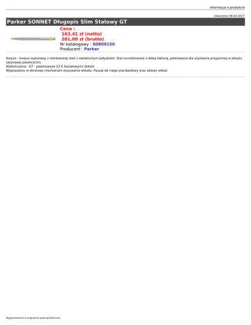 Informacje o produkcie Utworzono 08-03-2017 Parker SONNET Długopis Slim Stalowy GT Cena : 163,41 zł (netto) 201,00 zł (brutto) Nr katalogowy : S0809150 Producent : Parker Korpus - korpus wykonany z nierdzewnej stali z metalicznym połyskiem. Stal szczotkowana z lekką fakturą, polerowana dla uzyskania przyjemnej w dotyku satynowej powierzchni. Wykończenia - GT - platerowane 23 K (karatowym) złotem Wyposażony w obrotowy mechanizm wysuwania wkładu. Pasuje do niego standardowy oraz żelowy wkład. Wygenerowano w programie www.oscGold.com