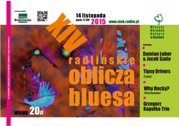 Patronat medialny: 14 listopada godz.17.00 2015 www.mok.radlin.pl 44-310 Radlin, ul.Mariacka 9, Tel.32 4568928, 4568633, e-mail: [email protected] V XI radlińskie wstęp 20zł oblicza bluesa Miejski Ośrodek Kultury w Radlinie wystąpią: Damian Luber & Jacek Szuła Tipsy Drivers /Łódź/ Why Ducky? /Ciechanów/ Grzegorz Kapołka Trio