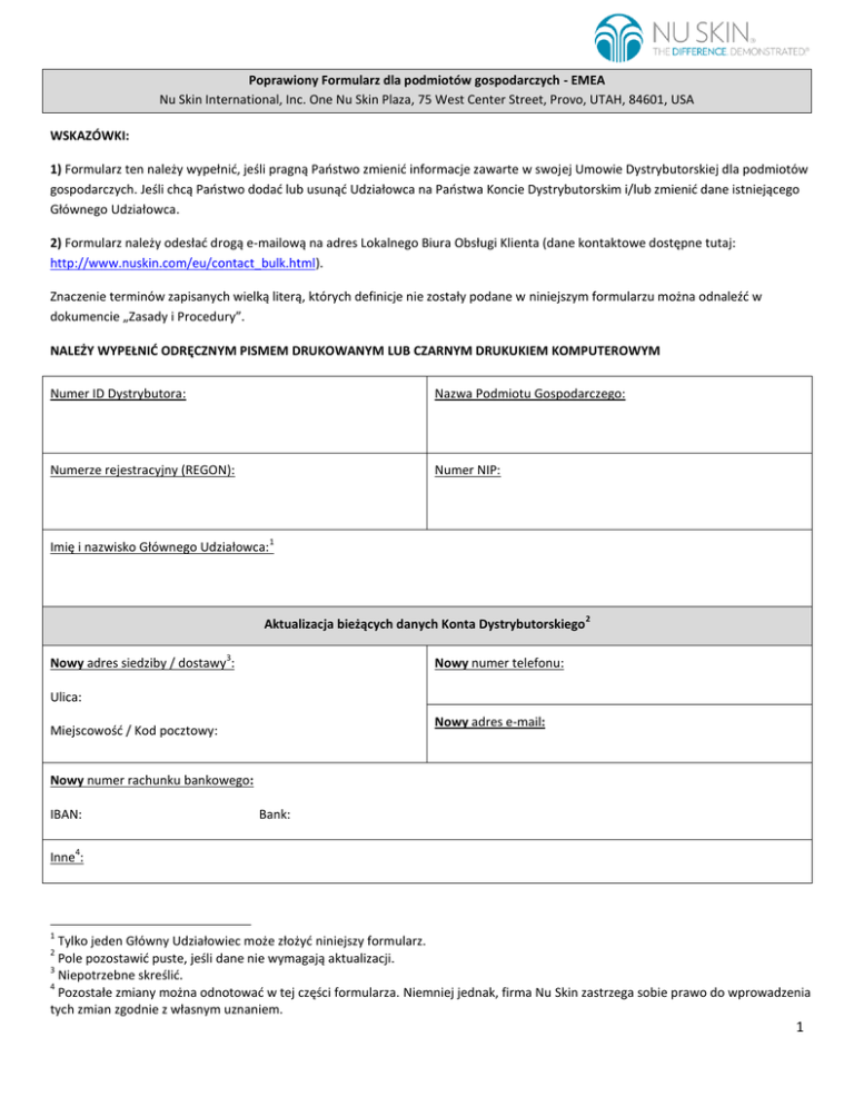 Poprawiony Formularz dla podmiotów gospodarczych - EMEA Nu Skin International, Inc. One Nu Skin Plaza, 75 West Center Street, Provo, UTAH, 84601, USA WSKAZÓWKI: 1) Formularz ten należy wypełnić, jeśli pragną Państwo zmienić informacje zawarte w swojej Umowie Dystrybutorskiej dla podmiotów gospodarczych. Jeśli chcą Państwo dodać lub usunąć Udziałowca na Państwa Koncie Dystrybutorskim i/lub zmienić dane istniejącego Głównego Udziałowca. 2) Formularz należy odesłać drogą e-mailową na adres Lokalnego Biura Obsługi Klienta (dane kontaktowe dostępne tutaj: http://www.nuskin.com/eu/contact_bulk.html). Znaczenie terminów zapisanych wielką literą, których definicje nie zostały podane w niniejszym formularzu można odnaleźć w dokumencie „Zasady i Procedury”. NALEŻY WYPEŁNIĆ ODRĘCZNYM PISMEM DRUKOWANYM LUB CZARNYM DRUKUKIEM KOMPUTEROWYM Numer ID Dystrybutora: Nazwa Podmiotu Gospodarczego: Numerze rejestracyjny (REGON): Numer NIP: Imię i nazwisko Głównego Udziałowca: 1 Aktualizacja bieżących danych Konta Dystrybutorskiego 3 Nowy adres siedziby / dostawy : 2 Nowy numer telefonu: Ulica: Nowy adres e-mail: Miejscowość / Kod pocztowy: Nowy numer rachunku bankowego: IBAN: Bank: 4 Inne : 1 Tylko jeden Główny Udziałowiec może złożyć niniejszy formularz. Pole pozostawić puste, jeśli dane nie wymagają aktualizacji. 3 Niepotrzebne skreślić. 4 Pozostałe zmiany można odnotować w tej części formularza. Niemniej jednak, firma Nu Skin zastrzega sobie prawo do wprowadzenia tych zmian zgodnie z własnym uznaniem. 2 1 Zmiana danych Głównego Udziałowca Imię i nazwisko bieżącego Głównego Udziałowca Imię i nazwisko nowego Głównego Udziałowca Podpis Podpis 5 Inny udziałowiec (imię i nazwisko oraz podpis) 6 Inny udziałowiec (imię i nazwisko oraz podpis) Inny udziałowiec (imię i nazwisko oraz podpis) Inny udziałowiec (imię i nazwisko oraz podpis) Usuwanie Udziałowca 7 Imię i nazwisko Podpis Imię i nazwisko Podpis Imię i nazwisko Podpis Dodawanie Udziałowca 8 Imię i nazwisko Kompetencje / Tytuł Podpis Imię i nazwisko Kompetencje / Tytuł Podpis Imię i nazwisko Kompetencje / Tytuł Podpis Podpis Głównego Udziałowca:____________________________________ Podpisując niniejszy formularz, Główny Udziałowiec potwierdza, że podane informacje są aktualne i precyzyjne. 5 Podpis nowego Głównego Udziałowca. Wszyscy pozostali Udziałowcy wyszczególnieni w dokumentach Nu Skin muszą podpisać niniejszy formularz, aby mianować nowego Głównego Udziałowca. 7 Podpis Udziałowca, który nie chce dłużej widnieć na Koncie Dystrybutorskim Nu Skin. 8 Podpisując niniejszy formularz, nowy Udziałowiec potwierdzam, że zapoznałem/-am się z postanowieniami dokumentu „Zasady i Procedury”, Planu Kompensacyjnego Sprzedaż i Umowy Dystrybutorskiej i wyrażam zgodę na ich przestrzeganie. Dokumenty te można uzyskać od Głównego Udziałowca lub pobrać w wersji online ze strony: www.nuskin.com. 6 2