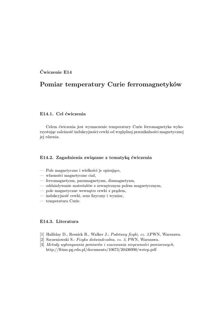 Ćwiczenie E14 Pomiar temperatury Curie ferromagnetyków E14.1. Cel ćwiczenia Celem ćwiczenia jest wyznaczenie temperatury Curie ferromagnetyka wykorzystując zależność indukcyjności cewki od względnej przenikalności magnetycznej jej rdzenia. E14.2. Zagadnienia związane z tematyką ćwiczenia — — — — — — — Pole magnetyczne i wielkości je opisujące, własności magnetyczne ciał, ferromagnetyzm, paramagnetyzm, diamagnetyzm, oddziaływanie materiałów z zewnętrznym polem magnetycznym, pole magnetyczne wewnątrz cewki z prądem, indukcyjność cewki, sens fizyczny i wymiar, temperatura Curie. E14.3. Literatura [1] Halliday D., Resnick R., Walker J.: Podstawy fizyki, cz. 3,PWN, Warszawa. [2] Szczeniowski S.: Fizyka doświadczalna, cz. 3, PWN, Warszawa. [3] Metody wykonywania pomiarów i szacowania niepewności pomiarowych, http://ftims.pg.edu.pl/documents/10673/20436990/wstep.pdf 122 Ćwiczenie E14 E14.4. Przebieg ćwiczenia i zadania do wykonania Układ doświadczalny Rysunek E14.1 przedstawia schemat układu pomiarowego, zaś rysunek E14.2 zdjęcie układu z zaznaczonymi podstawowymi elementami: F – pręt ferromagnetyczny, G – grzałka, Z – zasilacz regulujący napięcie pracy grzałki, T – termopara typu chromel-alumel, MT – miernik temperatury, C – cewka, ML – miernik do pomiaru indukcyjności cewki. Rysunek E14.1. Schemat układu pomiarowego Przebieg doświadczenia Indukcyjność cewki L zależy m.in. od względnej przenikalności magnetycznej jej rdzenia, dlatego też doświadczenie polega na pomiarze miernikiem ML indukcyjności cewki C w funkcji temperatury pręta F. Otrzymujemy w ten sposób pośrednio informację o zmianach przenikalności magnetycznej ferromagnetycznego rdzenia i na tej podstawie wyznaczamy temperaturę Curie, Tc . 1. Włączyć mierniki MT i ML dobierając odpowiednie zakresy, tak aby pomiar temperatury i indukcyjności rdzenia przebiegał z możliwie największą precyzją; 2. Rozpocząć grzanie rdzenia poprzez włączenie zasilacza i ustawienie wartości natężenia prądu płynącego przez grzałkę na poziomie 0,55 A (maksymalny prąd zasilacza); 3. Ogrzewając rdzeń: do temperatury 130◦ C należy notować wskazania miernika ML co 10◦ C, w przedziale temperatur 130◦ C – 180◦ C co 2◦ C; Pomiar temperatury Curie ferromagnetyków 123 Rysunek E14.2. Zdjęcie układu pomiarowego 4. Po osiągnięciu przez rdzeń temperatury 180◦ C należy rozpocząć powolne jego chłodzenie poprzez stopniowe zmniejszanie prądu grzałki, zaczynając od wartości 0,5 A co około 0,05 A; 5. Chłodząc rdzeń: w przedziale temperatur 180◦ C – 130◦ C należy notować wskazania miernika ML co 2◦ , a następnie do 100◦ C co 10◦ C; 6. Po osiągnięciu przez rdzeń temperatury 100◦ C należy wyłączyć grzałkę oraz mierniki MT i ML ; 7. Wykreślić zależności L (T ) otrzymane przy grzaniu i przy chłodzeniu pręta na jednym wykresie. Zadania do wykonania E14.1. Wyznaczyć temperaturę Curie ferromagnetyka, z którego wykonany jest rdzeń cewki. Uzupełnienie do zadania E14.1 Wykreślając zależności L (T ) otrzymane przy grzaniu i przy chłodzeniu pręta (na jednym wykresie) należy zwrócić uwagę na dwie kwestie. Ze względu na istnienie pewnej pojemności i skończonej przewodności cieplnej badanego pręta podczas grzania powierzchniowe warstwy osiągają temperaturę Tc szybciej niż 124 Ćwiczenie E14 wewnętrzne. Z tego powodu obserwowana zmiana właściwości magnetycznych nie następuje w dokładnie określonej temperaturze, lecz w pewnym zakresie temperatur. Ponadto, sposób pomiaru temperatury (termopara wskazuje temperaturę powierzchniowych warstw pręta i to leżących poza obszarem cewki) sprawia, że na wykresie L (T ) obserwujemy pewną histerezę, czyli „przesunięcie” danych uzyskanych podczas grzania i chłodzenia pręta. W takim przypadku wartość Tc należy wyznaczyć aproksymując liniowymi zależnościami (graficznie lub metodą najmniejszych kwadratów) fragmenty funkcji L (T ) dla temperatur niższych od Tc oraz dla temperatur wyższych od Tc . Punkt przecięcia tych dwóch prostych wyznacza Tc. Natomiast ze względu na histerezę przebiegu L (T ) w rezultacie otrzymujemy dwa wyniki: Tc1 (przy ogrzewaniu pręta) i Tc2 (przy chłodzeniu pręta). W przypadku, gdy szybkość grzania i chłodzenia jest podobna i stosunkowo mała, temperatura Curie badanego ferromagnetyka jest średnią arytmetyczną obu wyników. E14.5. Rachunek niepewności Niepewność pomiaru L i T oceniamy w czasie wykonywania pomiarów na podstawie zakresu i klasy użytych urządzeń pomiarowych. Wyznaczone wartości nanosimy odpowiednio na wykres. Niepewność pomiaru temperatury Curie szacujemy jako połowę różnicy wartości Tc1 i Tc2 .