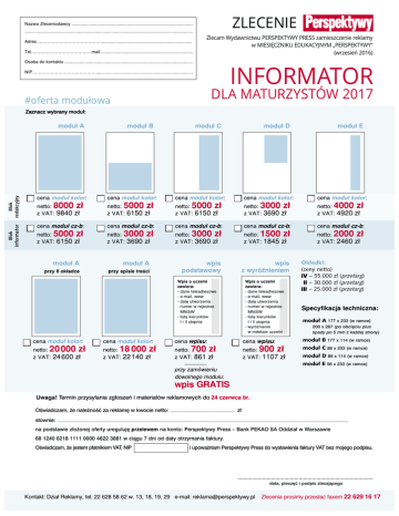 ZLECENIE Nazwa Zleceniodawcy ................................................................................................. ...................................................................................................................................... Zlecam Wydawnictwu PERSPEKTYWY PRESS zamieszczenie reklamy w MIESIĘCZNIKU EDUKACYJNYM „PERSPEKTYWY” (wrzesień 2016) Adres ……………………………………........................................................................ Tel………………………………….mail.......................................................................... Osoba do kontaktu ...................................................................................................... INFORMATOR NIP……………………………………............................................................................. DLA MATURZYSTÓW 2017 #oferta modułowa Zaznacz wybrany moduł: Blok informator Blok redakcyjny moduł A cena moduł kolor: netto: 8000 zł z VAT: 9840 zł moduł B cena moduł kolor: netto: 5000 zł z VAT: 6150 zł moduł E moduł D moduł C cena moduł kolor: cena moduł kolor: cena moduł kolor: netto: 5000 zł z VAT: 6150 zł netto: 3000 zł z VAT: 3690 zł netto: 4000 zł z VAT: 4920 zł cena moduł cz-b: cena moduł cz-b: cena moduł cz-b: cena moduł cz-b: cena moduł cz-b: netto: 5000 zł z VAT: 6150 zł netto: 3000 zł z VAT: 3690 zł netto: 3000 zł z VAT: 3690 zł netto: 1500 zł z VAT: 1845 zł netto: 2000 zł z VAT: 2460 zł wpis podstawowy wpis z wyróżnieniem Okładki: (ceny netto) IV – 55.000 zł (przetarg) II – 30.000 zł (przetarg) III – 25.000 zł (przetarg) moduł A moduł A przy II okładce przy spisie treści Wpis o uczelni zawiera: - dane teleadresowe - e-mail, www - datę utworzenia - numer w rejestrze MNiSW - listę kierunków I i II stopnia cena moduł kolor: cena moduł kolor: cena wpisu: netto: 20 000 zł z VAT: 24 600 zł netto: 18 000 zł z VAT: 22 140 zł netto: 700 z VAT: 861 Wpis o uczelni zawiera: - dane teleadresowe - e-mail, www - datę utworzenia - numer w rejestrze MNiSW - listę kierunków I i II stopnia - wyróżnienie w indeksie uczelni cena wpisu: zł netto: 900 zł z VAT: 1107 zł zł Specyfikacja techniczna: moduł A 177 x 233 (w ramce) 200 x 267 (po obcięciu plus spady po 5 mm z każdej strony) moduł B 177 x 114 (w ramce) moduł C 86 x 233 (w ramce) moduł D 86 x 114 (w ramce) moduł E 56 x 233 (w ramce) przy zamówieniu dowolnego modułu: wpis GRATIS Uwaga! Termin przysyłania zgłoszeń i materiałów reklamowych do 24 czerwca br. Oświadczam, że należność za reklamę w kwocie netto: ............................................................. zł słownie: ................................................................................................................................................................................................................................................................................. na podstawie złożonej oferty ureguluję przelewem na konto: Perspektywy Press – Bank PEKAO SA Oddział w Warszawie 68 1240 6218 1111 0000 4622 3881 w ciągu 7 dni od daty otrzymania faktury. Oświadczam, że jestem płatnikiem VAT, NIP i upoważniam Perspektywy Press do wystawienia faktury VAT bez mojego podpisu. ............................................................................................. data, pieczęć i podpis zlecającego Kontakt: Dział Reklamy, tel. 22 628 58 62 w. 13, 18, 19, 29 e-mail: [email protected] Zlecenia prosimy przesłać faxem 22 629 16 17 ZLECENIE Nazwa Zleceniodawcy ................................................................................................. ...................................................................................................................................... Adres ……………………………………........................................................................ Zlecam Wydawnictwu PERSPEKTYWY PRESS zamieszczenie reklamy PAKIETOWEJ w publikacjach „PERSPEKTYWY” Tel………………………………….mail.......................................................................... Osoba do kontaktu ...................................................................................................... NIP……………………………………............................................................................. INFORMATOR DLA MATURZYSTÓW 2017 cena netto: PAKIET SUPER UCZELNIA #1 #2 10 000 zł #3 DRUK INTERNET APLIKACJA Informator dla Maturzystów 2017 perspektywy.pl Informator dla Maturzystów 2017 Całostronicowa prezentacja Uczelni w Informatorze dla Maturzystów 2017 (część redakcyjna) Prezentacja Uczelni (ten sam tekst) w serwisie Studia — Kierunki — Uczelnie na portalu Perspektywy.pl: wizytówka w postaci baneru — logo, nazwa uczelni (aktywność przez12 miesięcy) Podświetlenie nazwy Uczelni w aplikacji Informator dla Maturzystów 2017 (aktywność przez 12 miesięcy) PAKIET SUPER KIERUNEK #1 #2 4000 zł #3 DRUK INTERNET APLIKACJA Informator dla Maturzystów 2017 perspektywy.pl Informator dla Maturzystów 2017 Całostronicowa prezentacja kierunku w Informatorze dla Maturzystów 2017 (część redakcyjna) Prezentacja kierunku (ten sam tekst) w serwisie Studia — Kierunki — Uczelnie na portalu Perspektywy.pl: wizytówka w postaci baneru — logo, nazwa uczelni (aktywność przez 12 miesięcy) Podświetlenie nazwy Uczelni przy wybranym kierunku w aplikacji Informator dla Maturzystów 2017 (aktywność przez 12 miesięcy) Uwaga! Termin przysyłania zgłoszeń i materiałów reklamowych do 24 czerwca br. Oświadczam, że należność za reklamę w kwocie netto: ............................................................. zł słownie: ................................................................................................................................................................................................