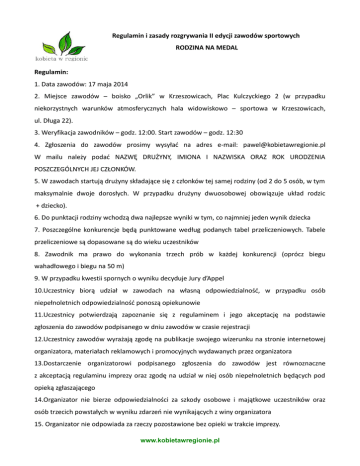 Regulamin i zasady rozgrywania II edycji zawodów sportowych RODZINA NA MEDAL Regulamin: 1. Data zawodów: 17 maja 2014 2. Miejsce zawodów – boisko „Orlik” w Krzeszowicach, Plac Kulczyckiego 2 (w przypadku niekorzystnych warunków atmosferycznych hala widowiskowo – sportowa w Krzeszowicach, ul. Długa 22). 3. Weryfikacja zawodników – godz. 12:00. Start zawodów – godz. 12:30 4. Zgłoszenia do zawodów prosimy wysyłać na adres e-mail: [email protected] W mailu należy podać NAZWĘ DRUŻYNY, IMIONA I NAZWISKA ORAZ ROK URODZENIA POSZCZEGÓLNYCH JEJ CZŁONKÓW. 5. W zawodach startują drużyny składające się z członków tej samej rodziny (od 2 do 5 osób, w tym maksymalnie dwoje dorosłych. W przypadku drużyny dwuosobowej obowiązuje układ rodzic + dziecko). 6. Do punktacji rodziny wchodzą dwa najlepsze wyniki w tym, co najmniej jeden wynik dziecka 7. Poszczególne konkurencje będą punktowane według podanych tabel przeliczeniowych. Tabele przeliczeniowe są dopasowane są do wieku uczestników 8. Zawodnik ma prawo do wykonania trzech prób w każdej konkurencji (oprócz biegu wahadłowego i biegu na 50 m) 9. W przypadku kwestii spornych o wyniku decyduje Jury d’Appel 10.Uczestnicy biorą udział w zawodach na własną odpowiedzialność, w przypadku osób niepełnoletnich odpowiedzialność ponoszą opiekunowie 11.Uczestnicy potwierdzają zapoznanie się z regulaminem i jego akceptację na podstawie zgłoszenia do zawodów podpisanego w dniu zawodów w czasie rejestracji 12.Uczestnicy zawodów wyrażają zgodę na publikacje swojego wizerunku na stronie internetowej organizatora, materiałach reklamowych i promocyjnych wydawanych przez organizatora 13.Dostarczenie organizatorowi podpisanego zgłoszenia do zawodów jest równoznaczne z akceptacją regulaminu imprezy oraz zgodę na udział w niej osób niepełnoletnich będących pod opieką zgłaszającego 14.Organizator nie bierze odpowiedzialności za szkody osobowe i majątkowe uczestników oraz osób trzecich powstałych w wyniku zdarzeń nie wynikających z winy organizatora 15. Organizator nie odpowiada za rzeczy pozostawione bez opieki w trakcie imprezy. www.kobietawregionie.pl Zasady rozegrania zawodów: 1. Zawody przeprowadzone zostaną w formie rodzinnego wieloboju sprawnościowego. 2. Po dokonaniu weryfikacji każda drużyna otrzymuje kartę startową. 3. Rodziny startują w każdej z pięciu konkurencji w dowolnej kolejności (oprócz biegu na 50 m, który rozgrywany jest na zakończenie zawodów). 4. Każda konkurencja ma obsługę sędziowską, która będzie również informować o sposobie wykonania danej konkurencji. 5. Zawodnik w danej konkurencji wykonuje trzy próby, a sędzia wpisuje do karty drużyny najlepszy wynik (nie ma obowiązku wykonywania wszystkich prób). 6. Po zakończeniu każdej konkurencji karta rodziny wraca do sędziego liczącego w celu wprowadzenia wyniku. 7. Po zakończeniu wszystkich konkurencji karta pozostaje u sędziego liczącego. 8. Wyniki końcowe obliczane są na podstawie sumy punktów przeliczeniowych dwóch najlepszych wyników łącznych (z 5 konkurencji). W przypadku jednakowej ilości punktów o kolejności decyduje najlepszy wynik w kolejnych konkurencjach : • Bieg na 50 m • Skok w dal z miejsca • Rzut piłką lekarską 2 kg • Siad z leżenia • Wahadło Jeżeli w dalszym ciągu nie zostanie wyłonione wyższe miejsce zostanie ogłoszony wynik ex aequo. Opis konkurencji: 1. Bieg prosty 50 m. Zawodnik ze startu wysokiego pokonuje dystans 50 m. Pomiar czasu ręczny z dokładnością do 0,1 sekundy. 2. Skok w dal z miejsca. Zawodnik wykonuje jak najdłuższy skok z miejsca. Nie ma możliwości nabiegu czy naskoku. Skok podparty lub upadek jest powtarzany bez pomiaru. Odległość mierzona do miejsca kontaktu pięty z podłożem. 3. Rzut piłką lekarską 2 kg (dzieci poniżej 8 roku życia wykonują rzut piłką lekarską 1 kg). Zawodnik ustawiony tyłem do kierunku rzutu wykonuje rzut z miejsca piłką lekarską o wadze 2 kg. Przekroczenie linii rzutu „pali” próbę. 4. Siad z leżenia (skłony). Zawodnik leżąc ma skrzyżowane ręce na klatce piersiowej. Na sygnał startu wykonuje jak najszybciej skłony dotykając rękoma (przedramieniem) swoich ud. Pomiędzy www.kobietawregionie.pl skłonami nie może być widocznego zatrzymania. Przy powrocie do pozycji leżąc łopatki muszą dotknąć podłoża. 5. Wahadło 4 x 10 m. Wyznacza się dwie linie w odległości 10 m. Zawodnik przygotowany do startu ma w dłoni przedmiot (klocek drewniany itp.). Na sygnał biegnie do drugiej linii i musi położyć przedmiot za linią, następnie wraca po drugi przedmiot też kładąc go za linią i powrót do linii początkowej. www.kobietawregionie.pl