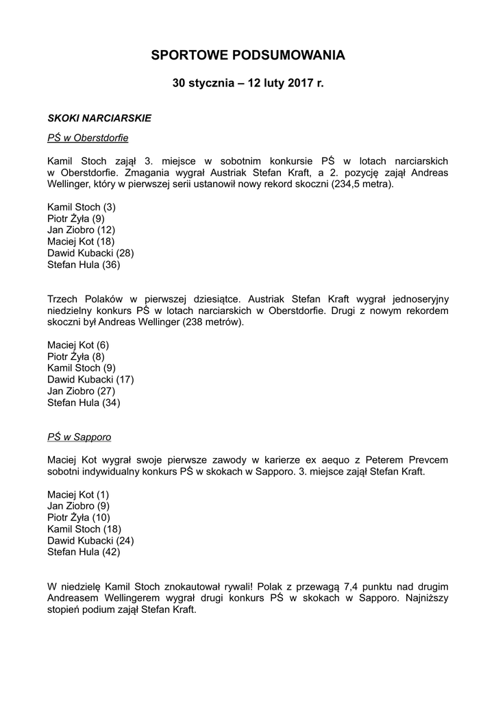 SPORTOWE PODSUMOWANIA 30 stycznia – 12 luty 2017 r. SKOKI NARCIARSKIE PŚ w Oberstdorfie Kamil Stoch zajął 3. miejsce w sobotnim konkursie PŚ w lotach narciarskich w Oberstdorfie. Zmagania wygrał Austriak Stefan Kraft, a 2. pozycję zajął Andreas Wellinger, który w pierwszej serii ustanowił nowy rekord skoczni (234,5 metra). Kamil Stoch (3) Piotr Żyła (9) Jan Ziobro (12) Maciej Kot (18) Dawid Kubacki (28) Stefan Hula (36) Trzech Polaków w pierwszej dziesiątce. Austriak Stefan Kraft wygrał jednoseryjny niedzielny konkurs PŚ w lotach narciarskich w Oberstdorfie. Drugi z nowym rekordem skoczni był Andreas Wellinger (238 metrów). Maciej Kot (6) Piotr Żyła (8) Kamil Stoch (9) Dawid Kubacki (17) Jan Ziobro (27) Stefan Hula (34) PŚ w Sapporo Maciej Kot wygrał swoje pierwsze zawody w karierze ex aequo z Peterem Prevcem sobotni indywidualny konkurs PŚ w skokach w Sapporo. 3. miejsce zajął Stefan Kraft. Maciej Kot (1) Jan Ziobro (9) Piotr Żyła (10) Kamil Stoch (18) Dawid Kubacki (24) Stefan Hula (42) W niedzielę Kamil Stoch znokautował rywali! Polak z przewagą 7,4 punktu nad drugim Andreasem Wellingerem wygrał drugi konkurs PŚ w skokach w Sapporo. Najniższy stopień podium zajął Stefan Kraft. Kamil Stoch (1) Maciej Kot (4) Piotr Żyła (12) Stefan Hula (33) Dawid Kubacki (35) Jan Ziobro (39) PIŁKA RĘCZNA Liga Mistrzów Bogdan Radivojević i Kevin Moeller wybili płocczanom z głowy nadzieję na kolejne zwycięstwo z europejskim potentatem. W 10. kolejce Ligi Mistrzów SG FlensburgHandewitt pokonał Orlen Wisłę Płock 37:30 (16:18). W 10. kolejce Ligi Mistrzów i pierwszym meczu w europejskich pucharach w 2017 roku piłkarze ręczni Vive Tauronu Kielce przegrali na wyjeździe z Rhein-Neckar Loewen 25:28 (16:13). Wyniki zespołów z Lubelszczyzny: piłka ręczna MKS Selgros Lublin – KPR Jelenia Góra 39:22 (21:13) Korona Handball Kielce – MKS Selgros Lublin 26:30 (14:16) MKS Selgros Lublin – KPR Kobierzyce 35:12 (17:5) koszykówka Start Lublin – Miasto Szkła Krosno 68:63 Polpharma Starogard Gdański – Start Lublin 85:70 Energa Czarni Słupsk – Start Lublin 89:58 Źródła: sport.pl sportowefakty.wp.pl mks.lublin.pl azoty-pulawy.pl
