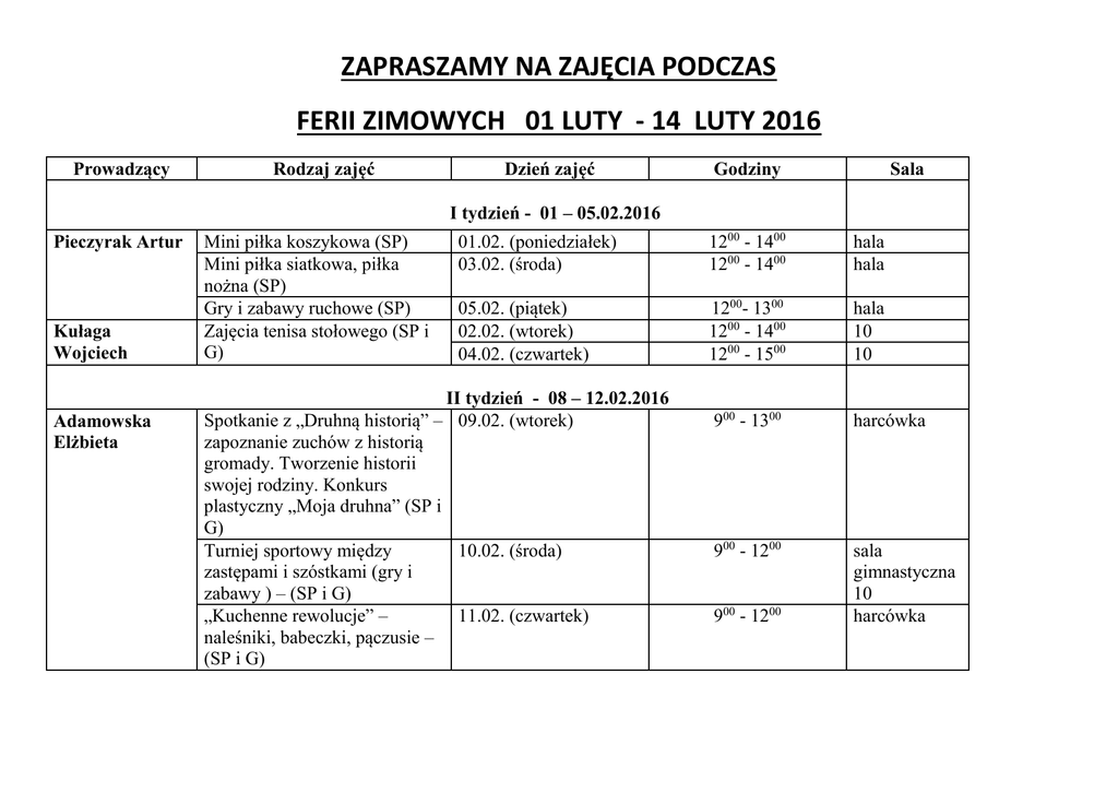 ZAPRASZAMY NA ZAJĘCIA PODCZAS FERII ZIMOWYCH 01 LUTY - 14 LUTY 2016 Prowadzący Rodzaj zajęć Dzień zajęć Godziny Sala I tydzień - 01 – 05.02.2016 Pieczyrak Artur Kułaga Wojciech Adamowska Elżbieta Mini piłka koszykowa (SP) Mini piłka siatkowa, piłka nożna (SP) Gry i zabawy ruchowe (SP) Zajęcia tenisa stołowego (SP i G) 01.02. (poniedziałek) 03.02. (środa) 1200 - 1400 1200 - 1400 hala hala 05.02. (piątek) 02.02. (wtorek) 04.02. (czwartek) 1200- 1300 1200 - 1400 1200 - 1500 hala 10 10 900 - 1300 harcówka 900 - 1200 sala gimnastyczna 10 harcówka II tydzień - 08 – 12.02.2016 Spotkanie z „Druhną historią” – 09.02. (wtorek) zapoznanie zuchów z historią gromady. Tworzenie historii swojej rodziny. Konkurs plastyczny „Moja druhna” (SP i G) Turniej sportowy między 10.02. (środa) zastępami i szóstkami (gry i zabawy ) – (SP i G) „Kuchenne rewolucje” – 11.02. (czwartek) naleśniki, babeczki, pączusie – (SP i G) 900 - 1200