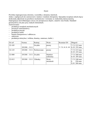 Hynit Powłoka impregnowana nitrylem, wyściółka z dzianiny interlock. Jedne z najlepszych do zastosowań o małym i średnim obciążeniu. Specjalna receptura nitrylu łączy doskonałą odporność na przebicie mechaniczne i ścieranie ze znakomitą elastycznością. Impregnacja niewchłaniająca cieczy nie przepuszcza olejów, smarów oraz brudu. Standard przemysłowy do prac przy małych elementach. Zastosowanie: – produkcja urządzeń mechanicznych – przemysł samochodowy – produkcja puszek – produkcja mebli – branża transportowa i odbiorcza – stalownie – produkcja tekstylna ( włókna, tkaniny, materace, kable ) Nr ref Norma 32-105 Rodzaj Wzór Rozmiar EN Zwykłe prosty 7-7,5 215 mm 7; 7,5; 8; 9; 10 8-10 235 mm EN388 – 3111 Długość 32-125 EN388 – 3111 Perforowane prosty 7-7,5 215 mm 8-10 235 mm 32-800 EN388 – 3111 Zwykłe Mankiet ochronny 7-7,5 260 mm 8-10 295 mm 32-815 EN388 – 3111 Chłodny Wzór strzelecki 7-7,5 240 mm 8 250 mm 9,10 260 mm