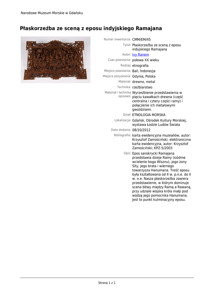 Narodowe Muzeum Morskie w Gdańsku Płaskorzeźba ze sceną z eposu indyjskiego Ramajana Numer inwentarza: CMM/EM/45 Tytuł: Płaskorzeźba ze sceną z eposu indyjskiego Ramajana Autor: Ivy Ranem Czas powstania: połowa XX wieku Rodzaj: etnografia Miejsce powstania: Bali, Indonezja Miejsce pozyskania: Gdynia, Polska Materiał: drewno, metal Technika: rzeźbiarstwo Materiał i technika Wyrzeźbienie przedstawienia w opisowo: pięciu kawałkach drewna (część centralna i cztery części ramy) i połączenie ich metalowymi gwoździami. Dział: ETNOLOGIA MORSKA Lokalizacja: Gdańsk, Ośrodek Kultury Morskiej, wystawa Łodzie Ludów Świata Data dodania: 08/10/2012 Bibliografia: karta ewidencyjna muzealiów, autor: Krzysztof Zamościński; elektroniczna karta ewidencyjna, autor: Krzysztof Zamościński; KPZ-5/2003 Opis: Epos sanskrycki Ramajana przedstawia dzieje Ramy (siódme wcielenie boga Wisznu), jego żony Sity, jego brata i wiernego towarzysza Hanumana. Treść eposu była kształtowana od II w. p.n.e. do II w. n.e. Nasza płaskorzeźba zawiera przedstawienie, w którym dominuje scena bitwy między Ramą a Rawaną, przy udziale wojska króla małp pod wodzą jego pomocnika Hanumana. Jest to punkt kulminacyjny eposu. Strona 1 z 1