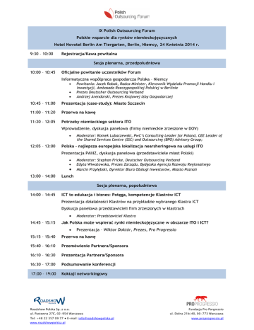 IX Polish Outsourcing Forum Polskie wsparcie dla rynków niemieckojęzycznych Hotel Novotel Berlin Am Tiergarten, Berlin, Niemcy, 24 Kwietnia 2014 r. 9:30 – 10:00 Rejestracja/Kawa powitalna Sesja plenarna, przedpołudniowa 10:00 – 10:45 Oficjalne powitanie uczestników Forum Informatyczna współpraca gospodarcza Polska – Niemcy • • • Powitania: Jacek Robak, Radca-Minister, Kierownik Wydziału Promocji Handlu i Inwestycji, Ambasada Rzeczypospolitej Polskiej w Berlinie Prezes Deutscher Outsourcing Verband Andrzej Arendarski, Prezes Krajowej Izby Gospodarczej 10:45 – 11:00 Prezentacja (case-study): Miasto Szczecin 11:00 – 11:20 Przerwa na kawę 11:20 – 12:05 Potrzeby niemieckiego sektora ITO Wprowadzenie, dyskusja panelowa (firmy niemieckie zrzeszone w DOV) • 12:05 – 13:00 Moderator: Romek Lubaczewski, PwC’s Consulting Leader for Poland, CEE Leader of the Shared Services Centre (SSC) and Outsourcing (BPO) Advisory Group; Polska - najlepsza europejska lokalizacja nearshoringowa na usługi ITO Prezentacja PAIiIZ, dyskusja panelowa (przedstawiciele miast Polski) • • • 13:00 – 14:00 Moderator: Stephan Fricke, Deutscher Outsourcing Verband Edyta Wiwatowska, Prezes Zarządu, Bydgoska Agencja Rozwoju Regionalnego Marcin Przyłębski, Dyrektor Biura Obsługi Inwestorów, Miasto Poznań Lunch Sesja plenarna, popołudniowa 14:00 – 14:45 ICT to edukacja i biznes: Potęga, kompetencje Klastrów ICT Prezentacja działalności Klastrów na przykładzie wybranego Klastra ICT Dyskusja panelowa przedstawicieli firm zrzeszonych w klastrach • 14:45 – 15:15 Moderator: Przedstawiciel Klastra Jak Polska może wspierać rynki niemieckojęzyczne w obszarze ITO i ICT? • Prezentacja – Wiktor Doktór, Prezes, Pro Progressio 15:15 – 15:40 Przerwa na kawę 15:40 – 16:10 Przemówienie Partnera/Sponsora 16:10 – 16:30 Prezentacja Partnera/Sponsora 16:30 – 17:00 Podsumowanie konferencji 17:00 – 19:00 Koktajl networkingowy Roadshow Polska Sp. z o.o. ul. Pastewna 27C, 02-954 Warszawa Tel: +48 22 357 09 77 ∙ E-mail: [email protected] www.roadshowpolska.pl Fundacja Pro Porgressio ul. Dolna 21b/40, 00-773 Warszawa www.proprogressio.pl