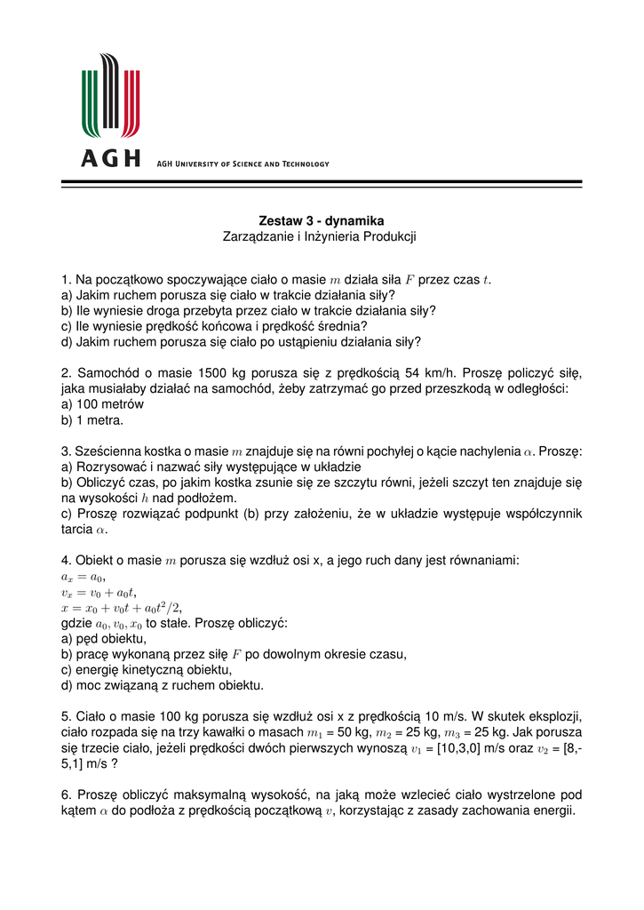 Zestaw 3 - dynamika Zarzadzanie ˛ i Inżynieria Produkcji 1. Na poczatkowo ˛ spoczywajace ˛ ciało o masie m działa siła F przez czas t. a) Jakim ruchem porusza sie˛ ciało w trakcie działania siły? b) Ile wyniesie droga przebyta przez ciało w trakcie działania siły? c) Ile wyniesie predkość ˛ końcowa i predkość ˛ średnia? d) Jakim ruchem porusza sie˛ ciało po ustapieniu ˛ działania siły? 2. Samochód o masie 1500 kg porusza sie˛ z predkości ˛ a˛ 54 km/h. Prosz˛e policzyć siłe, ˛ jaka musiałaby działać na samochód, żeby zatrzymać go przed przeszkoda˛ w odległości: a) 100 metrów b) 1 metra. 3. Sześcienna kostka o masie m znajduje sie˛ na równi pochyłej o kacie ˛ nachylenia α. Prosz˛e: a) Rozrysować i nazwać siły wystepuj ˛ ace ˛ w układzie b) Obliczyć czas, po jakim kostka zsunie sie˛ ze szczytu równi, jeżeli szczyt ten znajduje sie˛ na wysokości h nad podłożem. c) Prosz˛e rozwiazać ˛ podpunkt (b) przy założeniu, że w układzie wystepuje ˛ współczynnik tarcia α. 4. Obiekt o masie m porusza sie˛ wzdłuż osi x, a jego ruch dany jest równaniami: ax = a0 , vx = v0 + a0 t, x = x0 + v0 t + a0 t2 /2, gdzie a0 , v0 , x0 to stałe. Prosz˛e obliczyć: a) ped ˛ obiektu, b) prace˛ wykonana˛ przez siłe˛ F po dowolnym okresie czasu, c) energie˛ kinetyczna˛ obiektu, d) moc zwiazan ˛ a˛ z ruchem obiektu. 5. Ciało o masie 100 kg porusza sie˛ wzdłuż osi x z predkości ˛ a˛ 10 m/s. W skutek eksplozji, ciało rozpada sie˛ na trzy kawałki o masach m1 = 50 kg, m2 = 25 kg, m3 = 25 kg. Jak porusza sie˛ trzecie ciało, jeżeli predkości ˛ dwóch pierwszych wynosza˛ v1 = [10,3,0] m/s oraz v2 = [8,5,1] m/s ? 6. Prosz˛e obliczyć maksymalna˛ wysokość, na jaka˛ może wzlecieć ciało wystrzelone pod katem ˛ α do podłoża z predkości ˛ a˛ poczatkow ˛ a˛ v, korzystajac ˛ z zasady zachowania energii. 7. Obiekt o masie m1 lecacy ˛ z predkości ˛ a˛ v wzdłuż osi poziomej uderza w nieruchomo spoczywajace ˛ ciało o masie m2 w sposób doskonale spreżysty ˛ (ze spełnieniem zasady zachowania energii). Prosz˛e obliczyć predkość ˛ pierwszego obiektu po zderzeniu. 8. Prosz˛e rozwiazać ˛ poprzednie zadanie dla zderzenia doskonale niespreżystego ˛ (obiekty "sklejaja˛ sie" ˛ ze soba˛ po zderzeniu, energia ulega rozproszeniu). 2